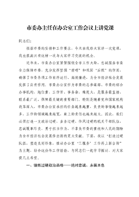 市委办主任在办公室工作会议上讲党课同志们:根据市委的安排和工作要求,今天由我给大家讲一次党课,我也很高兴有这样一次与大家学习交流的机会。近年来,市委办公室紧紧围绕全市工作大局,忠诚服务市委全力保障市委,充分发挥坚强前哨和巩固后院的作用,确保了市委各项工作有序运行、高效推进,为全市经济社会发展发挥了应有作用。市委办公室作为市委的总参谋部、市委的综合办事机构,地位重、工作苦、事务杂、难度大,是服务最直接、联系最广泛、保障最关键的重要部门。特别是随着党和国家机构改革深入,市委办公室承担的任务越来越重,负责的事情越来越多,工作的领域越来越宽,肩上的责任也越来越大。因此,我们必须打造一支政治过硬、业务过硬、作风过硬的机关干部队伍,忠诚履职尽责,勇于担当作为,不辜负市委的重托和人民的期盼为全市经济社会发展作出新的更大贡献。下面,我以打造过硬队伍,塑造良好形象,推动办公室三服务工作再上新台阶为主题,结合这些年工作经验,与同志们一起学习探讨,对大家提几点希望。一、锤炼过硬政治品格——绝对忠诚、永葆本色对党忠诚,是党章对党员的基本要求,是我们面对鲜红党旗宣誓的庄严誓词,XXXXXX对办公厅(室)工作人员提出的五个坚持的要求,第一条就是坚持绝对忠诚的政治品格。XXX指出,对党绝对忠诚是中办的生命线,是做好中办工作的根本点,要把绝对忠诚作为做好中办工作的首要政治原则,作为中办队伍的首要政治本色,作为中办干部的首要政治品质。XXXXXX高屋建瓴地提出生命线根本点并一连用了三个首要,强调绝对忠诚的极端重要性,把绝对忠诚提到了前所未有的高度绝对一词重千钧,绝对忠诚是忠诚的最高境界,是全心全意的忠诚,是言行一致的忠诚,是始终如一的忠诚,是无怨无悔的忠诚。市委办公室必须始终坚持党办姓党,永葆忠诚之心、永怀赤诚之志,体现出绝对忠诚的政治品格、政治本色。绝对忠诚从哪里来?首先,要坚定理想信念。理想信念坚定绝对忠诚才有理性的基础;理想信念动摇,绝对忠诚也就是说说而已,是靠不住的。党的历史上,无数仁人志士汇聚于信仰的旗帜之下,面对革命战争的枪林弹雨,浴血奋战、视死如归;面对建设年代的艰难局面,激情燃烧、无私奉献;面对改革开放的千钧重担,不畏艰险、勇敢担当,挺起了民族的脊梁,谱写了可歌可泣的壮丽篇章。相比于战争年代的烽烟四起、血雨腥风,我们现在少了生与死的考验、血与火的洗礼,多了不同利益的纠结交汇、不同观念的激荡交锋。XXXXXX一再告诫全党,信仰缺失是一个需要引起高度重视的问题,一些党员干部出现这样那样的问题说到底是信仰迷茫、精神迷失。办公室的同志一定要自觉地用马克思主义武装头脑,深入学习贯彻XXX新时代中国特色社会主义思想,进一步在学懂弄通悟透做实上下功夫,学出对以XXX同志为核心的党中央的绝对忠诚,学出坚定维护党中央权威和集中统一领导的政治担当,补足精神之钙,点亮心灵之灯,铸就信念之魂,打牢对党绝对忠诚的思想根基。其次,要树牢宗旨意识。XXXXXX反复强调:民心是最大的政治人民群众对美好生活的向往,就是我们的奋斗目标。办公室干部要永远恪守全心全意为人民服务的宗旨意识,必须始终保持一颗赤子之心、一份公仆情怀,接地气、不忘本,决不能眼睛向上、漠视群众。只有站稳人民立场,始终把人民利益摆在至高无上的地位,把人民群众的小事当作自己的大事,从内心上认同群众、理解群众,以平等的态度对待群众,才能真正做到初心不改、情怀不变。再次,要严明政治纪律。政治纪律是党最基本、最重要的纪律,严守政治纪律是对党办人的基本要求。关于党的政治纪律和政治规矩,XXXXXX提出了反对七个有之(搞任人唯亲、排斥异己的有之,搞团团伙伙、拉帮结派的有之,搞匿名诬告、制造谣言的有之,搞收买人心、拉动选票的有之,搞封官许愿、弹冠相庆的有之,搞自行其是、阳奉阴违的有之,搞尾大不掉、妄议中央的也有之)、五个必须五个决不允许(必须维护党中央权威,在思想上政治上行动上同党中央保持高度一致,决不允许背离党中央要求另搞一套;必须维护党的团结,决不允许在党内培植私人势力;必须遵循组织程序,决不允许擅作主张、我行我素;必须服从组织决定,决不允许搞非组织活动;必须管好亲属和身边工作人员,决不允许他们擅权干政、谋取私利)等一系列重要论述。请同志们务必在大是大非面前做到头脑清醒、立场坚定、旗帜鲜明,任何时候任何情况下都不越界、不越轨、不越底线,做政治上的老实人。二、锻造过硬业务本领——勤学善思、精益求精市委办公室作为服务市委决策的参谋部、社情民意的信息部、工作落实的督查部、联络沟通的统筹部、服务保障的后勤部、行政接待的礼宾部,使命神圣崇高责任艰巨重大,我们的目标不高不行,服务不精不行,协调不好不行,必须立足定位、强化学习、苦练