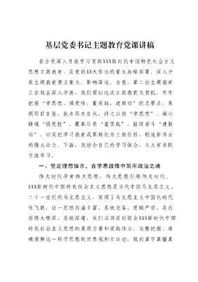 基层党委书记主题教育党课讲稿在全党深入开展学习贯彻XXX新时代中国特色社会主义思想主题教育,是党的XX大作出的重大战略部署。深入开展主题教育意义重大,影响深远。当前,第二批主题教育正在我县深入开展,我们要以这次主题教育为契机,牢牢把握学思想、强党性、重实践、建新功的总要求,秉纲而目自张,执本而末自从,持之以恒学思想,凝心铸魂强党性,履职尽责重实践,接续奋斗建新功,切实把学习教育成果转化为上新征程、创造新伟业的强大动力。下面,我结合自己的学习体会,与大家共同交流学习。一、坚定理想信念,在学思践悟中筑牢政治之魂伟大时代孕育伟大思想,伟大思想引领伟大时代。XXX新时代中国特色社会主义思想是当代中国马克思主义、二十一世纪的马克思主义,实现了马克思主义中国化时代化飞跃,这一思想内涵丰富、系统完备、逻辑严密,其内容博大精深、系统深邃,我们必须深刻领会XXX新时代中国特色社会主义思想的真理力量和实践伟力,完整把握、准确理解这一科学思想的世界观和方法论,做到真学真懂真信真用,自觉用XXX新时代中国特色社会主义思想这一法宝指导全镇工作高质量发展。一是通过学习领悟对党忠诚的使命,汲取信念如磐的力量。理想信念是中国共产党人的精神支柱和政治灵魂。XXXXXX反复强调:理想信念是共产党人精神上的钙,共产党人如果没有理想信念,精神上就会缺钙,就会得软骨病。过去,面对打赢脱贫攻坚之大决战、新冠肺炎疫情之大考验,我们党都以强烈的历史担当和强大的战略定力团结带领人民同心奋斗,共克时艰就我们切身体会来说,近几年,我镇如期实现脱贫、产业发展势头迅猛、人居环境靓丽、群众生活安康。这一切,正是因为我们党咬定目标不放松、越是艰险越向前,因为我们始终坚定理想信念、牢记初心使命,这才有力我们今日迈向加快建设社会主义现代化美丽新宁夏XXX篇章的坚实步伐。二是通过学习提升增强本领的担当,汲取勤学苦练的力量。XXXXXX强调:刀要在石上磨、人要在事上练不经风雨、不见世面是难以成大器的。勤学苦练、增强本领,是党的优良传统,是时代的迫切需求,是事业发展青年成才的必经之路。事业发展没有止境,学习就没有止境。我们镇上年轻干部比较多,作为年轻干部,必须要有本领不够的危机感,进而不断完善履职尽责所必备的知识体系。要俯下身子,多到群众中去,到田间地头、到困难群众家里、到矛盾多的地方去,去听、去问、去感受,我们来自于群众之后,只有在形势严峻、情况复杂的境遇里成长起来,才能练胆魄、磨意志、长才干,才能做到既政治过硬又本领高强,担负起党和人民赋予的重任。三是通过学习强化人民至上的导向,汲取踔厉奋发的力量。人民在中国共产党百年奋斗和当代中国的符号与话语体系中占据核心地位。贯穿党的XX大报告始终总计出现177次。解决好人民最关心最直接最现实的利益问题是人民至上的核心问题和关键点。2021年4月,XXX在广西考察调研时,强调让人民生活幸福是国之大者,要求推动全体人民共同富裕取得更为明显的实质性进展。区市县各级党委也把让广大人民过上幸福美满的好日子作为一切工作的出发点和落脚点,我们开展党员挂联诺服务群众面对面我为群众办实事等一系列活动,立足当下解决群众现实的切身利益问题。在各村敷设污水管网、XX村接通上下水、拓展产业规模、实施以工代赈等项目,更是立足长远去解决长远发展的问题。人民至上,还要依靠广大党员干部群众团结起来,踔厉奋发,担当有为,把惠民生的事办实、暖民心的事办细、顺民意的事办好,努力提高人民群众生活幸福感、归属感,切实做好群众的贴心人,带头人。二、涵养清廉正气,在修身养德中厚植党性之根XXX新时代中国特色社会主义思想,不仅包含着党治国理政的重要思想,也贯穿着中国共产党人的政治品格、价值追求、精神境界、作风操守的要求。作为党员干部,我们要注重修炼君子人格,努力克己、涵养天下情怀,永葆赶考的清醒和坚定,如此才能从党和人民的立场去思考问题、谋划事业。一是让调查研究成为破解难题的新路子。把大兴调查研究作为重要内容,是这次主题教育的一个鲜明特色做好调查研究,考验的是我们的工作作风,作为基层干部我们直面群众,能够更直观的了解群众的所思所想所盼,XX个行政村共有常住人口xx户xx人,其中监测户xx户xx人我镇严格落实一户一策帮扶措施,党政主要负责人深入农户,核对信息,落实帮扶,同时组织班子成员、党员干部对全镇重点工作进行调研,详细了解村集体经济发展非农化整治、苗木清退、环境卫生、庭院经济等重点工作开展情况,重视细节、善小大成,努力做到应有职责二是让唯实惟先成为善作善成的好点子。要锻造唯实惟先、善作善成堪当重任的干部,不能务虚,要对标对表,用工作推进来检验实效。作为基层党员干部,我们不能做忙忙碌碌做虚功、不求上进