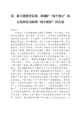 第二批主题教育党课:将拥护两个确立的自觉转化为做到两个维护的自觉同志们:大家好!今天我要讲的主题是将拥护两个确立的自觉转化为做到两个维护的自觉。在开始今天的课程之前,我想先和大家分享一个小故事。在红军长征过程中,有一位普通的红军战士,他叫张思德。他在一次战斗中腿部中弹,但他依然坚持跟随部队前进。在长征途中,他主动承担起照顾伤员的任务,为他们抬担架、送食物。当他自己的伤口感染时,他却选择了隐瞒,继续为战友们服务。最终,他因为伤势过重而牺牲。这个故事虽然简单,但它却蕴含着一个深刻的道理:一个真正的共产党员,应该始终把党和人民的利益放在第一位,无论在什么情况下,都要坚定地拥护党的领导,坚决地做到两个维护。那么,什么是两个确立和两个维护呢?两个确立是指:确立XXX同志党中央的核心、全党的核心地位,确立XXX新时代中国特色社会主义思想的指导地位。两个维护是指:坚决维护XXXXXX党中央的核心、全党的核心地位,坚决维护党中央权威和集中统一领导。为什么要将拥护两个确立的自觉转化为做到两个维护的自觉呢?这是因为,两个确立和两个维护是相辅相成、相互联系的。只有坚定地拥护两个确立,才能真正做到两个维护;只有坚决地做到两个维护,才能更好地拥护两个确立。在当前正在开展的学习贯彻XXX新时代中国特色社会主义思想主题教育中,我们要以高度的政治自觉、思想自觉和行动自觉,将拥护两个确立的自觉转化为做到两个维护的自觉。我们要深刻领悟两个确立的决定性意义,不断增强四个意识、坚定四个自信、做到两个维护,始终在思想上政治上行动上同以XXX同志为核心的党中央保持高度一致。要做到这一点,我们需要从以下几个方面入手:一、发挥政治建设的统领作用,坚决拥护XXX同志党中央的核心、全党的核心地位自觉拥护两个确立,必须坚持以政治建设为统领,增强四个意识,自觉做到两个维护。党的XX大报告指出:健全总揽全局、协调各方的党的领导制度体系,完善党中央重大决策部署落实机制,确保全党在政治立场、政治方向、政治原则、政治道路上同党中央保持高度一致,确保党的团结统一。党的十八大以来,党在自我革命和社会革命良性互动中确立了两个维护。广大党员必须强化核心意识,深刻领会两个维护的重大现实意义,并将其内化于心、外化于行,绝不能仅仅将其作为表决心的政治口号。一是要加强党员党性修养。党内政治生活是提高党员政治素质的重要平台。新时代,为了加强和改进党内政治生活,尤其是规范党员言行,党中央陆续出台了一系列党内法规,有法可依、有规可循是加强和改善党内政治生活的现实保障,广大党员必须牢固树立规则意识和底线思维,坚决贯彻落实党中央决策部署。二是要在实践中加强政治历练。进入新时代,党带领人民开展具有许多新的历史特点的伟大斗争,广大党员要自觉树立斗争意识、奋斗意识,主动参与斗争实践,在繁杂工作中淬炼自身的政治能力,克服自身的本领恐慌,在大是大非面前保持政治定力。三是要净化党内政治生态。拥护两个确立、做到两个维护需要风清气正的政治生态,必须加强党内政治文化建设,净化政治生态。中国共产党在100多年的奋斗历程中确立了坚定共产主义理想信念、坚持马克思主义指导地位、坚决执行党的路线方针政策的传统政治文化,这为加强党的政治生态建设奠定了良好的思想基础。新时代,必须大力传承和弘扬党的优良政治传统,重塑党的政治生态环境,通过价值引领、制度规范、纪律约束,引导广大党员树立正确的价值观,提升自身的政治判断力,保持自身的政治定力,在歪风邪气面前岿然不动。二、立足思想建设的引领功能,建立对领导核心和指导思想的高度认同思想是实践的先导,认知决定行动。在行动上自觉拥护两个确立,将其内化于心、外化于行的前提是在思想上高度认同两个确立,形成对两个确立的科学认知。一方面,要自觉维护XXX同志党中央的核心、全党的核心地位,坚定理想信念。理想信念不是空洞的口号,更不是虚无缥缈的目标,坚定的理想信念对于中国共产党人而言好比精神上的钙,没有理想信念,或者理想信念不坚定,精神上就会缺钙,就会得软骨病,就可能导致政治上变质、经济上贪婪、道德上堕落、生活上腐化。理想信念是中国共产党人安身立命的根本。一代代中国共产党人不怕牺牲、不怕苦难,在革命、建设、改革不同阶段实现一个又一个奋斗目标,靠的是坚定的理想信念,靠的是马克思主义、共产主义的真理力量,必须加强对马克思主义的学习,加强对中国共产党100多年奋斗历程的学习,运用马克思主义立场、观点、方法科学对待中国共产党在100多年奋斗历程中形成的优良传统,将理想信念自觉转化为维护领导核心的自觉。新时代,XXX亲自谋划、亲自部署关涉中国特色社会主义事业发展全局的重大战略举措