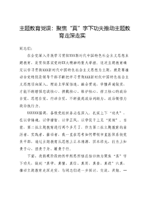 主题教育党课:聚焦真字下功夫推动主题教育走深走实同志们:在全党深入开展学习贯彻XXX新时代中国特色社会主义思想主题教育,是贯彻落实党的XX大精神的重大举措。这次主题教育确定以学习贯彻XXX新时代中国特色社会主义思想为主题,就是要推动全党特别是领导干部不断把学习贯彻XXX新时代中国特色社会主义思想引向深入。理论上学深悟透、融会贯通,学懂弄通做实,才能不断增强忠诚核心、拥戴核心、维护核心、捍卫核心的政治自觉、思想自觉、行动自觉,不断提高政治判断力、政治领悟力政治执行力。XXXXXX强调,各级党组织务必在深入、扎实上下功夫,在以学铸魂、以学增智、以学正风、以学促干上见实效。当前,第二批主题教育进行两个多月了,作为第二批主题教育的亲历者、实践者、推动者,我一直在思考如何带领市直医保系统党员干部,通过主题教育从思想上正本清源、固本培元,行为上知责于心、担责于身、履责于行。下面,我将现阶段的所学所思所悟总结归纳为聚焦真字下功夫,做到真学、真懂、真信、真用、真查、真改六真,推动主题教育走深走实,与同志们进一步探讨、交流、共勉。一夯实基础,在真学中体现政治态度鸟欲高飞先振翅,人求上进先读书。XXXXXX强调,学习理论最有效的办法是读原著、学原文、悟原理,强读强记,常学常新,往深里走、往实里走、往心里走,把自己摆进去、把职责摆进去、把工作摆进去,做到学思用贯通、知信行统一。聚焦真字下功夫,首先要在学中求真。真学体现的是政治态度,就是要把学习XXX新时代中国特色社会主义思想作为一种政治责任、一种工作态度、一种精神追求,舍得花精力,善于抓重点注重讲方法,持之以恒地加强学习。XXX新时代中国特色社会主义思想是系统全面、逻辑严密、内涵丰富、内在统一、不断发展的科学理论体系,是我们认识世界、把握规律、追求真理、改造世界的强大思想武器,这一科学体系既讲战略又讲战术,既擘画民族复兴的远景蓝图、又描绘达至目标的施工路线,既交待过河的任务、又提供过河的船和桥,既指引伟大社会革命又指导伟大自我革命,无论哪个领域、哪个层面、哪项工作,都可以从中找到解决问题的答案。主题教育加强理论的学习,就是要我们从这一明镜中去审视,理清头绪,找到现实中存在的问题再带着问题去找对策方法,不断提升,使我们的工作达到新的高度。深入开展学习贯彻XXX新时代中国特色社会主义思想主题教育如何做到真学?一要往新里学。党的理论创新每前进一步,理论武装就要跟进一步。在日益多变的新形势下,理论学习必须与时俱进,不能身子进了新时代,思想还停留在过去。要跟进学习XXXXXX关于主题教育系列重要论述和最新重要讲话文章,特别是对于后续党中央在学习过程中作出新的部署,出台新的文件,要紧跟XXX思想脉搏和脚步足迹,深刻把握XXX重要论述和思想精髓,找到XXX始终站在人民立场、对党担当、家国情怀、世界眼光的源头活水。二要往深里学。要找准学习重点,制定学习计划,注重学习的系统性,增强理论学习的实效性。将XXXXXX关于主题教育的重要讲话和重要指示批示精神和对医疗保障工作的重要讲话、文章和指示批示,作为党员干部,特别是市局和市经办处班子成员必修课,结合职责分工精读研读,不断在深入学习中改造思想、廓清迷雾、汲取营养,不断在思考研究中完善思路、破解难题、提升水平。三要往实里学。要坚持边学边思、边学边用、边学边干,把理论学习同XXXXXX关于社会保障基金监管等系列重要指示批示精神结合起来,同解决弱势短板和突出问题结合起来,同调查研究、检视问题、整改落实贯通起来同个人的思想、工作、作风、能力实际链接起来,带着问题学,联系实际想,防止散光跑偏,避免工作措施相互割裂、毫无章法真正把学习成果转化为对推动医疗保障事业高质量发展的力量源泉。二、把握关键,在真懂中体现政治觉悟主题教育的学习,要真学,更要真懂。懂是领会,更是贯通。XXX新时代中国特色社会主义思想内容涵盖改革发展稳定、内政外交国防、治党治国治军等方方面面,是一个逻辑严密内涵丰富、系统全面、博大精深的科学体系。党的XX大报告明确指出,十个明确十四个坚持十三个方面成就概括了这一思想的主要内容。我们既要全面系统地学习掌握这些主要内容,又要整体把握这一思想的科学体系,做到融会贯通。对各领域提出的新理念、新思想、新战略,对各方面工作提出的具体要求,都要放在整个科学体系中来认识和把握,避免碎片化、片面性,不能只见树木、不见森林。学习贯彻XXX新时代中国特色社会主义思想,必须做到学深悟透,全面理解和准确把握其思想精髓丰富内涵、核心要义,在真懂上下功夫,做到精读细研,融会贯通。深入开展学习贯彻XXX新时代中国特色社会主义思想主题教育如何做到真懂?一要反复学、反复悟,要把学思想、强党性、重实践、建新功的总要