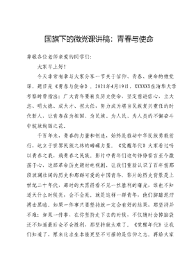 国旗下的微党课讲稿:青春与使命尊敬各位老师亲爱的同学们:大家早上好!今天非常有幸与大家分享一节关于信仰、青春、使命的微党课,题目是《青春与使命》。2021年4月19日,XXXXXX在清华大学考察时曾指出:广大青年要肩负历史使命,坚定前进信心,立大志、明大德、成大才、担大任,努力成为堪当民族复兴重任的时代新人,让青春在为祖国、为民族、为人民、为人类的不懈奋斗中绽放绚丽之花。千百年来,青春的力量和创造,始终是推动中华民族勇毅前行,屹立于世界民族之林的磅礴力量。《觉醒年代》大家看过吗以青春之我,筑青春之民族。影片中青年们这句铮铮誓言至今激荡于心,这部革命历史题材电视剧,让我们重新认识了百年前那段波澜壮阔的历史和那群可爱的中国青年。影片的历史背景是上世纪二十年代,那时的天黑得看不见一丝胜利的曙光,谁也不知道天什么时候亮,会不会亮。就是这样一群青年,他们脚踏泥泞搏击黑暗。如果一件事只要坚持就一定会有好的结果,那坚持并不难;如果一件事,在你坚持走下去的时候,不仅随时会掉脑袋还不知道最后会不会胜利,那坚持就太难了。《觉醒年代》让我们知道了,原来比求生本能更坚不可摧的是信仰之志。再给大家分享两组数据,《觉醒年代》中毛泽东26岁,李大钊30岁,周恩来21岁。正可谓,恰同学少年,风华正茂,挥斥方遒。《红色家书》大家看了吗?书中编录了31位烈士的家书,他们牺牲时,最大的40岁,最小的21岁,平均年龄仅有28岁。看到这组数据,我的内心异常澎湃,是什么让这群革命青年明知前路艰险而向死而生,奋不顾身的奔向同一目标,是什么让他们在黑暗中摸索,跨越万水千山,谱写出惊天地泣鬼神的伟大篇章,我的脑海中闪现出两个词:青春与使命。百年风雨兼程,在一代又一代的青年接续奋斗中,民族复兴的接力棒交到了当代青年手中。那么,新时代青年应该在哪里用力?对谁用心?又如何用情呢?我想,这是我们应该思考的问题这也是青年XXX常常思考的人生命题。1974年,21岁的XXX在梁家河担任党支部书记,白天,他既是宣讲文件带头抓生产的领导,又是抄起铁锹亲自打坝植树的劳动力。晚上,他还是点起油灯教社员写名字的夜校老师。在梁家河,面临吃水困难,他就带大家打井;耕地不够,就带大家一起打坝地。只要是村民需要的,只要是他能想到的,他都去办。脚踏在大地上,置身于人民群众中,会使人感到非常踏实,也很有力量。这是XXX的肺腑之言,也是他用奋斗书写激昂青春的真实写照。精神之光,穿越时空。新时代中国青年把基层当做最好的课堂,把个人的小目标融进党和国家事业的大蓝图中,将个人的中国梦,化作一件件身边实事。黄文秀就是这样一个人,她从北京师范大学研究生毕业之后,果断放弃大城市的工作机会,主动请缨到贫困村任第一书记,2018年,她担任广西百色市百坭村的驻村第一书记,在她刚上任时,她发现现实的情况远比自己想象的更复杂,该村是深度贫困村。黄文秀深知,要想脱贫,增收才是硬道理。为了解决这个问题,她遍访百坭村195户贫困户,跑项目找资金、请专家,最终带领全村实现了整体脱贫。2019年6月,百坭村突发暴雨,黄文秀在回村途中被突发的山洪淹没,当搜救队找到她的时候,她早已没了生命体征,而那年,她只有30岁。XXXXXX对黄文秀的先进事迹作出了重要指示,赞扬她用美好青春诠释了共产党人的初心使命,谱写了新时代的青春之歌,并号召广大党员干部要以黄文秀同志为榜样,不忘初心、牢记使命,勇于担当、甘于奉献,在新的长征路上做出更大的奉献。回望波澜壮阔的历史长河,我们可以发现,正是因为有一代又一代以青春之我的接续奋斗,才有了今日此生无悔入华夏的深情告白。最后,我想用三句诗与大家共勉。一是砥砺曾是昔年辛苦地,不将今日负初心的坚定信念,牢记入党初心,践行为民宗旨,无愧于我是一名共产党员;二是砥砺苔花如米小,也学牡丹开的奉献精神,虽然我们所处的岗位平凡而普通,但我们也是社会大机器的一颗不可或缺的螺丝钉,只要我们坚守岗位,在平凡的岗位也能闪光出彩;三是砥砺抬眸四顾乾坤阔,日月星辰任我攀的豪情壮志,相比觉醒年代,我们远离了硝烟和压迫,生活在一个国泰民安的新中国,青年有了空前广阔的舞台,我们唯有不负韶华、逐梦前行,用奋斗书写无愧于时代的青春之歌,用行动践行请党放心、强国有我。谢谢大家,我的分享到此结束。