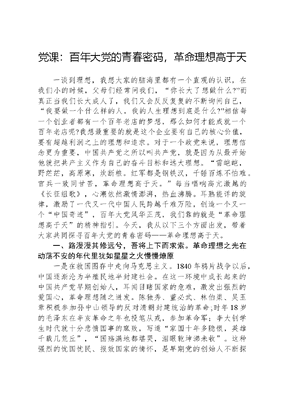 党课:百年大党的青春密码,革命理想高于天一谈到理想,我想大家的脑海里都有一个直观的认识,在我们小的时候,父母们经常问我们,你长大了想做什么?而真正当我们长大成人了,我们又会反反复复的不断询问自己,我要做一个什么样的人,我的人生理想到底是什么?相信每一个创业者都有一个百年老店的梦想,那么如何才能成就一个百年老店呢?我想最重要的就是这个企业要有自己的核心价值,要有超越利润之上的理想和追求。对于一个政党来说,理想信念更为重要,中国共产党之所以叫共产党,就是因为从最开始他就把共产主义作为自己的奋斗目标和远大理想。雪皑皑,野茫茫,高原寒,炊断粮。红军都是钢铁汉,千锤百炼不怕难。官兵一致同甘苦,革命理想高于天。每当唱响高亢激越的《长征组歌》,心潮依然激情澎湃,热血沸腾。耳熟能详的旋律,激励了一代又一代中国人民跨越千难万险,创造一个又一个中国奇迹,百年大党风华正茂,我们靠的就是革命理想高于天的精神指引。今天,我从以下三个方面出发,带着大家共同探寻百年大党的青春密码——革命理想高于天。一、路漫漫其修远兮,吾将上下而求索。革命理想之光在动荡不安的年代里犹如星星之火慢慢燎原一是在救国图存中走向马克思主义。1840年鸦片战争以后,中国逐渐沦为半殖民地半封建社会。在这一环境中成长起来的中国共产党早期创始人,耳闻目睹国家的危难,激发出强烈的爱国心,革命理想随之迸发。陈独秀、董必武、林伯渠、吴玉章积极参加孙中山领导的反对清朝封建统治的革命;时年18岁的毛泽东在辛亥革命之年也投笔从戎,参加革命军;李大钊学生时代就十分悲愤国事的窳败,写道家国十年多隐恨,英雄千载几荒丘,国殇满地都堪哭,泪眼乾坤涕未收。这种强烈的忧国忧民、报效国家的情怀,是早期党的创始人不断探索前进、最后接受马克思主义的思想动力。二是在思想探索中接受马克思主义。1919年10月,李大钊发表《我的马克思主义观》一文,系统介绍马克思主义的基本原理,强调马克思主义的历史地位和作用,认为马克思主义乃世界改造原动的学说,成为一个彻底的马克思主义者。陈独秀也明确表示,对于关系国家民族根本的存亡的问题不能装聋作哑,强调国人彻底的觉悟,对政治根本问题要急谋改革。蔡和森提出:我以为要先组织党——中国共产党。因为他是革命运动的发动者,宣传者,先锋队,作战部。毛泽东对此非常赞成:必如此,才能养成少数极觉悟极有组织的知识分子,适应战争时代及偌大的改造事业。周恩来、李达、李汉俊等在留学外国期间,通过对改造社会的各种学说的比较和选择,通过对马克思主义的研读,转变为马克思主义者。董必武、林伯渠等在实践中发觉孙中山革命的路子不对头,在探索新的革命方法和研读马克思主义过程中,转向马克思主义。三是在实践比较中选择马克思主义。毛泽东曾很投入地参加湖南自治运动,但他从其失败中得出结论:政治改良一途,可谓绝无希望。吾人惟有不理一切,另辟道路,另造环境一法。李大钊、陈独秀同样是从改良主义的失败中,引发了思想巨变。俄国十月革命的胜利,是马克思主义的胜利,它显示了马克思主义的理论价值和巨大威力,正如毛泽东指出的:一种似乎更为科学的政治学说变成了活生生的现实,并展现出了强大的生命力,彷徨的不断探索着的中国人当然有理由对马克思主义进行实验。五四运动的爆发,一大批进步的青年在斗争中进一步寻找到了革命的目标与方向,加速了马克思主义在中国的传播。在那个动荡的年代,正是这样一帮人在黑暗中摸索、在困难中前行、在死亡面前昂首阔步、在选择面前苦苦追寻,才为革命播下了火种,孕育了生命。二、为有牺牲多壮志,敢教日月换新天。革命理想的火种不断在血与火中淬炼升华,熊熊燃烧XXXXXX在庆祝中国共产党成立100周年大会上的重要讲话中指出:一百年来,中国共产党团结带领中国人民,以为有牺牲多壮志,敢教日月换新天的大无畏气概,书写了中华民族几千年历史上最恢宏的史诗。今天我主要从红军长征中几个典型的英雄事迹中带领大家感悟革命理想高于天的精神伟力。为苏维埃流尽最后一滴血的信仰力量。XXXXXX在全州参观红军长征湘江战役纪念馆时,在一幅油画前驻足凝视。这幅油画中的主人公是红军第五军团第三十四师师长陈树湘,油画上方写着为苏维埃流尽最后一滴血。这是他的真实写照,也是长征中红三十四师的真实写照。正是这个陈树湘,让XXXXXX在多个场合提及。1934年中央红军突破第四道封锁线湘江时,在国民党湘军和桂军夹击下,付出了极大牺牲。面对十几倍于己的强敌,师长陈树湘率领全师战士奋力抵抗,用血肉之躯筑起一道城墙,与敌人鏖战四天五夜,为红军渡过湘江赢得宝贵时间。伤重被俘后,敌人将他抬去邀功途中,他醒了过来,自己绞断肠子,壮烈牺牲,年仅29岁。就是爬,我也要跟上部队的战斗血性。在中华人民共和国开国将领中,有一位极富传奇色