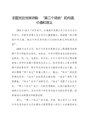 主题党日党课讲稿:第二个结合的内涵、价值和意义2023年10月7日至8日,全国宣传思想文化工作会议在北京召开。对宣传思想文化工作作出重要指示,强调要着力赓续中华文脉、推动中华优秀传统文化创造性转化和创新性发展。2023年6月2日,在文化传承发展座谈会上强调要深刻把握中华文明的突出特性,他指出,中华文明具有突出的连续性、创新性、统一性、包容性、和平性。在五千多年中华文明深厚基础上开辟和发展中国特色社会主义,把马克思主义基本原理同中国具体实际、同中华优秀传统文化相结合是必由之路。在深刻理解两个结合的重大意义上,指出,结合的前提是彼此契合,结合的结果是互相成就,结合筑牢了道路根基,结合打开了创新空间,结合巩固了文化主体性。第二个结合是又一次的思想解放,让我们能够在更广阔的文化空间中,充分运用中华优秀传统文化的宝贵资源,探索面向未来的理论和制度创新。那么,第二个结合的内涵、价值、意义是什么?传承中华优秀传统文化还有哪些问题需要深入研究?这些都是学术界正在研讨的重大话题。一、第二个结合的提出和系统阐述是重要的创新(一)传统释义谈到文化的传承发展,首先要理解传统这一概念。什么是传统?学术界认为,传统是人们代代相传的行事方式,对社会行为具有规范作用和道德感召力。对于传统这一概念,我们可以从两个方面来看:一是物质传统,如历史建筑、纪念碑、历史景观、雕塑、绘画、书籍等;二是精神传统,包括人类以往创造的制度、信仰、价值观和行为方式等无形的精神产品,比如儒家思想传统、文人画传统等。在精神传统中,有一个概念叫实质性传统。实质性传统是指崇尚过往的成就智慧和制度,并主张把过去继承下来的行为方式视为楷模和指南的倾向,比如对宗教和家庭的感情、对祖先和权威的敬重、对家乡的怀恋之情等。以上是对传统这一关键词的介绍。(二)在中国共产党的历史中,中国共产党人对待传统文化的态度发生了深刻变化我们知道,新文化运动的先驱都是持批判传统文化态度的当然,这里是有一个背景的。曾是资产阶级改良派代表人物的康有为在辛亥革命后堕落为一个狂热的尊孔复辟派。1913年11月,康有为致电袁世凯,要求袁世凯尊圣卫道令学校读经。这与复辟称帝的袁世凯的想法不谋而合。对于袁世凯、康有为尊孔复古的做法,陈独秀、李大钊、胡适等人进行了强烈抵制和反对,并由此发动了声势浩大的新文化运动。陈独秀发表抨击尊孔复古的文章,提出打倒孔家店。陈独秀在《驳康有为致总统总理书》中指出,孔教与帝制,有不可离散之因缘。1917年,李大钊发表了《孔子与宪法》一文,明确指出,孔子者,历代帝王专制之护符也。宪法者,现代国民自由之证券也。专制不能容于自由,即孔子不当存于宪法。瞿秋白在《〈新青年〉之新宣言》中指出:中国的旧社会旧文化是什么?是宗法社会的文化,装满着一大堆的礼教伦常,固守着无量数的文章词赋;礼教伦常其实是束缚人性的利器,文章词赋也其实是贵族淫昏的粉饰。那么,青年毛泽东对传统是什么态度?这也是大家非常关注的。1919年,毛泽东同志在《湘江评论》上发表《健学会之成立及进行》一文。他在阐发与论述该学会章程中的自由讨论学术一条时指出:我们反对孔子,有很多别的理由。单就这独霸中国,使我们思想界不能自由,郁郁做二千年偶像的奴隶,也是不能不反对的。随着我们党对传统文化认识的逐步深入,中国共产党人对传统文化的态度发生了变化。新民主主义革命时期,中国共产党人更多是以辩证唯物主义和历史唯物主义的态度来看待中国传统文化的。1938年10月,毛泽东同志在党的扩大的六届六中全会上指出,我们不应当割断历史。从孔夫子到孙中山,我们应当给以总结,承继这一份珍贵的遗产。在《新民主主义论》中,毛泽东同志提出,清理古代文化的发展过程,剔除其封建性的糟粕,吸收其民主性的精华,是发展民族新文化提高民族自信心的必要条件。新中国成立后,中国共产党提出在文艺领域要坚持推陈出新、洋为中用、古为今用的方针。毛泽东同志提出,对中国的文化遗产,应当充分地利用,批判地利用。改革开放以后,1982年我国颁布了《中华人民共和国文物保护法》。1985年,中国正式加入《保护世界文化和自然遗产公约》。2004年,我国加入《保护非物质文化遗产公约》。2005年,《国务院关于加强文化遗产保护的通知》发布。2011年,《中华人民共和国非物质文化遗产法》发布。可以看出,改革开放以后我国越来越重视对非物质文化遗产的保护。党的十八大以来,我国更加重视中华优秀传统文化在治国理政中的重要作用。指出,宣传阐释中国特色,要讲清楚每个国家和民族的历史传统、文化积淀、基本国情不同,其发展道路必然有着自己的特色;讲清楚中华文化积淀着中华民族最深沉的精神追求,是中华民族生生不息、发展壮大的丰厚滋养;讲清楚中华优