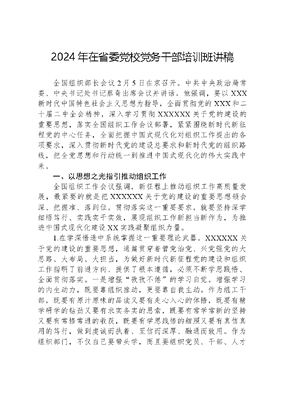 2024年在省委党校党务干部培训班讲稿全国组织部长会议2月5日在京召开。中共中央政治局常委、中央书记处书记蔡奇出席会议并讲话。他强调,要以XXX新时代中国特色社会主义思想为指导,全面贯彻党的XXX和二十届二中全会精神,深入学习贯彻XXXXXX关于党的建设的重要思想,落实全国组织工作会议部署,紧紧围绕新时代新征程党的中心任务,全面把握中国式现代化对组织工作提出的各项要求,深入贯彻新时代党的建设总要求和新时代党的组织路线,把全党思想和行动统一到推进中国式现代化的伟大实践中来。一、以思想之光指引推动组织工作全国组织工作会议强调,新征程上推动组织工作高质量发展,最紧要的就是把XXXXXX关于党的建设的重要思想领会深、把握准、落到位。贯彻落实这一重要要求,就要坚持深学细悟笃行、实践实干实效,展现组织工作新担当新作为,为推进中国式现代化建设XX实践凝聚组织力量。1.在学深悟透中系统掌握这一重要理论武器。XXXXXX关于党的建设的重要思想,通篇贯穿着管党治党、兴党强党的大思路、大布局、大担当,为做好新时代新征程党的建设和组织工作指明了前进方向、提供了根本遵循,必须不断学思践悟、全面贯彻落实。一是增强孜孜不倦的学习自觉。增强学习的内生动力,既要靠组织推动,更要靠自我主动。作为组工干部,既要有原汁原味的品读又要有走心入心的体悟,既要有精学研学的钻劲又要有求实务实的思索,既要有常学常新的坚持又要有常悟常进的收获,既要有学思践悟的细照又要有真信真用的笃行,做到虔诚而执着、至信而深厚、融通而致用。作为组织部门,不仅自己要带头学,而且要组织党员、干部、人才都来学;不仅要对接理论学习的需求侧,而且要改善教育培训的供给侧。二是涵养了然于胸的境界追求。注重从百年建党理论实践探索来把握其鲜明的理论原创性,从新时代十年伟大变革来把握其强大的实践引领力,从坚持六个统一来把握其系统的科学方法论,加强对十三个坚持的系统性学习、体系化研究,整体把握精髓要义和实践要求,系统掌握贯穿其中的立场观点方法,做到融会贯通、入脑入心。三是提升运用自如的实践能力。切实从XXXXXX关于党的建设的重要思想中悟规律、明方向、学方法、增智慧,聚焦党的建设和组织工作重点难点问题,在深入调查研究中拿出更多有效的破题思路、破冰办法、破局举措,做到学以致用、活学活用。点此加群2.在把准定位中充分发挥组织工作职能作用。把握组织工作在贯彻落实党的XXX战略部署中发挥三个职能作用的精准定位,跳出党建看党建、跳出组织看组织,主动把组织工作放在发展大局中来思考和把握。一是在加强党的全面领导中加大贯通落实力度。把坚持和加强党的全面领导和党中央集中统一领导作为首要任务来抓,全面贯彻新时代党的建设总要求,严格落实维护党的集中统一的组织制度,推动落实总揽全局、协调各方的党的领导制度体系,着力构建上下贯通、执行有力的严密组织体系,确保党的领导在各层级、各领域、各方面全面、系统、整体落实。二是在推进党的事业发展中加大服务保障力度。牢记XXXXXX寄予XX在中部地区崛起中奋勇争先,奋力谱写新时代中原更加出彩的绚丽篇章的殷殷嘱托,坚持组织路线服务政治路线,通过建强组织、配强班子、用好干部、盘活人才,切实把干部资源转化为发展资源、组织优势转化为发展优势、人才活力转化为发展活力。三是在健全全面从严治党体系中加大基础支撑力度。善于运用治理的理念、系统的观念、辩证的思维,立足组织部门职能职责,找准着力点、发力点,在重大任务上担当尽责,在主责主业上守土负责,在配合文可居文库——海量学习资料,手机电脑均可下载www.wenkeju.com补位上义不逃责,着力固根基、扬优势、补短板、强弱项,切实担负起忠诚为党护党、全力兴党强党这一根本使命。3.在担当作为中持续提升组织工作整体质量。坚持以XXXXXX关于党的建设的重要思想为指引,更加扎实做好理论武装、选贤任能、强基固本、育才聚才各项工作。一是用好党员干部理论教育培训长效机制这个牵引。持续抓好党员干部人才集中轮训调训,健全完善理论教育培训课程开发、师资培养、方式创新等长效机制,多运用沉浸式、体验式、案例式等教学形式,筑牢坚定拥护两个确立、坚决做到两个维护的思想根基。在各级党校和干部学院持续强化首课、必修课的思想浸润作用,用好焦裕禄精神、红旗渠精神、大别山精神等XX党性教育资源,丰富教材库、课程库、师资库,内涵式提升5所干部学院的办学层次,讲好我们党治国理政的XX故事。二是扭住锻造忠诚干净担当的高素质干部队伍这个关键。落实好干部标准和四选四不用重大要求,突出把好政治关、能力关、品行关、廉洁关,强化重实干、重实绩的用人导向,注重选拔那些牢固树立正确政绩观,坚持人民至上、为民造福,坚持真抓实干、埋头苦干,作出突出业绩的优秀干部,以正确用