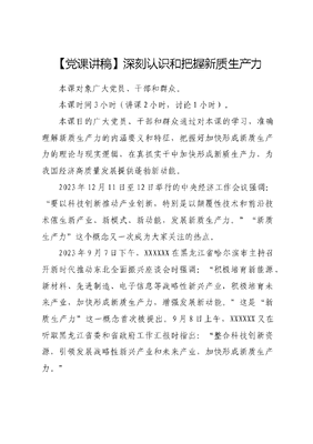 【党课讲稿】深刻认识和把握新质生产力本课对象广大党员、干部和群众。本课时间3小时(讲课2小时,讨论1小时)。本课目的广大党员、干部和群众通过对本课的学习,准确理解新质生产力的内涵要义和特征,把握好加快形成新质生产力的理论与现实逻辑,在真抓实干中加快形成新质生产力,为我国经济高质量发展提供蓬勃新动能。2023年12月11日至12日举行的中央经济工作会议强调:要以科技创新推动产业创新,特别是以颠覆性技术和前沿技术催生新产业、新模式、新动能,发展新质生产力。新质生产力这个概念又一次成为大家关注的热点。2023年9月7日下午,XXXXXX在黑龙江省哈尔滨市主持召开新时代推动东北全面振兴座谈会时强调:积极培育新能源、新材料、先进制造、电子信息等战略性新兴产业,积极培育未来产业,加快形成新质生产力,增强发展新动能。这是新质生产力这一概念首次被提出。9月8日上午,XXXXXX又在听取黑龙江省委和省政府工作汇报时指出:整合科技创新资源,引领发展战略性新兴产业和未来产业,加快形成新质生产力。2023年末,多家平台盘点年度十大流行语、热词,新质生产力均在其列,甚至居于榜首。新质生产力作为一个新的经济学概念,也迅速引起理论界和政策界的高度关注。如何理解新质生产力的内涵和外延,如何把握好新质生产力的本质,如何利用好新质生产力来为我国经济高质量发展提供蓬勃新动能,是理论和实践必须回答的问题。一、新质生产力的内涵要义和特征生产力的发展是一个有规律可循的过程。新质生产力和传统概念中的生产力有着怎样的联系和区别?在当今时代背景下,新质生产力有着怎样的具体表现?学习贯彻XXXXXX提出的关于发展新质生产力的指示要求,首先要准确理解新质生产力的内涵要义和特征。(一)什么是新质生产力?生产力这一概念由来已久,它是马克思主义政治经济学的一个核心范畴,其基本含义为人们征服自然、改造自然的能力,表示人们在生产过程中与自然界的关系,它和生产关系是社会生产不可分割的两个方面。马克思主义政治经济学基本原理认为,生产力一般包括两个方面要素:一是具有一定科学技术知识、生产经验和劳动技能的劳动者;二是同一定的科学技术相结合的、以生产工具为文可居文库——海量学习资料,手机电脑均可下载www.wenkeju.com主的劳动资料。由此可见,生产力可以再进一步区分为三个更为基本的要素:劳动者、科学技术、劳动工具。科学技术是第一生产力,如今科学技术越来越广泛运用于人类的生产,通过对生产力各个要素的作用,促进或决定生产力的发展。何为新质生产力?《辞海》对新字的解释为初次出现的,与旧相对,此外还有一种含义,为改旧或更新之意。据此来看,所谓新质,就是在本质上与原来截然不同的性质。由此,推演出新质生产力的含义:与原来性质截然不同的改造自然的能力。这种能力来自与原来截然不同的劳动者、科学技术和劳动工具。这里的劳动者当然是指掌握现代科技技能、具有高水平人力资本积累的现代生产者;这里的科学技是指能够极大增强人类改造自然能力的新知识術、新技巧、新工艺、新方法;而劳动工具则是指能够显著提高社会生产力的新机器、新设备等。当然,新质生产力的这三大要素,起主导作用的是科学技术,同时,科学技术的发展需要依赖劳动者本身,科学技术的运用必须要有劳动工具的参与。(二)科学技术是形成新质生产力的关键纵观人类社会发展进程,历史上每一次科技革命都引领了一轮产业变革,极大地改变了人们的生产生活方式,提高了人们的生活水平,深刻地改变了国际力量格局。当今世界正处于文可居文库——海量学习资料,手机电脑均可下载www.wenkeju.com百年未有之大变局,科技在这一变局中扮演着推动者的角色。随着新一轮科技革命和产业变革深入发展,全球产业结构和布局深刻调整,推动世界政治格局深刻转变。大数据、人工智能、5G通信、量子科技、生物技术等领域取得颠覆性技术突破,正在酝酿诞生一批未来产业;材料科学、环境科学、生命科学、能源科学等多学科交叉融合发展,推动多领域技术融合创新;新兴科技不断赋能传统产业,推动机械工程、服装设计、汽车制造等行业焕发新的生机,实现了新旧动能转换。新科技催生新产业,新产业塑造经济发展新动能,这是新质生产力在当今时代背景下的具体表现。纵观人类生产力发展历史,科学技术始终是促进生产力发展的关键性要素,进而不断催生新兴产业,成为世界各国经济和综合国力竞争的关键角逐点。从逻辑层面来看,大力发展新质生产力与科学技术是第一生产力的论断是一致的。因此,世界各国特别是大国之间的竞争,归根到底是科学技术的竞争,或者说是在新质生产力发展方面的竞争。新质生产力强调的是质态的新,而质态取决于在生产力中发挥关键作用的各生产要素。但新质生产力又不仅仅指科技生产力