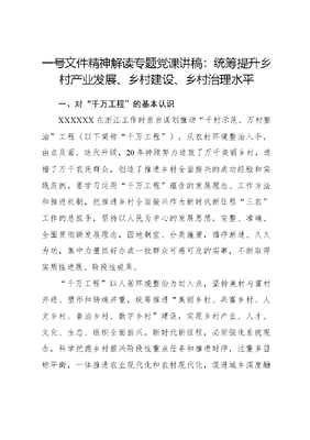 一号文件精神解读专题党课讲稿:统筹提升乡村产业发展、乡村建设、乡村治理水平一、对千万工程的基本认识XXXXXX在浙江工作时亲自谋划推动千村示范、万村整治工程(以下简称千万工程),从农村环境整治入手,由点及面、迭代升级,20年持续努力造就了万千美丽乡村,造福了万千农民群众,创造了推进乡村全面振兴的成功经验和实践范例。要学习运用千万工程蕴含的发展理念、工作方法和推进机制,把推进乡村全面振兴作为新时代新征程三农工作的总抓手,坚持以人民为中心的发展思想,完整、准确、全面贯彻新发展理念,因地制宜、分类施策,循序渐进、久久为功,集中力量抓好办成一批群众可感可及的实事,不断取得实质性进展、阶段性成果。千万工程以人居环境整治为切入点,坚持美村与富村并进、塑形和铸魂并重,统筹推进美丽乡村、共富乡村、人文乡村、善治乡村、数字乡村建设,实现乡村产业、人才、文化、生态、组织全面振兴。新时代新征程,必须强化系统观念,科学把握乡村振兴阶段性重点任务和推进时序,注重多目标平衡,一体推进农业现代化和农村现代化,促进城乡深度融合,让农民就地过上现代文明生活。全面落实2024年中央一号文件部署,我们要学习运用千万工程经验,因地制宜、分类施策,循序渐进、久久为功,为科学编制村庄规划,引领宜居宜业和美乡村建设,推进乡村全面振兴提供指引。浙江的乡村之所以能称之为和美乡村,关键就在和。和是中国特色的乡村治理模式。从枫桥经验到三治结合,再到各种形式的治理模式在浙江大量涌现,都对乡村产业发展、社会稳定、文化繁荣起到重要作用,这也是乡村治理体系和治理能力现代化的体现。二、2024年中央一号文件的亮点与三个提升的关系(一)从大纲看重点随着乡村振兴战略的深入推进,2023年中央一号文件通过33条措施详细部署了实现农业农村现代化的路径。而到了2024年,工作重点更加聚焦,将农业农村发展的各个方面精炼为6个大的方向,并通过28条具体措施进行部署。这显示出,随着乡村振兴战略的持续推进,国家和老百姓在农业农村发展上的目标和期望变得更加明确和聚焦。在这个过程中,两个确保成为了我们的工作底线,它确保了粮食安全和防止规模性返贫,这是乡村振兴战略的基石。而三个提升则是我们的具体任务,包括提升乡村产业发展文可居文库——海量学习资料,手机电脑均可下载www.wenkeju.com水平、提升农民收入水平以及提升乡村治理水平。同时,我们还强调了两个强化,即强化科技和改革的双轮驱动作用,以及强化农民增收举措。这两个强化措施既是实现三个提升的重要手段,也是乡村振兴的重要目标。在两个确保的底线问题上,粮食安全问题任务更加繁重,其重要性也应排在首位。然而,从另一个角度看,粮食产业本身也是乡村产业的一部分。同时,在防止规模性返贫的工作中,我们采取的措施如加强产业和就业帮扶等,也直接促进了乡村产业的发展。因此,我们可以说,两个确保在很大程度上也可以包含在三个提升之中,它们是推进乡村全面振兴过程中的重中之重。最后,我们必须强调党对三农工作的全面领导,这是确保乡村振兴战略顺利实施的关键。通过加强党的领导,我们可以更好地整合资源、协调各方力量,为乡村全面振兴提供坚实的政治保障。(二)从举措看亮点第一,粮食安全方面:一是完善农资保供稳价应对机制,鼓励地方探索建立与农资价格上涨幅度挂钩的动态补贴办法;二是探索建立粮食产销区省际横向利益补偿机制,深化多渠道产销协作;三是树立大农业观、大食物观,多渠道拓展食物来文可居文库——海量学习资料,手机电脑均可下载www.wenkeju.com源,探索构建大食物监测统计体系;四是挖掘粮食机收减损潜力,推广散粮运输和储粮新型装具。第二,乡村产业发展方面,提出要优化农产品冷链物流体系建设。第三,乡村建设方面,提出要加强重点村镇新能源汽车充换电设施规划建设。第四,乡村治理方面,提出要推进抓党建促乡村振兴,加大编制资源向乡镇倾斜力度,县以上机关一般不得从乡镇借调工作人员,严格实行上级部门涉基层事务准入制度等。第五,强化农村改革方面,提出要启动实施第二轮土地承包到期后再延长30年整省试点。(三)三个提升的定位与相互关系乡村全面振兴关键在于乡村产业发展水平、乡村建设水平乡村治理水平的提升,这三个方面是一个有机整体,2024年中央一号文件专门把这三个方面的水平提升打造成了一套组合拳。产业发展是乡村振兴的活水,产业兴旺就是乡村振兴的首要任务,它解决经济基础问题。有了经济基础,乡村建设就有了底气和支撑,基础设施和公共服务供给、生态环境等老百姓可感可及的一系列问题才能改善得更好。不管是产业发展还是文可居文库——海量学习资料,手机电脑均可下载www.wenkeju.com乡村建设,