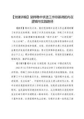 【党课讲稿】坚持稳中求进工作总基调的内在逻辑与实践路径【摘要】新时代以来,我们坚持稳中求进工作总基调破解了许多历史性难题,取得了许多历史性成就,形成了许多历史性的经验。全面理解和准确把握稳中求进以进促稳先立后破,是扎实推进中国式现代化过程中坚持稳中求进工作总基调的基础和前提。当前,坚持稳中求进工作总基调要注重经济发展的质量和效益;要切实保障和改善民生,促进社会公平正义;要加强经济治理和社会治理,有效防范化解重点领域风险,维护社会稳定。【关键词】稳中求进 以进促稳 先立后破 中国式现代化2023年12月的中央经济工作会议分析了当前的国际国内经济形势,明确了2024年经济工作的总体要求和政策取向,系统部署了9个方面的重点任务。XXXXXX提出坚持稳中求进、以进促稳、先立后破。中国特色社会主义进入新时代以来,稳中求进是我国做好经济工作的总基调,这既是治国理政的重要原则,也是搞好经济建设的根本方法。此次强调的以进促稳和先立后破与稳中求进既是一脉相承的,又是对稳中求进的发展、丰富和完善。以进促稳和先立后破,与稳中求进一起构成了新时代新征程工作总基调内部深刻的逻辑结构。坚持稳中求进工作总基调取得的历史性成就和经验中国特色社会主义进入新时代,以XXX同志为核心的党中央始终坚持稳中求进的工作总基调,深入推进了中国经济社会的发展,破解了许多历史性难题,取得了许多历史性成就,并形成了许多历史性的经验。历史性成就。稳中求进工作总基调是治国理政的重要原则也是做好经济工作的方法论。这一总基调在新时代得到了坚持和深化,其内涵也在实践中不断丰富和发展。党的十八大以来,这一工作总基调在改革开放和社会主义现代化建设中发挥了十分重要的作用,取得了许多历史性的成就。第一,在经济建设领域,我国经济持续健康发展,保持了稳中向好、好中向优的良好态势。经济增速位居世界前列,我国已成为世界第二大经济体。同时,我国经济发展的质量和效益不断提高,新质生产力不断涌现,产业结构不断优化,创新能力显著增强,改革开放深入推进,民生福祉持续改善,不断满足人民群众对高品质生活的新需求。第二,在政治建设领域,全面从严治党深入推进,党风廉政建设取得显著成效。党的执政能力和领导水平不断提高,党内政治生态不断净化,党同人民群众的联系不断加强。在国际地位方面,我国国际影响力持续提升,积极参与全文可居文库——海量学习资料,手机电脑均可下载www.wenkeju.com球治理体系改革和完善,为世界和平与发展作出积极贡献。第三,在文化建设领域,社会主义核心价值体系深入人心,中华优秀传统文化传承发展,文化事业和文化产业繁荣发展,国家文化软实力显著提升。第四,在社会建设领域,社保障体系會不断完善,脱贫攻坚取得决定性胜利,全面建设社会主义现代化国家取得显著成效,我国成为世界上最安全的国家之一。第五,在生态文明建设领域,我国生态环境保护修复取得重大进展,绿色发展方式和生活方式逐步形成,生态文明建设制度体系不断完善,我国成为联合国可持续发展议程的实践引领者。总之,坚持稳中求进工作总基调为我国取得了举世瞩目的历史性成就,为全面建设社会主义现代化国家、实现中华民族伟大复兴的中国梦奠定了坚实基础。新时代新征程,我们将继续坚持稳中求进工作总基调,推动我国各项事业不断向前发展。历史性经验。稳中求进工作总基调包含的内容丰富深刻,我们可以将这些具体的历史经验概括如下。一是坚持党对一切工作的领导。在坚持稳中求进的工作总基调中,党的领导是核心。它要求全党上下统一思想,树牢四个意识,坚定四个自信,坚决做到两个维护,确保党始终总揽全局、协调各方。二是将稳中求进作为治国理政的方法论。稳中求进不仅是经济工作的总基调,也是治国理政的整体方法论。它要求文可居文库——海量学习资料,手机电脑均可下载www.wenkeju.com在国家治理的各个方面都要坚持稳字当头,确保国家的长治久安,同时追求各项事业的发展进步。三是注重发展理念的与时俱进。这一总基调强调以创新、协调、绿色、开放、共享的新发展理念为指导,体现了中国对于传统发展模式的深刻反思和学理更新。四是注重发展战略的平衡性。在追求经济发展的同时,强调要保持社会的稳定和谐。这种平衡性体现在,不仅要追求经济增长的速度,还要注重经济增长的质量和效益,确保社会的公平正义,保障人民的基本生活。五是持续深化改革开放。坚持稳中求进,意味着要在稳定的经济和社会环境中,不断深化改革,扩大开放。通过改革开放激发市场活力,推动经济结构的优化升级,提高国家的整体竞争力。六是不断完善宏观调控。在宏观经济管理中,稳中求进的总基调要求政府要有预见性和灵活性,通过适时的宏观调控,确保经济运行在合理区间,避免剧烈波动,同时为结构性改革创造有利条件。七是不断完善政策体系。坚持稳中求