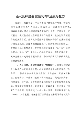 强化纪律建设 营造风清气正良好生态同志们,根据计划,今天我围绕强化纪律建设、营造风清气正良好生态为主题,给大家上一次廉政专题党课。XXXXXX强调,要把纪律建设摆在更加突出位置,党规制定、党纪教育、执纪监督全过程都要贯彻严的要求,使全党形成遵规守纪的高度自觉。党的纪律是党的各级组织和全体党员必须遵守的行为规则,是维护党的团结统一、完成党的任务的保证。我们作为纪检监察机关,要牢牢把握自我革命九个以的实践要求,坚持严字当头,严格执纪监督、强化纪律教育,充分发挥纪律建设标本兼治作用,努力以严明纪律护航现代化建设行稳致远。一、齐心协力,落实纪律建设责任制。加强纪律建设是全面从严治党的治本之策,必须牢牢牵住主体责任这个牛鼻子,督促推动各级党委(党组)主体责任、纪委(纪检组)监督责任、职能部门监管职责同向发力,做到齐抓共管、同题共答。近年来,全市坚持把主体责任和监督责任贯通起来抓,探索建立廉情通报、廉洁谈话、廉政档案、廉责监督四廉工作机制,创新构建一会一函一谈话、两书两清单的11122工作机制,有效增强了各级党组织和领导干部抓纪律建设的自觉。但是我们要清醒的认识到当前,党风廉政建设和反腐败斗争形势依然严峻复杂,纪律松弛风险依然存在。容不得我们有所松懈,一是要认真履行协助职责。进一步健全完善党内谈话、述责述廉、考核评价等机制,推动党委(党组)切实担负主体责任,党组织主要负责人坚决扛起第一责任人责任,领导班子成员认真履行一岗双责,严格执行纪律,坚持抓早抓小,敢于动真碰硬。二是要扛牢做实监督责任。紧盯一把手和领导班子成员责任履行情况、遵规守纪情况,强化监督检查,督促其严于律己、严负其责、严管所辖。三是要强化问责震慑作用。对党的纪律建设抓得不严不实、单位违规违纪行为多发、四风问题得不到有效整治等进行严肃精准问责,进一步强化党组织和领导干部抓好纪律建设的责任担当。二、固本培元,上好纪律教育理论课。加强纪律建设不能搞不教而诛,只有抓好纪律教育这个基础性、经常性工作,坚持党性党风党纪一起抓,将纪律规矩内化为日用而不觉的言行准则,才能充分发挥纪律建设的治本作用。近年来,全市坚持集中性教育和常态化教育相结合,广泛开展案例警示教育、送纪律教育上门等活动,实现了全市关键少数和重点领域、岗位人员纪律教育全覆盖。全市将进一步做细做实纪律教育这一项基础性、经常性工作,推动教育融于日常、做在经文可居文库——海量学习资料,手机电脑均可下载www.wenkeju.com常,引导党员干部知敬畏、存戒惧、守底线。一是突出关键少数。以学习贯彻新修订的纪律处分条例为契机,认真开展党纪学习教育,组织实施领导干部纪律教育专题培训,举办县处级干部党风廉政建设专题研讨班,教育引导各级领导干部立正身、讲原则、守纪律、拒腐蚀,形成以上率下、层层带动的示范效应。加大对年轻干部、新提任干部的纪法培训、廉政提醒力度,特别是对重要岗位干部做到轮训全覆盖,着力解决对党规党纪不上心、不了解、不掌握等问题。二是用好反面典型。加大以案释纪和警示教育力度,深化警示教育月活动,深化分领域、分行业、分类别精准教育,健全以案说德、以案说纪、以案说法、以案说责机制,真正使党员干部把纪律要求刻印在心。建立一案一警示制度,做细做实处分决定宣布执行,督促发案单位党组织召开专题民主生活会、组织生活会,深刻反思、查找不足、以案明纪,把处分决定从一张纸变成一堂课,进一步强化查处一案、警醒一片、规范一方作用。三是坚持红廉融合。充分挖掘全市的红色资源和本地历史文化中的廉洁元素、纪律印记,大力实施红廉深度融合行动,建好用活课上、云上、馆上、台上四大阵地,夯实党员干部遵章守纪、廉洁自律的思想根基。三、严格执纪,框定纪律规矩红线图。全面从严治党文可居文库——海量学习资料,手机电脑均可下载www.wenkeju.com的成功实践一再证明,纪律建设必须依靠强有力的执行作保障,做到执纪必严、违纪必究。让铁规发力、让禁令生威。近年来,全市始终将纪律这把戒尺牢牢抓在手中,聚焦违反中央八项规定精神问题、群众身边腐败和不正之风等,探索实践了违支四查、两提三查、一案一核等一批硬举措,深入开展金融融资、退耕还林、民生安全等领域专项治理,严肃查处害群之马、行业蛀虫、蝇贪蚁腐三类人群,以正风反腐高压态势维护纪律刚性、严肃性。新征程上,党面临的四大考验四种危险等各类风险挑战依然存在,必须始终把严的要求贯彻到纪律前沿、监督前沿,使党在革命性锻造中更加坚强有力。一是要把严明政治纪律摆在首位。持续深入推进政治监督具体化精准化常态化,推行政治要件跟踪督查、案例析查等十查措施,经常性开展嵌入式机动式专项监督,建