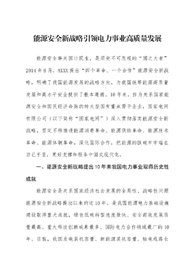 能源安全新战略引领电力事业高质量发展能源安全事关国计民生,是须臾不可忽视的国之大者2014年6月,AXXX提出四个革命、一个合作能源安全新战略,明确了我国能源发展的战略方向,为我国统筹能源高质量发展和高水平安全提供了根本遵循。10年来,作为关系国家能源安全和国民经济命脉的特大型国有重点骨干企业,国家电网有限公司(以下简称国家电网)深入贯彻落实能源安全新战略,坚定不移推进能源消费革命、能源供给革命、能源技术革命、能源体制革命,深化国际合作,把能源的饭碗牢牢端在自己手里,更好支撑和服务中国式现代化。一、能源安全新战略提出10年来我国电力事业取得历史性成就能源安全是关系国家经济社会发展的全局性、战略性问题能源安全新战略提出以来的这10年,是我国能源电力基础设施建设取得重大成就,绿色低碳转型速度最快、安全高效发展质量最高、重大科技创新成果最多、国际电力合作领域最广的10年。目前,我国发电装机容量、新能源装机容量、输电线路长度、变电容量、发电量、用电量保持世界首位,电力事业在砥砺奋进中走过非凡历程。10年来,大力推动能源消费革命,有力保障人民用上电、用好电。能源绿色低碳发展关乎人类未来,推动能源消费革命,需要抑制不合理能源消费,协同推进降碳、减污、扩绿、增长。我国深入推进终端能源消费电气化,北方地区清洁取暖率达到76%,对改善空气质量的贡献率超过1/3。因地制宜推进电能替代,我国
