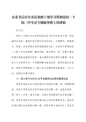 市委书记在全市县处级干部学习贯彻党的二十届三中全会专题辅导班上的讲稿同志们:党的二十届三中全会审议通过的《中共中央关于进一步全面深化改革、推进中国式现代化的决定》,主题鲜明、举措有力,是进一步全面深化改革的纲领性文件。认真学习贯彻党的二十届三中全会精神,解放思想、凝心聚力,进一步精心谋划和强力推进全面深化改革,奋力谱写中国式现代化篇章,是全省上下当前和今后一个时期的重大政治任务。很荣幸能为大家作一堂学习贯彻党的二十届三中全会精神的专题宣讲,不当之处,请同志们批评指正。一、深入学习XXXXXX关于全面深化改革的重要论述改革开放是决定中国式现代化成败的关键一招。XXXXXX指出,改革开放是决定当代中国命运的关键一招,也是决定实现两个一百年奋斗目标、实现中华民族伟大复兴的关键一招。改革开放是当代中国大踏步赶上时代的重要法宝,是决定中国式现代化成败的关键一招。改革开放只有进行时、没有完成时,推进中国式现代化,必须进一步全面深化改革开放,不断解放和发展社会生产力、解放和增强社会活力。要坚持党的领导。总结改革开放四十多年的经验,总结新时代十多年全面深化改革的经验,XXXXXX指出,坚持党的领导,全面从严治党,是改革开放取得成功的关键和根本。全面深化改革必须加强和改善党的领导,充分发挥党总揽全局、协调各方的领导核心作用。前进道路上,我们必须增强四个意识、坚定四个自信、坚决做到两个维
