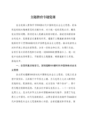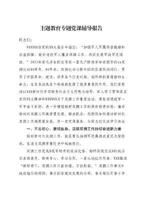主题教育专题党课辅导报告同志们:XXXXXX在党的XX大报告中指出:加强军人军属荣誉激励和权益保障,做好退役军人服务保障工作。巩固发展军政军民团结。2023年是毛泽东同志等老一辈无产阶级革命家倡导的xx双拥运动80周年。80年来,双拥运动与新中国的发展风雨同行,贯穿了中国革命、建设、改革各个历史时期,始终保持着蓬勃的生命力,在各条战线各个领域都发挥了极其重要的作用。我们要坚持以XXX新时代中国特色社会主义思想为指导,深入学习贯彻落实党的XX大精神和XXXXXX关于双拥工作重要论述,聚焦实现建军一百年奋斗目标,进一步增强做好双拥工作的使命感责任感,推动新时代双拥工作高质量发展。借此机会,我围绕如何推动新时代双拥工作高质量发展,作一堂党课报告,与同志们交流学习体会一、不忘初心、赓续血脉,汲取双拥工作持续奋进新力量做好新时代双拥工作,就是要弘扬拥军优属拥政爱民光荣传统,在追寻双拥厚重历史中砥砺前行。双拥工作是我D我军特有的政治优势,始终围绕完成D的政治任务而展开,影响中心,牵动全局。一是从地位作用看,XXX强调新形势下,双拥工作只能加强、不能削弱。双拥工作事关D执政地位的稳固,事关国家建设发展的全局,事关部队军事斗争准备质量和打赢能力提高,事关整个社会的和谐稳定,是推动国防建设与经济建设协调发展的重要保证。二是从目标任务看,新时代双拥工作与D和国家工作大局、国防和军队建设全局密切相关在统筹推进五位一体总体布局、协调推进四个全面战略布局中,XXX强调需要双拥工作给予有力配合和支持;在决胜全面建成小康社会的宏伟目标中,XXX要求军队要自觉服从服务于D和国家工作大局,在完成军事任务的同时,努力为促进地方经济社会发展贡献力量。三是从方法路径看,双拥工作必须以D的政治理念为指导。实践证明,任何情况下,D的旗帜就是双拥工作的灵魂,D的理论就是双拥工作的指南,D的纲领就是双拥工作的目标。双拥工作是战胜一切艰难险阻的重要法宝,紧紧伴随D领导军民的各个历史阶段。过去,无论在革命战争年代,还是在社会主义建设和改革时期,军政军民团结都彰显了不可替代的重要作用XXX在考察辽沈战役纪念馆时指出,辽沈战役胜利是东北人民全力支援拼出来的,淮海战役胜利是老百姓用小车推出来的,渡江战役胜利是老百姓用小船划出来的。发生在湖南的半条被子第一军规等红色故事,也充分说明了军民团结如一人试看天下谁能敌是颠扑不破的真理。现在,湖南深入贯彻XXX关于双拥工作重要论述和对湖南重要讲话重要指示批示精神,以D的××大精神为指引,军政军民团结根基更加牢固,军地合作更加密切,协调行动、攻坚克难、众志成城的局面更加生动。放眼未来,全面建设社会主义现代化国家具有多方面优势和条件,也面临不少困难和挑战。世界百年未有之大变局进入加速演变期,国际环境日趋错综复杂。当前和今后一个时期,我国发展仍然处于重要战略机遇期,在中华民族伟大复兴道路上的各种风险挑战只会增多、不会减少。历史实践必将再次证明,坚如磐石的军政军民团结,永远是我们战胜一切艰难险阻、不断从胜利走向胜利的重要法宝。双拥工作是军政军民团结奋进的力量源泉,体现的是D和政府对军队建设的关心关爱,凝聚的是广大官兵练兵备战的磅礴力量一是双拥工作是激发军民同心的原动力。xx时期,针对军政军民关系曾一度出现的不够融洽和协调的现象,我D及时开展了拥政爱民拥军优抗运动,双拥工作由此兴起,并成为我D密切军政军民关系的优良传统和特有政治优势。二是双拥工作是密切军地协作的牵引力。改革开放以来,双拥工作理论不断完善,内容不断拓展,形式不断创新,以军民共建社会主义精神文明为载体,广大军民参与双拥工作的热情空前高涨,军政军民团结都彰显出了血肉相连的深厚情谊。三是双拥工作是推动强国强军的驱动力。站在新的历史起点上,以XXX同志为核心的D中Y,聚焦实现中国梦和D在新形势下的强军目标,弘扬双拥优良传统,创新双拥载体途径,强化双拥部门职能,唱响了一曲曲爱我人民爱我军的新时代双拥赞歌,军政军民团结为实现中华民族伟大复兴凝聚起强大力量。二、牢记使命、接续奋斗,推动双拥工作不断迈上新台阶进入新时代,军地各级把双拥工作作为重大政治任务扛在肩上、抓在手上,推动双拥工作在巩固中提高、在创新中发展。一要坚持党的领导,聚焦服务部队备战打仗。打仗需要什么地方就保障什么;部队最缺什么,地方就准备什么。一是不讲条件服务备战打仗。要全力保障前线,主动对接联合作战新体制新要求,加快推进军地两大体系形成一盘棋;要全力支持前沿,发挥地方科技和人才资源优势,支持驻军部队信息化建设和技术攻关革新;要全力服务前哨,认真落实军地双清单制度,积极开展走边防、联基层、暖兵心、情系边海防官兵拥军优属等活动,着力帮助解决部队遂行