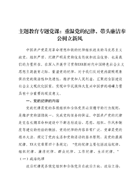 主题教育专题党课:重温党的纪律,带头廉洁奉公树立新风中国共产党是用革命理想和铁的纪律组织起来的马克思主义政党,组织严密、纪律严明是党的优良传统和政治优势,也是我们的力量所在。在深入开展学习贯彻XXX新时代中国特色社会主义思想主题教育之际,重温党的纪律,对于我们反对党内腐败现象保持党的纯洁性和先进性,维护党和人民利益,汇聚起全面建设社会主义现代化国家、实现中华民族伟大复兴中国梦的磅礴力量具有十分重要的现实意义。一、党的纪律的内容党的纪律是党的各级组织和全体党员必须遵守的行为规则,是维护党的团结统一、完成党的任务的保证。中国共产党的纪律是党在长期革命和建设中不断总结政治、思想、组织、作风和制度等建设的经验的概括。党的纪律的内容非常广泛,党章是党的根本大法,规定了党内生活和党的活动的基本原则,是党的最高纪律。XX大党章第四十条规定:党的纪律主要包括政治纪律、组织纪律、廉洁纪律、群众纪律、工作纪律、生活纪律。(一)政治纪律政治纪律是各级党组织和全体党员在政治方向、政治立场、政治言论和政治行为方面必须遵守的规则,是维护党的团结统一的根本保证。政治纪律严明,全党才能在政治上高度统一、行动上步调一致,才能团结带领全国人民夺取新时代中国特色社会主义新胜利。严明党的纪律,要把严明党的政治纪律和政治规矩排在首要位置。在党的纪律中政治纪律是最重要、最根本、最关键的纪律遵守党的政治纪律是遵守党的全部纪律的重要基础。不管违反哪方面纪律,任其发展,最终都会侵蚀党的执政基础,破坏党的政治纪律。《中国共产党纪律处分条例》的一个突出特点,就是把遵守政治纪律和政治规矩放在首要位置,以政治纪律为纲,带动其他纪律的执行,体现全面从严治党的要求。政治纪律的主要内容是:(1)党内各级组织和全体共产党员必须在坚持以经济建设为中心,坚持四项基本原则和改革开放两个基本点的基础上,坚定不移地贯彻执行党的基本路线,同党中央保持高度一致,决不允许各行其是;(2)党的思想建设、组织建设和纪律工作必须坚持贯彻执行为党的改革开放政策服务的方针;(3)各级党组织都要注意加强政治纪律教育,提高党员执行党的政治纪律的自觉性。其中同党中央保持高度一致,是一条最重要的政治纪律。违反政治纪律是危害最大的违纪行为,必须按照党章规定,严肃处理,直至开除出党。(二)组织纪律坚持党要管党、从严治党,是实现第二个百年奋斗目标和中华民族伟大复兴中国梦的根本保证。在党长期执政和全面依法治国进程中,全面从严治党,必须围绕坚持党的领导这个根本,注重依规依纪治党,切实加强党内监督。党的领导,很重要一方面就是体现在党的严密组织体系和强大组织能力上,党的力量来自组织,党的领导要靠组织。组织纪律是规范和处理党的各级组织之间、党组织与党员之间以及党员与党员之间关系的行为规则,是维护党的集中统一、保持党的战斗力的重要保证。XX大党章中明确规定的四个服从,既是党最基本的组织原则,也是最基本的组织纪律。个人对组织,少数对多数,下级对上级,全党对中央,服从是无条件的。组织、多数、上级、中央的决策正确时自然要服从;如不正确,或不完全正确,在行动上必须服从,同时应该按党章规定的权利,提出建议,或保留自己的意见。具体说来,党的组织纪律规定:(1)党员必须参加一个组织并在其中积极工作,执行党的决议和按期交纳党费;(2)党员个人服从党的组织,少数服从多数,下级组织服从上级组织,全党各个组织和全体党员服从党的全国代表大会和中央委员会;(3)党的各级领导机关,除他们派出的代表机关和在非党组织中的党组外,都由选举产生,并向选举产生他们的党代表大会或党员大会负责并报告工作;(4)党的上级组织要经常听取下级组织和党员群众的意见,及时解决他们提出的问题;(5)党的各级委员会实行集体领导和个人分工负责相结合的制度,凡属重大问题都要由党的委员会民主讨论,作出决定;(6)在党的纪律面前人人平等,党的领导人的活动必须处于党和人民的监督之下;(7)党内不允许搞派别组织,进行派别活动,也不允许在党外参加和支持非法组织和非法活动。(三)廉洁纪律廉洁纪律是党组织和党员在从事公务活动或者其他与行使职权有关的活动中,应当遵守的廉洁用权的行为规则,是实现干部清正、政府清廉、政治清明的重要保障。为政清廉才能取信于民,秉公用权才能赢得人心。XX大党章规定,中国共产党党员永远是劳动人民的普通一员。除了法律和政策规定范围内的个人利益和工作职权以外,所有共产党员都不得谋求任何私利和特权。党员领导干部必须正确行使人民赋予的权力,坚持原则,依法办事,清正廉洁,反对任何滥用职权、谋取私利的不正之风,永葆共产党人清正廉洁的政治本色。(四)群众纪律我们党的最大政治优势是密切联系群众,党执政后的最大危险是脱离群众。党在任何时候都把群众利益放在第一位,同群众高甘共苦,保持最密切的联系,坚持权为
