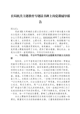 在局机关主题教育专题读书班上的党课辅导报告同志们:党的XX大明确提出要以县处级以上领导干部为重点对象在全党深入开展主题教育。在学习贯彻XXX新时代中国特色社会主义思想主题教育工作会议上,XXXXXX阐明了主题教育的重大意义、总体要求、主要内容、根本任务等,特别强调这次主题教育不划阶段、不分环节,要把理论学习、调查研究、推动发展、检视整改贯通起来,有机融合、一体推进,为全党开展主题教育指明了方向,提供了根本遵循。借此机会,由我为大家作一堂党课报告,与同志们共同交流。一、不划阶段、不分环节是新时代主题教育开展方式的创新划阶段、分环节曾是我们党开展党内集中教育的一贯做法把教育过程划分为几个阶段、规定每个阶段的详细目标和任务、对每个环节提出具体要求,能有效推进主题教育的规范开展,但同时也存在一定的弊端。如,一些地区和部门受限于阶段、环节要求,存在形式主义等倾向,疲于应付各阶段和环节的检查、督查,工作精力花在了填表、总结、汇报等文字材料的准备工作上,无暇深入抓具体工作。一些部门和单位甚至会出现以文件执行文件、以会议落实会议等现象,存在主题教育公式化、程式化倾向,用认认真真走形式,踏踏实实走过场的虚功代替了扎扎实实的成效。还有一些地区和部门为了完成各阶段各环节的目标要求,不得不均衡使力,而忽略了每一阶段、每一环节的实际需要,影响了主题教育的整体效果。本次主题教育坚持继承优良传统与创新方式方法相统一的原则,既重视对历史经验的继承发扬,又重视根据新的形势和现实情况进行适当的变革创新,跳出经验主义的藩篱。中国共产党历来强调一切从实际出发,实事求是,反对形式主义、官僚主义,更注重主题教育的内容和实际效果。基于此,以XXX同志为核心的党中央针对主题教育中过去存在的、将来可能出现的问题,前瞻性地提出了不划阶段、不分环节的要求。开展党的群众路线教育实践活动时,党中央要求不分阶段不搞转段;开展三严三实专题教育时,党中央强调不分批次、不划阶段、不设环节,不是一次活动;开展两学一做学习教育时,党中央提出学习教育不是一次活动,强调教育活动的常态化制度化;开展不忘初心,牢记使命主题教育时,党中央强调不划阶段、不分环节,要求把学习教育、调查研究、检视问题、整改落实四项重点措施贯穿全过程。本次主题教育强调不划阶段、不分环节,正是和新时代主题教育的系列要求一脉相承。在经过多次主题教育、党员干部思想认识都已经普遍提高的背景下,这次主题教育对教育方式作出重要创新,实现了对划阶段、分环节这一通常做法的变革,强调理论学习与基层调研相结合、问题导向与发展导向相结合、注重实践与追求实效相结合、教育成果与为民造福相结合,各个阶段、各个环节融会贯通,既统筹推进,又重点突破,把集中教育融入党员干部的日常学习工作,能够更好地提升教育实效。二、主题教育强调不划阶段、不分环节的重要价值主题教育作为党加强自身建设、永葆先进性纯洁性的重要举措,其内容与形式一直是在传承发扬优良传统的基础上,跟随新时代、新形势不断创新发展。这次主题教育在开展方式上强调不划阶段、不分环节,有机融合、一体推进,具有六个方面的重要价值。(一)有利于增强主题教育实效中国共产党历来重视力戒形式主义。XXXXXX在不忘初心,牢记使命主题教育工作会议上曾强调要力戒形式主义、官僚主义,以好的作风开展主题教育,对可能出现的各种形式主义,提前预判、有效防范、坚决克服。这次主题教育强调不划阶段、不分环节正是对形式主义的提前预判和防范,目的就是要引导广大党员干部戒虚求实,防止避重就轻,避免形式主义、官僚主义,确保教育质量,不为赶某个阶段时间、完成某个环节任务而匆忙走过场、做虚功。广大党员、干部要紧紧围绕新时代新征程党的中心任务,真抓实干、务求实效,聚焦问题、知难而进,要始终把解决实际问题、推动高质量发展、提高人民生活品质作为检验主题教育成效的重要标准。(二)有利于各地因地制宜坚持实事求是,是确保党内集中教育取得实效的关键,是需要始终遵循的重要原则。邓小平曾强调:教育一定要联系实际。XXXXXX也指出:这次主题教育不划阶段、不分环节,各地区各部门各单位要结合实际,创造性开展工作。开展主题教育,不同地区、不同单位面临的具体情况不同,所要解决的问题也不尽相同。不划阶段、不分环节,正是贯彻了实事求是、一切从实际出发的工作方法,不硬性规定时间节点、不简单强调前后顺序,不搞一刀切,鼓励各地运用灵活、多样、有效的方式开展教育。各地各单位可以结合自身实际情况,各有侧重、因地制宜,灵活规划本地本单位的主题教育。(三)有利于激发基层主动性尊重基层首创精神是历史唯物主义在具体实际工作中的突出要求,也是党在开展多次主题教育过程中提炼出的宝贵经验。XXXXXX指出,摸着石头过河和加强顶层设计是辩证统一的。在强调发