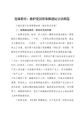 党课教育:维护党员形象做遵纪守法模范下面从两个层面讲讲如何维护党员形象一、加强政治修养,树信念坚定形象一是要有信仰。信仰,是人们对一种理论的真实性和一种实践的正确性的确认。一个党、一支军队如果没有政治信仰,就会失去精神支柱;一个党员、一名军人如果没有政治信仰,就等于失去了灵魂。我们每个党员脑子里要绷紧讲政治这根弦,用新时代中国特色社会主义理论体系特别是科学发展观武装头脑。二是要有信心。1921年7月,中国共产党13名代表在上海召开一大时,当时全国仅有50多名党员。现在,我们党已发展壮大到9671.2万党员。之所以,我们党能够从小到大,就是因为我们共产党人坚信着一个崇高的理想——实现共产主义。在当前提到共产主义,有的党员可能会觉得现在说早了,离我们还远,不如少喊些口号,踏踏实实干工作。这种想法,听起来好像有些道理,而实际上,这正是理想信念弱化、对实现共产主义信心不足的表现。在新时期加强政治修养,就是要在任何时候、任何情况下,都要辨明是非,坚定不移地做中国特色社会主义的忠诚捍卫者和积极建设者。三是要忠诚。《党章》明确规定,共产党员要对党忠诚老实,言行一致。对党忠诚,是党性坚强的重要标志。对于每个党员来说,这种忠诚最经常最直接的体现就是相信组织、依靠组织、服从组织。这也是共产党员必须坚持的一条组织原则。二、加强能力修养,树勤奋敬业形象能力素质是立身之本、成事之基。加强能力修养是增强党性树立共产党人勤奋敬业形象的现实需要。一是坚持在学习中提高。作为共产党员,必须持之以恒地读书学习。人的学习是有阶段性的,青年时期学习,优势在于记忆力好;中年时期学习,优势在于领悟力强。我们大多数党员都是年富力强,正处于领悟能力、运用能力、创造能力都很强的阶段易于学习;我们正处于知识日益更新、信息化迅猛发展的阶段,需要学习;我们肩负着建设现代化武警重任,要求严、标准高,必须学习。这就要求我们要有时不我待的紧迫感,坚持不懈地抓好学习。二是坚持在岗位中磨练。千淘万漉虽辛苦,吹尽狂沙始到金。共产党员加强能力修养,要敢于经受艰苦环境、复杂矛盾各种困难的锻炼和考验。越是艰苦的地方,越要刻苦工作;越是困难的工作,越要迎难而上。只有这样,才能使自己的思想更纯洁,党性更坚强,成长得更快;才能在党和人民需要的时候,义无反顾,勇往直前,不惜奉献自己的一切。工作岗位是实现理想抱负的最好平台,尽职尽责是加强党性修养的最佳途径。从党的好干部焦裕禄、孔繁森、郑培民、牛玉儒的身上,我们不难看出他们并没有轰轰烈烈的英雄壮举,只是把本职岗位作为履行职责使命的最好平台,从小处着眼,从点滴做起,扑下身子,真抓实干,在平凡中成就伟大,在实干中实现升华。三、加强道德修养,树和谐干事形象加强道德修养,要自觉做到三常:一是常怀感恩之情。感恩是中华民族的传统美德,也是加强道德修养的重要内容。看一个党员讲不讲修养,首先要看他念不念党恩。陈毅元帅说过:第一想到不忘本,来自人民莫作恶;第二想到党培养,无党岂能有作为;第三想到衣食住,若无人民岂能活。作为党员应该时刻想一想:自己能从一名普通青年,来到部队,入了党、转了士官,有的还走上了领导岗位,除了要牢记父母的养育之恩,还要牢记组织的教育引导之恩,提供良好学习、工作环境的栽培之恩,给予荣誉、奖赏的激励之恩,帮助解决切身利益问题的关怀之恩,乃至批评劝诫、处分的挽救之恩等等。二是常有知足之感。知足者常乐,贪婪者常悲。这是中国传承千年的古训,也是人们求得心理平衡的一剂良药。孔繁森同志说过:老是把自己当珍珠,就时常有怕被埋没的痛苦;要把自己当泥土,让众人把你踩成路,就绝不会埋没。我们要保持一颗平常心,以平和的心态、豁达的胸怀处理得失,以奉献精神,不为名所累、不为利所缚。如果要说不知足,应当是工作上的不足,道德修养上的不足,知识才能上的不足。三是常修友善之心。友善,是指善良、关爱、友好等,是人与人之间的一种美好心灵、美好情感、美好愿望。从古到今,人们对善都是倍加推崇、竭尽赞美。比如,《三字经》,开篇即是人之初,性本善。共产党员,要把与人为善作为一种品质,对他人要友好、要关心、要爱护,同时对他人的误会、过失要宽宏大量。一个不善于团结他人、关心他人、帮助他人的人,自己肯定也不快乐、不成功;而那些能够很好的和别人共事,团结一心干事业的人,最终成就了别人,也成功了自己。下面我从两个方面谈一谈如何做遵纪守法模范遵守纪律是对党忠诚的内在要求和重要保证。对于党员来讲最基本的就是要强化严格自律意识,自觉把党纪国法和军队的条令条例、规章制度作为自己的行为规范和准则。四、为什么要遵纪守法依法治国,是我们国家的基本治国方略,遵纪守法,既是我军的光荣传统,和战斗力生成之本,军威所在,也是确保官兵一生平安、发展顺利和实现个人理想前途的重要保证。(一)
