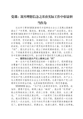 党课:筑牢理想信念之基在实际工作中彰显担当作为这次学习贯彻XXX新时代中国特色社会主义思想主题教育提出了学思想、强党性、重实践、建新功的总要求,通过教育把XXX新时代中国特色社会主义思想转化为坚定理想、锤炼党性和指导实践、推动工作的强大力量,使全党始终保持统一的思想、坚定的意志、协调的行动、强大的战斗力,努力在以学铸魂、以学增智、以学正风、以学促干方面取得实实在在的成效。这对于我们共产党员筑牢理想信念之基、补足精神之钙、强化担当作为,提出了新的更高的要求。作为一名党员、干部就是要通过主题教育强基固本、激发干劲,在实际工作中发挥先锋模范作用,奋力谱写中国式现代化做出应有贡献。一、理想信念是共产党人精神上的钙每一名共产党员都是党组织的一个重要分子,党的理想信念要靠千万名党员来坚守和践行,党的路线方针政策要靠千万名党员来推动实现。思想建设是党的基础性建设,共产党员的坚定理想信念是落实党的XX大精神和任务部署的重要思想政治基础,要把坚定理想信念作为共产党员思想建设的首要任务。中国共产党人的理想信念就是马克思主义真理信仰、共产主义远大理想和中国特色社会主义共同理想。这是中国共产党人的精神支住和政治灵魂,也是保持党的团结统一的思想基础。XXXXXX指出:共产党人如果没有信仰、没有理想,或信仰、理想不坚定,精神上就会缺钙,就会得软骨病,就必然导致政治上变质、经济上贪婪、道德上堕落、生活上腐化。历史和实践反复证明,一个政党有了远大理想和崇高追求,就会坚强有力、无坚不摧、无往不胜,就能经受一次次挫折而又一次次奋起。长征中的红军在数十倍敌军围追堵截的情况下,能够突破湘江、四渡赤水、抢渡大渡河、爬雪山过草地,胜利实现与陕北红军会师,又在数十倍优势装备之敌围困延安的形势下取得最后胜利,靠得就是革命理想焕发的强大精神、意志和动力。反观苏共,在有20万党员时夺取了政权,在有200万党员时取得了反法西斯战争胜利,却在拥有2000多万党员时丢掉了政权。其根本原因就是后来苏共大多数党员抛弃了共产主义远大理想、丢掉了社会主义共同理想,党员干部私欲膨胀、腐化堕落,导致党组织涣散、人心涣散所致。二、崇高理想是共产党人的政治灵魂中国共产党从诞生之日起,就把马克思主义写在自己的旗帜上,把实现共产主义确立为最高理想。在我们党九十多年的奋斗历程中,无数共产党员不惜流血牺牲,靠的就是这种信仰,为的就是这个理想。尽管他们也知道,自己追求的理想并不会在自己手中实现,但他们坚信,只要一代又一代人为之持续努力,一代又一代人为此做出牺牲,崇高的理想就一定能够实现。1921年,浙江嘉兴南湖的红船上,一群共产党员冒着生命危险召开了中共一大,确立了党实现共产主义的最高纲领,把民族解放、人民幸福、国家富强写在自己的旗帜上,作为矢志不渝的奋斗目标;大革命时期,成千上万的共产党员为了反帝、反封建、实现中国人民的民主自由,流血牺牲;抗日战争中,无数中华儿女在抗日前线的烽火中浴血奋战、救亡图存;解放战争和抗美援朝战争中,为了中国人民的解放事业和民族独立,无数英烈坚持将革命进行到底、以大无畏的牺牲精神与世界上的头号强敌殊死作战;改革开放初期,为了拨乱反正,以邓小平同志为代表的共产党人顶着可能再次被打倒的风险,坚持实事求是、组织全党开展真理的大讨论;改革开放以来,我们党领导全党和全国人民与时俱进建设和科学发展中国特色社会主义;新时代,以XXX同志为核心的党中央带领我们冲破重重困难、顶住各种压力,步入了中国特色社会主义新时代,深入开展了伟大斗争、伟大工程、伟大事业、伟大梦想新征程。在党和国家革命、建设的历史长河中,李大钊、杨靖宇、江竹筠、黄继光、雷锋、焦裕禄、孔繁森、张富清、屠呦呦、杜富国等无数时代英雄楷模的英勇牺牲和无私奉献,向我们一次次地展现了共产党人的崇高理想信念。任何一名在党旗下宣过誓的共产党员都必须铭记,为了理想信念,就应该去拼搏、去奋斗、去献出自己的全部精力乃至生命。当前,大多数党员理想信念是坚定的,政治上是可靠的。同时,在我们的党员队伍中也有人对共产主义心存怀疑,认为那是虚无缥缈、难以企及的幻想;有的不信马列信鬼神,从封建迷信中寻找精神寄托;有的甚至盲目崇拜西方社会制度和价值观念,对社会主义前途命运丧失信心等等。我们要充分看到,改革开放以来,中国特色社会主义事业蒸蒸日上,我国经济快速发展、人民生活富裕、军队建设和国防实力大幅跃升,令世界瞩目;大国地位不断提高,全国人民对中国特色社会主义的道路自信、理论自信、文化自信、制度自信更加坚定,获得感、幸福感不断增强;我国的经济总量已经稳稳跃居世界第二;一带一路倡议得到世界普遍称赞,建立人类命运共同体思想得到广泛响应。实践一再证明,中国共产党的领导是完全正确的,中国特色社会主义展现出伟大时代的光芒。2019年,XXX主