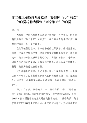 第二批主题教育专题党课:将拥护两个确立的自觉转化为做到两个维护的自觉同志们:大家好!今天我要讲的主题是将拥护两个确立的自觉转化为做到两个维护的自觉。在开始今天的课程之前,我想先和大家分享一个小故事。在红军长征过程中,有一位普通的红军战士,他叫张思德。他在一次战斗中腿部中弹,但他依然坚持跟随部队前进。在长征途中,他主动承担起照顾伤员的任务,为他们抬担架、送食物。当他自己的伤口感染时,他却选择了隐瞒,继续为战友们服务。最终,他因为伤势过重而牺牲。这个故事虽然简单,但它却蕴含着一个深刻的道理:一个真正的共产党员,应该始终把党和人民的利益放在第一位,无论在什么情况下,都要坚定地拥护党的领导,坚决地做到两个维护。那么,什么是两个确立和两个维护呢?两个确立是指:确立XXX同志党中央的核心、全党的核心地位,确立XXX新时代中国特色社会主义思想的指导地位。两个维护是指坚决维护XXXXXX党中央的核心、全党的核心地位,坚决维护党中央权威和集中统一领导。为什么要将拥护两个确立的自觉转化为做到两个维护的自觉呢?这是因为,两个确立和两个维护是相辅相成、相互联系的。只有坚定地拥护两个确立,才能真正做到两个维护;只有坚决地做到两个维护,才能更好地拥护两个确立。在当前正在开展的学习贯彻XXX新时代中国特色社会主义思想主题教育中,我们要以高度的政治自觉、思想自觉和行动自觉,将拥护两个确立的自觉转化为做到两个维护的自觉。我们要深刻领悟两个确立的决定性意义,不断增强四个意识、坚定四个自信、做到两个维护,始终在思想上政治上行动上同以XXX同志为核心的党中央保持高度一致。要做到这一点,我们需要从以下几个方面入手:一、发挥政治建设的统领作用,坚决拥护XXX同志党中央的核心、全党的核心地位自觉拥护两个确立,必须坚持以政治建设为统领,增强四个意识,自觉做到两个维护。党的XX大报告指出:健全总揽全局、协调各方的党的领导制度体系,完善党中央重大决策部署落实机制,确保全党在政治立场、政治方向、政治原则、政治道路上同党中央保持高度一致,确保党的团结统一。党的十八大以来,党在自我革命和社会革命良性互动中确立了两个维护。广大党员必须强化核心意识,深刻领会两个维护的重大现实意义,并将其内化于心、外化于行,绝不能仅仅将其作为表决心的政治口号。一是要加强党员党性修养。党内政治生活是提高党员政治素质的重要平台。新时代,为了加强和改进党内政治生活,尤其是规范党员言行,党中央陆续出台了一系列党内法规,有法可依、有规可循是加强和改善党内政治生活的现实保障,广大党员必须牢固树立规则意识和底线思维,坚决贯彻落实党中央决策部署。二是要在实践中加强政治历练。进入新时代,党带领人民开展具有许多新的历史特点的伟大斗争,广大党员要自觉树立斗争意识、奋斗意识,主动参与斗争实践,在繁杂工作中淬炼自身的政治能力,克服自身的本领恐慌,在大是大非面前保持政治定力三是要净化党内政治生态。拥护两个确立、做到两个维护需要风清气正的政治生态,必须加强党内政治文化建设,净化政治生态。中国共产党在100多年的奋斗历程中确立了坚定共产主义理想信念、坚持马克思主义指导地位、坚决执行党的路线方针政策的传统政治文化,这为加强党的政治生态建设奠定了良好的思想基础。新时代,必须大力传承和弘扬党的优良政治传统重塑党的政治生态环境,通过价值引领、制度规范、纪律约束,引导广大党员树立正确的价值观,提升自身的政治判断力,保持自身的政治定力,在歪风邪气面前岿然不动。二、立足思想建设的引领功能,建立对领导核心和指导思想的高度认同思想是实践的先导,认知决定行动。在行动上自觉拥护两个确立,将其内化于心、外化于行的前提是在思想上高度认同两个确立,形成对两个确立的科学认知。一方面,要自觉维护XXX同志党中央的核心、全党的核心地位,坚定理想信念。理想信念不是空洞的口号,更不是虚无缥缈的目标,坚定的理想信念对于中国共产党人而言好比精神上的钙,没有理想信念,或者理想信念不坚定,精神上就会缺钙,就会得软骨病,就可能导致政治上变质、经济上贪婪、道德上堕落、生活上腐化。理想信念是中国共产党人安身立命的根本。一代代中国共产党人不怕牺牲、不怕苦难,在革命、建设、改革不同阶段实现一个又一个奋斗目标,靠的是坚定的理想信念,靠的是马克思主义、共产主义的真理力量,必须加强对马克思主义的学习,加强对中国共产党100多年奋斗历程的学习,运用马克思主义立场观点、方法科学对待中国共产党在100多年奋斗历程中形成的优良传统,将理想信念自觉转化为维护领导核心的自觉。新时代,XXX亲自谋划、亲自部署关涉中国特色社会主义事业发展全局的重大战略举措,以