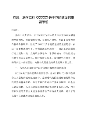 党课:深学笃行XXXXXX关于党的建设的重要思想同志们:党的十八大以来,以XXX同志为核心的党中央坚持和加强党的全面领导,坚持党要管党、全面从严治党,开辟了百年大党自我革命新境界,形成了XXXXXX关于党的建设的重要思想。在这一重要思想指引下,全党思想上更加统一、政治上更加团结、行动上更加一致,党的政治领导力、思想引领力、群众组织力、社会号召力显著增强。新时代新征程上,我们要学习领会、贯彻落实这一重要思想,为推动党的建设高质量发展贡献力量。一、马克思主义建党学说中国化时代化的最新成果XXXXXX关于党的建设的重要思想,是XXX新时代中国特色社会主义思想的重要组成部分,是新时代党的建设理论发展和实践经验的科学总结,标志着我们党对共产党执政规律、社会主义建设规律、人类社会发展规律的认识达到了新的高度,为丰富和发展马克思主义建党学说作出了新的重大贡献,树立了马克思主义党建理论发展的新高度。党的建设重大时代课题的深刻回答。每个时代都有属于自己的问题,每个时代的主要问题构成重大时代课题。对重大时代课题的思考和回答是马克思主义理论不断发展的驱动力。毛泽东思想中的党建理论,成功解决了在半殖民地半封建的东方落后大国,怎样建设一个具有广泛群众性的无产阶级政党的时代课题,成为世界政治史上罕见的壮举,并就党如何在执政条件下领导社会主义革命和建设进行了探索。邓小平同志党的建设理论,科学回答了在改革开放和社会主义现代化建设条件下建设一个什么样的党、怎样建设党的时代课题,为改革开放新时期加强和改善党的领导、搞好党的建设提供了科学引领。以江泽民同志为主要代表的中国共产党人和以胡锦涛同志为主要代表的中国共产党人,在形成三个代表重要思想和科学发展观过程中,继续回答解决新的历史条件下建设什么样的党、怎样建设党的时代课题,为在新的历史起点上加强党的建设提供了行动指南。党的十八大以来,以XXX同志为核心的党中央紧密结合世情国情党情发生深刻变化的新实际,顺应实现中华民族伟大复兴的时代要求全面从严治党,科学回答了建设什么样的长期执政的马克思主义政党、怎样建设长期执政的马克思主义政党的重大时代课题,为全面推进新时代党的建设新的伟大工程提供了强大思想武器。马克思主义建党学说的重大原创性贡献。XXXXXX关于党的建设的重要思想,深刻总结世界社会主义运动的经验教训,正确把握马克思主义执政党建设规律,既与前人的理论创造一脉相承,又在新的基础上提出了一系列原创性的新理念新思想新战略。在党的建设地位上,明确党的建设新的伟大工程在四个伟大中的战略定位,指出伟大斗争、伟大工程、伟大事业、伟大梦想,其中起决定性作用的是党的建设新的伟大工程;在党的建设总要求上,把坚持和加强党的全面领导作为第一条,提出中国特色社会主义最本质的特征是中国共产党领导,中国特色社会主义制度的最大优势是中国共产党领导,坚持党中央集中统一领导是最高政治原则,党的领导制度是我国的根本领导制度;在党的建设内容上,强调旗帜鲜明讲政治,既是马克思主义政党的鲜明特征,也是我们党一以贯之的政治优势,党的政治建设决定党的建设方向和效果,鲜明提出以党的政治建设统领党的建设各项工作;在党的建设布局上,构建了全面推进党的政治建设、思想建设、组织建设、作风建设、纪律建设,把制度建设贯穿其中,深入推进反腐败斗争的布局;在党的建设路径上,提出依靠党的自我革命跳出历史周期率,全面从严治党是新时代党的自我革命的伟大实践,时刻保持解决大党独有难题的清醒和坚定,坚持制度治党、依规治党,贯彻新时代党的组织路线,全方位培养用好人才,以严的基调强化正风肃纪反腐,等等。世界政党治理的中国智慧。XXXXXX关于党的建设的重要思想,指引全党以理论武装凝心铸魂,以整饬作风激浊扬清,以严明纪律强化约束,以从严治吏匡正用人导向,以零容忍态度惩治腐败,党的建设开创新局面,推动中国之治呈现新气象,让我们这个世界上最大的政党历经百年而风华正茂、饱经磨难而生生不息,成为全球政党治理的成功典范。这一重要思想,打破了对西方政党制度的迷思,以崇高的价值取向、独特的思想魅力、高度的历史自觉,为世界马克思主义政党建设和科学社会主义运动注入了强大动力和信心决心,为人类对更好社会制度的探索提供了中国经验、中国智慧。二、新时代管党治党、兴党强党的科学理论体系XXXXXX关于党的建设的重要思想,坚持历史和现实相贯通、管党治党和治国理政相关联、理论和实际相结合,构成了一个全面系统、逻辑严密、内涵丰富、思想深邃的科学理论体系,是管党治党、兴党强党的大思路、大布局、大战略,必须全面理解、整体把握。党的十八大以来,XXXXXX围绕建设什么样的长期执政的马克思主义政党、怎样建设长期执政的马克思主义政党的重大时代课题,突出全面从严治党这个主题主线,提出一系列管党、兴党、强党的新理念新思想新战略,