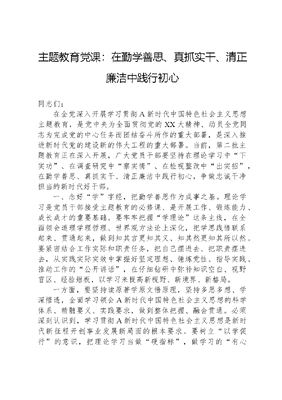 主题教育党课:在勤学善思、真抓实干、清正廉洁中践行初心同志们:在全党深入开展学习贯彻A新时代中国特色社会主义思想主题教育,是党中央为全面贯彻党的XX大精神、动员全党同志为完成党的中心任务而团结奋斗所作的重大部署,是深入推进新时代党的建设新的伟大工程的重大部署。当前,第二批主题教育正在深入开展,广大党员干部要坚持在理论学习中下实功、在调查研究中察实情、在检视整改中出实招,在勤学善思、真抓实干、清正廉洁中践行初心,争做忠诚干净担当的新时代好干部。一、念好学字经,把勤学善思作为成事之基。理论学习是党员干部接受主题教育的必修课、是开展工作、锻炼能力、成长成才的重要基础。要牢牢把握学理论这条主线,在全面领会道理学理哲理、世界观方法论上深化,把学思践悟联系起来、贯通起来,做到知其言更知其义、知其然更知其所以然。要紧密结合工作实际和职责任务,把自己摆进去、把职责摆进去,从实践实际实效中掌握好坚定理想、锤炼党性、指导实践、推动工作的公开讲话,在仔细钻研中弥补知识空白、视野盲区、经验短板,以学习来提高新视野、新境界、新格局。一方面,要坚持读原著学原文悟原理,坚持多思多想、学深悟透,全面学习领会A新时代中国特色社会主义思想的科学体系、精髓要义、实践要求,做到整体把握、融会贯通。必须深刻认识到,学习贯彻A新时代中国特色社会主义思想是新时代新征程开创事业发展新局面的根本要求。要树立以学促行的意识,把理论学习当做硬指标,做学习的有心人,提高理论学习的主动性,加强理论知识、专业知识、专业能力学习,增强自己的理论结合实际的能力;同时也要在无字处学习,学习他人高尚的品德修养,丰富的为民服务经验,做到学进心里、学到实处。另一方面,组织部门制订学习计划要立足能够学用结合,探索出适合当地干部的学习与实践的结合点、着力点,引领干部围绕工作目标、实际要求进行多角度、多方位思考,把理论学习和个人工作实际结合,把学习与本职工作联系起来,不断运用理论分析、解决实际问题,在疫情防控、脱贫攻坚成果巩固、乡村振兴、基层治理等一线工作中开拓视野、转变思路,将学习成果切实转化为推动工作的动力和成效,更好为人民群众服务,做到学以致用、学用相长,达到学思用贯通、知信行统一,让思想和本领不落伍,面对工作能游刃有余,不断适应新时代新形势新要求。二、念透实字经,把真抓实干作为履职之道。AXXX在江西考察时指出:要把实的要求贯穿主题教育全过程,坚决防止和克服形式主义、官僚主义,实实在在抓好理论学习和调查研究,实实在在检视整改突出问题,实实在在办好惠民利民实事,用实干推动发展、取信于民。这一重要要求为我们高标准高质量开展好第二批主题教育指明了正确方向、提供了根本遵循。大道至简,实干为要。年轻干部要坚持人民至上的理念,把等着干变为主动干,把要我做变为我要做,用真心实干换取百姓的真情实意。要始终保持钉钉子精神,不务虚功、埋头苦干,强化服务意识,践行初心使命,以功成不必在我,功成必定有我的政治担当,把惠民生的事办实、暖民心的事办细、顺民意的事办好,不断提升想干事、能干事、敢干事的能力,用实干谱写青春答卷。一要提升专业素养,淬炼实干本领。刀不磨要生锈,人不学要落后。年轻干部正处于积累经验、增强本领的黄金时期,应该把淬炼实干本领作为首要任务,作为一种责任、一种精神追求、一种生活方式,用真刀真枪锤炼能力,矢志在经风雨见世面中增长才干、提升能力、扛起重担,少点空表态,多些实干劲,少当传声筒,争当行动派,坚持在干中学、学中干,学以致用,用以促学,推动学习成果转化为斗争的本领、担当的后劲,在学思践悟中善作善成,多练就干事创业的实招、新招、硬招,掌握攻坚克难的本领,真正做到想干事、能干事、干成事。二要牢记初心使命,践行实干作风。大道至简,实干为要为政贵在行,以实则治。年轻干部应当以自我革命的精神切实践行实干作风,密切联系群众,求真务实,以实干赢民心、聚民力、谋发展,让实干成为年轻干部的标配标签。年轻干部要肩负起重任,违反纪律的事坚决不做,违反纪律的话坚决不说,耕好属于自己的责任田,知责于心、担责于身。摒弃给我上的官僚作风,强化跟我上的担当气魄,勇于把实干担当扛在肩上,把清正廉洁刻在心里,把无私奉献融入血脉,推动各项工作干在实处,走在前列。三、念准廉字经,把清正廉洁作为立身之本。廉洁自律,是党员干部的立身之本、处世之道和为政之要。学习贯彻A新时代中国特色社会主义思想主题教育,总要求中的强党性以及廉洁奉公树立新风的具体目标,对党员干部的廉洁自律提出了新的要求。广大党员干部要通过主题教育,锤炼党性、提升作风,拧紧世界观人生观价值观的总开关,着力解决廉洁自律方面的突出问题。贪欲无度,牢狱自筑