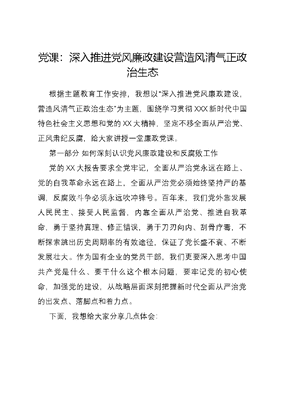 党课:深入推进党风廉政建设营造风清气正政治生态根据主题教育工作安排,我想以深入推进党风廉政建设,营造风清气正政治生态为主题,围绕学习贯彻XXX新时代中国特色社会主义思想和党的XX大精神,坚定不移全面从严治党、正风肃纪反腐,给大家讲授一堂廉政党课。第一部分 如何深刻认识党风廉政建设和反腐败工作党的XX大报告要求全党牢记,全面从严治党永远在路上、党的自我革命永远在路上,全面从严治党必须始终坚持严的基调,反腐败斗争必须永远吹冲锋号。百年来,我们党外靠发展人民民主、接受人民监督,内靠全面从严治党、推进自我革命,勇于坚持真理、修正错误,勇于刀刃向内、刮骨疗毒,不断探索跳出历史周期率的有效途径,保证了党长盛不衰、不断发展壮大。作为国有企业的党员干部,我们更要深入思考中国共产党是什么、要干什么这个根本问题,要牢记党的初心使命,加强党的建设,从战略层面深刻把握新时代全面从严治党的出发点、落脚点和着力点。下面,我想给大家分享几点体会:一是深刻认识反腐败是最彻底的自我革命重要论述。XXXXXX在党的XX大报告中强调,腐败是危害党的生命力和战斗力的最大毒瘤,反腐败是最彻底的自我革命。只要存在腐败问题产生的土壤和条件,反腐败斗争就一刻不能停,必须永远吹冲锋号,坚持不敢腐、不能腐、不想腐一体推进,以零容忍态度反腐惩恶,绝不姑息。他从六个方面深刻阐述了全面从严治党和勇于自我革命的内在关系,为我们在新征程上推进自我革命、从严管党治党指明了方向、提供了遵循。二是深刻认识反腐败永远在路上重要论述。当前腐败和反腐败较量还在激烈进行,呈现四个任重道远的阶段性特征。将反腐败斗争进行到底,关键是要把严的主基调长期坚持下去,保持反腐败政治定力,做到态度不变、决心不减、尺度不松。廉政工作会议指出,要保持高度的政治敏锐性和鉴别力,推动政治监督具体化、常态化,持续加固中央八项规定精神的堤坝。我们行业涉及面广、资金量大、环节多,是腐败的高发地,廉政风险点特别多。新形势下监督已经成为常态,大家要习惯在监督下工作,善于在监督中改进工作,要认识到政治监督常态化是对大家的爱护。许多人都是在没有监督、没有提醒的情况下走上违纪违法道路的,事后才追悔莫及。同时,领导干部还要重视家教家风,以身作则管好配偶、子女,本分做人、干净做事。要带头落实关于加强新时代廉洁文化建设的意见,提高党性觉悟,增强拒腐防变能力,增强政治敏锐性和政治鉴别力。年轻干部要有清醒的认识,要加强自我监督、教育,要经常对照党的理论和路线方针政策、对照党章党规党纪、对照初心使命,看清一些事情该不该做、能不能干,守住拒腐防变的底线。三是深刻认识坚持严的主基调不动摇重要论述。要把严的主基调长期坚持下去,绝不能滋生已经严到位的厌倦情绪。就我们自身行业来说,当前在涉及项目建设、工程招投标、营销管理、物资采购等权力集中、资金密集领域的廉洁风险防控形势依然严峻。我们必须清醒地认识到,加强党风廉政建设,是每一名党员干部都务必时刻坚持的方针和原则,只有一寸不让地抓党风廉政建设,坚持监督执纪无禁区全覆盖零容忍,才能塑造好风清气正的政治生态。事实上,纪委也一直在释放落实中央八项规定精神越往后盯得越紧、执纪越严的强烈信号,党支部也一直高度重视党风廉政建设。截至目前,公司党风廉政建设形势总体向好,但是,对标中央及上级党委的要求以及从巡察反馈问题、日常监督情况来看,我们还有一定的差距。当前,正值全年业绩指标冲刺的关键时期,我们面临的任务十分艰巨繁重,更需要保持正确的政治方向,更需要一支忠诚、干净、担当的党员干部人才队伍,更需要一个风清气正的事业发展环境。第二部分 如何贯彻落实党风廉政建设和反腐败工作下面,就如何贯彻落实XX大精神及上级领导指示批示精神,扎实推进公司党风廉政建设和反腐败工作,我讲几点想法。一是要在增强政治敏锐性和政治鉴别力上下功夫。作为国有企业干部,要增强政治敏锐性和政治鉴别力,要做到亲不逾矩、清不远疏、公正无私、有为有畏。要持续开展党性教育、警示教育、案例教育,要结合行业实际,用大家喜闻乐见的方式,庖丁解牛般地为大家分析案例问题根源,制定案例库、错题集,从而增强大家的政治敏锐性和鉴别力。要坚持问题导向,聚焦近年来巡视巡察、审计反馈、信访举报等发现的各类问题,总结经验,综合运用批评教育、谈话提醒等方式做实日常监督,开展重点岗位人员谈心谈话,多做红脸出汗、咬耳扯袖、批评与自我批评的工作。要立足职能,突出对重大项目、重点领域、专项工作的专项督查,分析业务风险,梳理廉政风险点,加强廉政风险防控,深入推进廉政风险防控全覆盖,加强对执行情况的监督检查、跟踪问效,层层压实责任,提升风险防控效果。二是要在强化制度建设上下功夫。近年来,集团党委在规范监督执纪方面出台了一系列管理办法,我们要在认真学习传达的基础上,也要