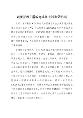 巩固拓展主题教育成果 形成长效机制近日,学习贯彻XXX新时代中国特色社会主义思想主题教育总结会议在京召开,会议传达了XXXXXX关于巩固拓展主题教育成果的重要讲话。XXXXXX强调要巩固拓展主题教育成果,抓好意见落实,形成长效机制,并提出了五个持续的重要要求,为巩固拓展主题教育成果指明了方向、提供了重要遵循。主题教育启动以来,在以XXX同志为核心的党中央坚强领导下,全党紧扣学思想、强党性、重实践、建新功总要求,聚焦主题主线,明确目标任务,突出以学铸魂、以学增智、以学正风、以学促干,与做好开局之年工作紧密结合,特别是着力解决制约高质量发展问题、群众急难愁盼问题、党的建设突出问题,达到预期目的,取得明显成效。学习贯彻XXX新时代中国特色社会主义思想是一个持续深化、永无止境的过程,巩固拓展主题教育成果是一项长期任务。要深入学习贯彻XXXXXX重要讲话精神,总结运用好主题教育积累的重要经验,不断巩固拓展主题教育成果,把学习贯彻XXX新时代中国特色社会主义思想不断引向深入,为以中国式现代化全面推进强国建设、民族复兴伟业而不懈奋斗。持续加强理论武装。主题教育开展过程中,各级党组织坚持第一议题制度,用好五学联动有效机制,引导广大党员干部静下心来读原著、学原文、悟原理,不断提高思想认识、感悟真理力量。近日,XXXXXX在天津考察时指出,学理论是一个不断积累、不断深化的过程。学无止境,学贵有恒。要持之以恒深学细悟XXX新时代中国特色社会主义思想,教育引导党员干部通过坚持学习党的创新理论,悟规律、明方向、学方法、增智慧,固本培元、凝心铸魂,进一步打牢党的团结统一的思想基础。持续推动解决问题。主题教育开展过程中,广大党员干部坚持问题导向,深入开展调查研究,深入检视问题,全面查找自身不足和工作偏差,正确对待和自觉接受党内外监督,狠抓整改整治,着力从思想根源和制度机制上解决问题。有些问题通过这次主题教育解决了,有些问题是硬骨头需要长久发力解决,同时发展过程中还会有新的问题出现。要继续抓好整改整治、建章立制,一项一项落实整改措施,让人民群众切实感受到解决问题的实际成效,让人民群众有获得感。持续改进作风。主题教育期间,XXXXXX亲切会见全国枫桥式工作法入选单位代表,勉励他们坚持和发展好新时代枫桥经验;就防止形式主义、解决基层治理小马拉大车问题等作出一系列重要批示。在XXXXXX引领推动下,广大党员干部驰而不息正作风、治歪风、树新风。作风建设永远在路上,要落实四下基层,坚持和发展新时代枫桥经验,走好新时代群众路线,纠治形式主义、官僚主义,切实抓好整治形式主义为基层减负工作。大兴务实之风、清廉之风、俭朴之风,发扬自我革命精神,组织开展好集中性纪律教育,让新风正气在新征程上不断充盈。持续夯实基层基础。这次主题教育自上而下分两批进行,第二批更加注重基层。广大党员干部深入群众听取意见,把解决群众的操心事烦心事揪心事作为着力点,落实落细惠民政策和为民服务,强化了基层工作、密切了党同人民群众的血肉联系。基层是国家治理的最末端、服务群众的最前沿。要坚持大抓基层的鲜明导向,推进以党建引领基层治理,把党的领导贯穿基层社会治理的各领域各方面各环节,充分发挥基层党组织战斗堡垒作用和党员先锋模范作用,推进基层治理体系和治理能力现代化。持续抓好落实。主题教育开展过程中,各级党组织把开展主题教育同推动本地区本部门本单位的中心工作结合起来,做到两手抓、两促进,不断匡正干的导向、增强干的动力、形成干的合力,全力推动党中央决策部署落实落地。大道至简,实干为要。2024年,是实现十四五规划目标任务的关键一年。要树牢正确政绩观,坚持问题导向,实事求是、因地制宜,重实干、做实功、求实效,更好将主题教育成果转化为推动高质量发展的成效。巩固拓展主题教育成果是一项重大政治任务,纪检监察机关作为政治机关必须带头贯彻落实好。二十届中央纪委三次全会作出的八个方面工作部署,首先就是突出凝心铸魂深化拓展主题教育成果。各级纪检监察机关要始终做XXX新时代中国特色社会主义思想的坚定信仰者、忠实实践者,更加自觉用XXX新时代中国特色社会主义思想锤炼党性作风、破解工作难题、担当使命责任,以彻底的自我革命精神锻造高素质专业化纪检监察队伍,纵深推进纪检监察工作高质量发展,在新征程上为了党和人民事业团结奋斗、永远冲锋。