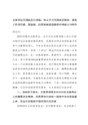 支部书记全国两会宣讲稿:深入学习全国两会精神,强化工作责任感、紧迫感,以优异成绩迎接新中国成立75周年同志们:刚刚闭幕的全国两会,对于动员全国各族人民以中国式现代化全面推进强国建设、民族复兴伟业而团结奋斗具有十分重要的意义。今年全国两会是在庆祝中华人民共和国成立75周年、实现十四五规划目标任务关键一年召开的重要会议,是一次高举旗帜、真抓实干、团结奋进的大会。学习贯彻XXXXXX重要讲话和全国两会精神是当前和今后一个时期的重大政治任务。我们要把智慧和力量凝聚到落实全国两会确定的各项目标任务上来,凝聚到推动重点工作、落实重点任务上来,自信自强、同心同德,埋头苦干、奋勇前进,为推进中国式现代化建设汇聚强大力量以优异成绩迎接新中国成立75周年。下面,围绕全国两会精神,以及如何抓好贯彻落实,与大家进行交流分享。一、深刻学习领会、全面贯彻落实XXXXXX在全国两会上的重要讲话精神,把思想和行动统一到党中央决策部署上来,坚定扎实推进中国式现代化实践XXXXXX在会议期间发表一系列重要讲话,充分体现了对国际国内形势的科学判断,对强国建设、民族复兴伟业的深远思量,为我们深入领会党中央决策部署、准确把握全国两会精神、谱写中国式现代化四川新篇章,提供了方向指引和根本遵循。《政府工作报告》明确了今年经济社会发展的各项目标任务,提出了一揽子有力度、有温度的重大政策举措。全国政协常委会工作报告贯穿守正创新团结奋进主线,许多新亮点、新做法值得深入学习借鉴要深入学习宣传贯彻全国两会精神,认真学习XXXXXX重要讲话精神,深刻领会关于国际国内形势的科学判断,关于因地制宜发展新质生产力、全面提升新兴领域战略能力、谋划进一步全面深化改革、促进区域协调发展、抓好安全生产、巩固拓展主题教育成果以及对做好人大、政协工作提出的重要要求,坚决把思想和行动统一到XXXXXX重要讲话和全国两会精神上来。第一,深刻领会过去一年党和国家事业发展取得的重大成就,坚定推进全市经济社会高质量发展的信心和决心更加坚定拥护两个确立、坚决做到两个维护。过去一年,在以XXX同志为核心的党中央坚强领导下,经过全国上下共同努力,我国发展成就非凡、可圈可点,新征程迈出坚实步伐,续写了新的时代篇章。成绩来之不易,根文可居文库——海量学习资料,手机电脑均可下载www.wenkeju.com本在于XXXXXX领航掌舵,在于XXX新时代中国特色社会主义思想科学指引。要深刻领悟两个确立的决定性意义,增强四个意识、坚定四个自信、做到两个维护。经济总体回升向好。国内生产总值超过126万亿元,增长5.2%,增速居世界主要经济体前列。城镇新增就业1244万人,城镇调查失业率平均为5.2%。居民消费价格上涨0.2%。国际收支基本平衡。现代化产业体系建设取得重要进展。传统产业加快转型升级,战略性新兴产业蓬勃发展,未来产业有序布局,先进制造业和现代服务业深度融合,一批重大产业创新成果达到国际先进水平。国产大飞机C919投入商业运营,国产大型邮轮成功建造,新能源汽车产销量占全球比重超过60%。科技创新实现新的突破。国家实验室体系建设有力推进。关键核心技术攻关成果丰硕,航空发动机、燃气轮机、第四代核电机组等高端装备研制取得长足进展,人工智能、量子技术等前沿领域创新成果不断涌现。技术合同成交额增长28.6%。创新驱动发展能力持续提升。改革开放向纵深推进。新一轮机构改革中央层面基本完成,地方层面有序展开。加强全国统一大市场建设。实施国有企业改革深化提升行动,出台促进民文可居文库——海量学习资料,手机电脑均可下载www.wenkeju.com营经济发展壮大政策。自贸试验区建设布局进一步完善。出口占国际市场份额保持稳定,实际使用外资结构优化,共建一带一路的国际影响力、感召力更为彰显。安全发展基础巩固夯实。粮食产量1.39万亿斤,再创历史新高能源资源供应稳定。重要产业链供应链自主可控能力提升经济金融重点领域风险稳步化解。现代化基础设施建设不断加强。生态环境质量稳中改善。污染防治攻坚战深入开展,主要污染物排放量继续下降,地表水和近岸海域水质持续好转。三北工程攻坚战全面启动。可再生能源发电装机规模历史性超过火电,全年新增装机超过全球一半民生保障有力有效。居民人均可支配收入增长6.1%,城乡居民收入差距继续缩小。脱贫攻坚成果巩固拓展,脱贫地区农村居民收入增长8.4%。加大义务教育、基本养老、基本医疗等财政补助力度,扩大救助保障对象范围。提高一老一小个人所得税专项附加扣除标准,6600多万纳税人受益。加强城镇老旧小区改造和保障性住房供给,惠及上千万家庭。第二,牢牢把握中国式现代化这个中心任务和坚持高质量发展这个新时代的硬道理,提振干事创业精气神,不断开创高质量发展和现代化建设新局