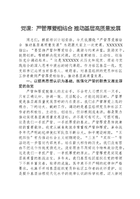 党课:严管厚爱相结合 推动基层高质量发展同志们,根据培训计划安排,今天我围绕严管厚爱相结合 推动基层高质量发展为题跟大家上一次党课。XXXXXX指出:要坚持严管和厚爱结合、激励与约束并重,鼓励实干,鼓励创新,帮助解决现实问题,把大家积极性、主动性、创造性充分调动起来。这是XXXXXX从历史和现实、理论与实践结合的深入思考中提出的时代课题,作为社区基层一线,党支部书记必须当好答卷人、破题者,对基层组织的党员和社区工作者做到严管厚爱相结合,推动基层高质量发展。一、以提高思想认识为基础,既强化严管的职责又激发厚爱的自觉严管和厚爱就像人的左右手,不会有人习惯只用一只手,只有正确认知、协调一致、灵活配合,才能达到目的。严管厚爱是基层高质量发展目标的内在要求。我们在严管厚爱上花的精力、下的功夫、做的工作,调动的是基层组织党员和社区工作者的积极性、主动性、创造性,但归根到底来讲,都是聚力推动实现基层高质量发展目标,并不是可有可无、可弱可强,这是我们一手抓严管、一手抓厚爱的基点。严管厚爱是传统赓续的重要载体。我党从诞生起就非常重视严管和厚爱,革命战争年代严明的纪律使红军队伍不断壮大,和平建设时期,五统四性有力推动社会主义初期建设,三互双四一等活动进一步密切内部关系。站在薪火相传的历史,我们没有理由不把这个传统发扬光大,没有理由不用好这个特殊政治优势,这是我们一手抓严管、一手抓厚爱的原点。严管厚爱是实现基层高质量的胜战法宝。多年来,我们基层社区组织在党的带领下不断丰富完善,取得的成就,其中离不开严明的纪律和严格要求,也离不开对基层组织党员和社区工作者的关怀爱护,这是提升基层治理现代化水平的规律认识的科学机理。迈入新时代,要实现基层高质量发展,必须把严管和厚爱聚焦到提升基层组织党员、社区工作者的能力水平上来,不断为基层治理现代化进程提供坚强纪律保证和动力支持,这是我们一手抓严管、一手抓厚爱的落点。严管厚爱是履职尽责的现实需要。一些单位之所以发生违纪违法案例、安全事故,剖析缘由,都能找到严得不够、爱得不真的原因。相反,那些能长期保持先进、成长为标兵典型的单位和个人,一定程度上正得益于严格约束和深切激励。实践告诉我们,做到严爱相济、相得益彰,单位建设、个人发展就能上台阶;严爱不一、抓虚走空,就容易出状况。因此,要把严管厚爱当重要职责、当进步武器、当有力抓手,从而赢得高质量发展,这是我们一手抓严管、一手抓厚爱的起点。二、以恪守党纪法规为支撑,既立起严管的标准又明晰厚爱的边界对党员干部,严管要做到严之有据、严在法内、严得科学厚爱要做到关心关爱基层组织党员和社区工作者和全面从严治党统一起来,把严格管理和科学管理统一起来,增强管理工作的科学性和有效性。因此,党支部书记要牢固树立依法带队伍的理念,在恪守党纪国法中立起严管的标准、明晰厚爱的边界。一是强化法治思维。基层社区的一切工作都是建立在党纪国法之上,对基层组织党员和社区工作者的管理工作也是一样,必须把严管厚爱和刚性落实党纪法规结合起来,决不能偏离轨道、跑偏跑调,搞土政策土规定。严要严在党纪国法的执行、规章制度的落实,结合实际、客观认定,这样才能让下属心服口服,真正凝聚起大家干事创业的合力。爱要爱得公平公正,做到纪律、工作、机会面前人人平等,表扬先进不平衡照顾,纠正错误不姑息迁就,处理问题不心慈手软。二是细化工作清单。徒善不足以为政,徒法不能以自行。要善于依据党纪国法,细化怎么严管、如何厚爱的职责清单,使日、周、月工作具体,人、岗、事责任明晰,真正向法规要方法、文可居文库——海量学习资料,手机电脑均可下载www.wenkeju.com用法规解难题、靠法规划边界。严管必须严肃党纪条规,针对近年来政策法规密集颁布的实际,及时进行梳理宣讲,让每位基层组织党员和社区工作者的职责都有依据、每个岗位的要求都有标准、每项工作的落实都有参照。厚爱必须严格落实三互双四一,重点人员落实三帮一,努力做到对每名基层组织党员和社区工作者情况熟知深知,在掌握情况的过程中浓厚基层组织党员和社区工作者感情,在部属遇到困难时第一时间跟进疏导解难。三是固化监督机制。信任代替不了监督,在制度规矩面前没有绝对的放心人托底事。一方面,上下合力形成监督氛围,对于逾越边界、触犯法规的情况,鼓励基层组织党员和社区工作者发现和上报问题,织密群管群治群防的网络。另一方面,畅通民主渠道,开通服务热线、办公网、互联网等服务渠道,主动向基层组织党员和社区工作者公开微信号、联系方式,确保基层组织党员和社区工作者能够反映情况。再一方面,主动摸清情况,每月开展问卷调查,开好组织生活会和思想汇报会,及时发现问题、解决问题。三、以把握特点规律为重点,既释放严管的威力又增加厚爱的引力方法对了头,一步一层楼;方法不