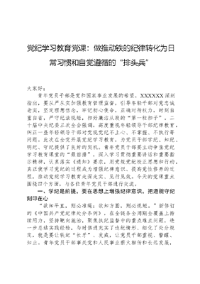 党纪学习教育党课:做推动铁的纪律转化为日常习惯和自觉遵循的排头兵大家好:青年党员干部是党和国家事业发展的希望。XXXXXX深刻指出,要从严从实加强教育管理监督,引导年轻干部对党忠诚老实,坚定理想信念,牢记初心使命,正确对待权力,时刻自重自省,严守纪法规矩,扣好廉洁从政的第一粒扣子。二十届中央纪委三次全会强调,高度重视年轻领导干部纪律教育,纠正一些年轻领导干部对党规党纪不上心、不掌握、不执行等问题。此次在全党开展党纪学习教育,为党员干部学纪、知纪、明纪、守纪提供了良好的契机。青年党员干部要主动争坐党纪学习教育课堂的最前排,深入学习贯彻重要讲话和重要指示精神,认真落实《通知》要求,用党规党纪校正思想和行动,真正使学习党纪的过程成为增强纪律意识、提高党性修养的过程,推动党纪学习教育走深走实、见行见效。今天的党课重点围绕四个方面,与各位青年党员干部进行交流。一、学纪是前提,要在思想上增强纪律意识,把遵规守纪刻印在心欲知平直,则必准绳;欲知方圆,则必规矩。新修订的《中国共产党纪律处分条例》,在全链条全周期全覆盖上持续用力,坚持靶向施治,聚焦执纪监督中的重点难点问题,进一步总结实践经验,与时俱进充实了违纪情形、细化了处分规定,就是要让铁纪长牙、发威,让党员干部重视、警醒、知止。青年党员干部事关党和人民事业薪火相传和长远发展,如果不学习、不了解、不掌握这些党纪党规,就会成为纪盲甚至一不小心违反纪律。因此,要把学习党纪融入日常、抓在经常,原原本本学,联系实际学,深学细悟、融会贯通,入脑入心、见言见行。对于如何学习党纪党规,具体来说有三点要求:第一,紧紧围绕党的创新理论成果进行学习。近年以来,党内法规制度的建设,就是深入学习贯彻以及不断丰富完善党的创新理论成果的过程。学习领会党章党规党纪,一个很重要的前提就是要深入学习党的最新理论成果,深入学习关于全面从严治党、依规治党的重要理论,这样才能在党内法规学习中找到中心轴,才能刻骨铭心、融入脑海。要把新思想作为指导思想和行动指南,深入学习领会其精神实质和实践要求。通过参加集中学习、专题研讨等形式,加深对党纪国法的理解和掌握,增强法治观念和规矩意识。青年党员干部要在实践中锤炼品德修为和意志品质,将所学理论知识与实际工作相结合。牢固树立法治意识,严格按照法律法规和各项规章制度开展工作。要坚持原则性和灵活性相统一的原则,既要敢于坚持原则立场,不妥协退让,又要善于灵活变通,解决问题,避免因循守旧或机械行事造成不必要的损失或负面影响。主动加强纪法学习,增强纪律意识、法治意识、制度意识,经常对照党的理论和路线方针政策、对照规章制度、对照初心使命,看清一些事情该不该做、能不能干,将纪律规矩立于心头,内化于行,时刻自重自省,始终慎独慎初慎微。第二,坚持以党章为核心进行学习。党章是党的总章程、党的根本大法,集中体现了党的理论和路线方针政策,规定了党的重要制度,对推进党的事业、加强党的建设具有重要指导作用。党章是党的总章程,也是党的纪律、规矩的总源头,是全党最基本、最重要、最全面的行为规范。各级党员干部都要将党章内化于心、外化于行。要牢固树立党章意识,以党章党规党纪为标尺正身立行,始终保持共产党人的政治本色,始终文可居文库——海量学习资料,手机电脑均可下载www.wenkeju.com坚守共产党人的精神家园,努力创造无愧于党、无愧于人民、无愧于时代的业绩。全面掌握党章精髓和要义,不仅要原原本本学、反反复复学,而且要联系实际学、深入思考学,做到知其然更知其所以然,经常对照党章找差距、明方向,如此才能坚守党性原则,经得住考验、抵得住诱惑、守得住本色。坚持以党章为根本遵循、行为标尺,多照一照自我、多量一量自身,认认真真查找差距、检视问题,永葆共产党人的政治本色。要以党章为镜,对照党章重点查摆是否牢记党的性质宗旨,贯彻党的基本理论、基本路线、基本方略;是否认真履行党员八项义务,践行入党誓言,充分发挥党员先锋模范作用;是否按照党员干部的基本条件,真正做到信念坚定、为民服务、勤政务实、敢于担当、清正廉洁;是否严格遵守党的组织制度,严守党的政治纪律和政治规矩,真正心有所畏、言有所戒、行有所止,不断提高政治境界、思想境界、道德境界。做实做细经常性纪律教育,注重因材施教、按需施教,分级分类开展党章党规党纪教育,引导党员干部增强纪法意识,知敬畏、存戒惧、守底线,习惯在受监督和约束的环境中工作生活,更好发挥纪律建设治本作用。第三,以强化纪律规矩意识为目标进行学习。从查处的青年党员干部违纪违法案件看,青年党员干部出问题,往往都是从不守规矩、对纪法防线弃守开始的。有的纪法意识不强,容易在恭维奉承下放松警惕,在觥筹交错中迷失自我,错把围猎当真情;有的抱有侥幸心理,觉得纪律规矩约束不到自己,被查的都