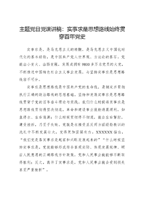主题党日党课讲稿:实事求是思想路线始终贯穿百年党史实事求是,是马克思主义的精髓,是马克思主义中国化时代化的基本经验,是中国共产党人世界观、方法论的基石。党能由小变大、由弱变强,发展成拥有9800多万名党员的大党,不断推进中国特色社会主义事业发展,与坚持实事求是思想路线密不可分。实事求是思想路线是中国共产党的生命线,是制定并贯彻执行正确的政治路线的思想基础。坚持和发展实事求是思想路线贯穿于党的百年奋斗理论与实践。我们什么时候将实事求是思想路线贯彻得坚决彻底,革命和建设事业就能进展顺利,如鱼得水、左右逢源;什么时候贯彻得不彻底,就会左右掣肘,遭受挫折,乃至于失败。党就是在接受正反两方面经验教训的洗礼中不断发展壮大,变得更加坚强有力。XXXXXX指出,我们党是靠实事求是起家和兴旺发展起来的什么时候坚持实事求是,党就能够形成符合客观实际、体现发展规律、顺应人民意愿的正确路线方针政策,党和人民事业就能够不断取得胜利;反之,离开了实事求是,党和人民事业就会受到损失甚至严重挫折。2021年11月,党的十九届六中全会通过的《中共中央关于党的百年奋斗重大成就和历史经验的决议》指出:党之所以能够领导人民在一次次求索、一次次挫折、一次次开拓中完成中国其他各种政治力量不可能完成的艰巨任务,根本在于坚持解放思想、实事求是、与时俱进、求真务实,坚持把马克思主义基本原理同中国具体实际相结合、同中华优秀传统文化相结合,坚持实践是检验真理的唯一标准,坚持一切从实际出发,及时回答时代之问、人民之问,不断推进马克思主义中国化时代化。一、实事求是思想路线是实践的产物思想路线亦称认识路线,指的是人们的认识所遵循的方向途径、原则和方法。一个政党的思想路线,是指这个政党确定自己的指导思想并支配自己行动的认识路线。1930年5月,毛泽东同志在《反对本本主义》一文中首次提出思想路线这一科学概念,提出共产党人从斗争中创造新局面的思想路线中国革命斗争的胜利要靠中国同志了解中国情况,强调没有调查,没有发言权。1938年10月,毛泽东同志在党的六届六中全会上作题为《论新阶段》的政治报告。1941年5月,毛泽东同志在延安干部会议上作《改造我们的学习》的报告,把党的思想路线概括为实事求是。文可居文库——海量学习资料,手机电脑均可下载www.wenkeju.com实事求是已有近2000年历史。实事求是一词最早见于东汉史学家班固撰写的《汉书·河间献王传》,其赞扬汉景帝刘启的儿子刘德修学好古,实事求是。刘德的实事求是是喜好先秦诸子的古书,考证古书时求真是留其正本。唐代颜师古将实事求是注释为务得事实,每求真是也。实事求是思想路线始终贯穿百年党史(2)1938年10月,毛泽东同志在党的六届六中全会报告的第七部分中国共产党在民族战争中的地位中首次提到实事求是的概念,明确提出共产党员应是实事求是的模范,又是具有远见卓识的模范。因为只有实事求是,才能完成确定的任务;只有远见卓识,才能不失前进的方向。1940年1月,毛泽东同志在《新民主主义论》中指出:科学的态度是实事求是,自以为是和好为人师那样狂妄的态度是决不能解决问题的。1941年5月,毛泽东同志在延安干部会议上作《改造我们的学习》的报告时,第一次解答了什么是实事求是。实事就是客观存在着的一切事物;是就是客观事物的内部联系,即规律性;求就是我们去研究。实事求是的内涵从传统的治学方法变成党的思想路线的核心内容。1945年,党的七大正式将实事求是确立为全党的思想文可居文库——海量学习资料,手机电脑均可下载www.wenkeju.com路线。毛泽东同志在这次会议的口头报告中指出:我们历史上的马克思主义有很多种,有香的马克思主义,有臭的马克思主义,有活的马克思主义,有死的马克思主义,把这些马克思主义堆在一起就多得很。我们所要的是香的马克思主义,不是臭的马克思主义;是活的马克思主义,不是死的马克思主义。毛泽东同志强调,要有目的地去研究马克思列宁主义的理论,要使马克思列宁主义的理论和中国革命的实际运动结合起来,是为着解决中国革命的理论问题和策略问题而去从它找立场,找观点,找方法的。这种态度,就是有的放矢的态度。这种态度,就是实事求是的态度。实事求是的态度使马克思主义在中国扎下根来。邓小平同志指出,毛泽东思想的基本点就是实事求是,毛泽东思想的精髓就是这四个字。邓小平同志说,我是实事求是派我读的书并不多,就是一条,相信毛主席讲的实事求是实事求是是毛泽东思想的根本态度、根本观点、根本方法实事求是是马列主义哲学的概括,是马列主义理论、马列主义方法的概括我们讲要继承和发扬毛主席为我们培育的优良传统,第一个就是实