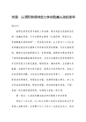 党课:认清形势保持定力争做勤廉从政的表率同志们:按照区委党纪学习教育工作安排,要求我在这里给同志们讲一堂廉政党课,今天党课的主题是认清形势、保持定力,争做勤廉从政的表率,希望通过党课,让大家对十八大以来党风廉政建设和反腐败斗争形势有更深的理解,在面对错误思想、错误言论时能保持定力、自觉抵制,按照新时期优秀党员干部的标准做勤政廉政的表率。当前在全面深化改革的进程中,多元的思想文化相互激荡、错综复杂、真伪难辨,正能量与负能量,权威的声音与流言蜚语,真观点与伪思潮并存,扰乱人们的思维和判断,正是在这种特定的时代背景下,一些党员干部政治信仰迷失,理想信念动摇,抵御风险能力弱化,加上社会利益集团的腐蚀、侵蚀和围猎,而逐渐的腐化堕落。下面,我就一些反腐的错误思想、论调给大家做一些介绍。第一部分:认清党风廉政建设和反腐败斗争的形势党的十八大以来,以A同志为核心的党中央把全面从严治党纳入战略布局,以得罪千百人不负十三亿的坚定决心,亮剑党内突出问题和矛盾,奋力开创全面从严治党新境界,向全社会、全世界传递出中国共产党加强自身建设的鲜明态度,赢得了党心民心,得到了世界各国的尊重。一、十八大以来党风廉政建设和反腐败斗争取得的成效党的十八大一改从前对腐败问题遮遮掩掩的暧昧态度,明确指出:要坚定不移反对腐败,永葆共产党人清正廉洁的政治本色。反对腐败、建设廉洁政治,是党一贯坚持的鲜明政治立场,是人民关注的重大政治问题。不坚决反腐败就会对党造成致命伤害,甚至亡党亡国。在这里没有对腐败问题的回避,没有对党风问题的粉饰,更没有提出什么腐败分子只是极少数,而是坦诚地指出了腐败的严重性、危害性,并旗帜鲜明地表明反腐败是党一贯坚持的鲜明政治立场,是人民关注的重大政治问题。多年的高压反腐,党风廉政建设和反腐败斗争在困难复杂的形势下不断取得新突破。从十八届中央纪委一次全会到四次全会,党中央对反腐败斗争形势的总体判断是依然严峻复杂;2015年初召开的十八届中央纪委五次全会上,党中央认为腐败和反腐败呈胶着状态;2016年十文可居文库——海量学习资料,手机电脑均可下载www.wenkeju.com八届中央纪委六次全会上,党中央认为反腐败斗争压倒性态势正在形成;再到中纪委七次全会提出反腐败斗争压倒性态势已经形成,中纪委对反腐败态势表述的不断变化,标志着反腐败斗争取得了阶段性胜利。(一)不敢腐的目标逐步实现。2013年1月,王岐山同志首次提出坚持标本兼治,当前以治标为主,为治本赢得时间的论述。什么是治标,治标就是以惩立威,当头棒喝,让易于腐败者在带电的高压态势下不敢越雷池半步。1.零容忍惩治腐败。十八大之后,反腐败上无禁区。正国级周永康,副国级郭伯雄、令计划、苏荣、徐才厚,中央委员14人,中央候补委员15人,共计256名中管干部被立案审查。下无死角。114.3万科级以下党员干部、55.4万农村干部受党政纪处理。不以问题小而姑息。平顶山湛河区河滨街道杜庄村党支部委员、会计张宝平在开展村级慰问活动时,私吞100元慰问金,被党内严重警告;山东巨野县田桥镇政府办公室主任魏衍顺到县城了解苹果行情,食用、收受了两个苹果,均未按价付款购买,被诫勉谈话。不以违者众而放任。湖南衡文可居文库——海量学习资料,手机电脑均可下载www.wenkeju.com阳贿选案处理467人;四川南充贿选案处理了477人;辽宁贿选案处理955人(中管干部34人);山西塌方式腐败查处违纪党员干部7367人,以致于出现县委书记都找不着人选,不得不从外省市调任的情况。这些数据表明了中央对反腐败零容忍的态度,体现了不管涉及到谁,不论权力大小,都一查到底,决不姑息的反腐决心,极大地震慑了腐败分子。2.天网追逃消除幻想。A同志在中央纪委五次全会上强调,要加大国际追逃追赃力度,布下天罗地网,决不能让腐败分子躲进避罪天堂、逍遥法外。按照党中央的决策部署,2014年以来,我国设立中央反腐败协调小组国际追逃追赃工作办公室,先后开展天网2015天网2016等等专项行动,从70多个国家和地区追回2442人,其中国家工作人员397人,百名红通人员40人,追赃金额85.42亿元。天津市国税局直属分局原局长庞顺喜,天津港保税区瀚通国际贸易有限公司原总经理安慧民,分别因涉嫌受贿罪、行贿罪于2014年12月被天津市河西区人民检察院立案侦查,案发后潜逃至老挝。2015年3月28日下午,按照中央反腐败协调小文可居文库——海量学习资料,手机电脑均可下载www.wenkeju.com组国际追逃追赃工作办公室的统一部署,在我外交部和驻老挝使馆大力支持下,公安部派出的联合缉捕工作组将潜逃老挝的庞顺喜、安慧民成功押解回国,取得了反腐败国际追逃追赃天网行动的