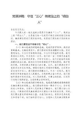 党课讲稿:守住三心做政治上的明白人各位党员同志:今天跟大家一起交流的主题是守住廉政三心,做政治上的明白人。这是我们每一位党员干部应该时刻铭记的准则。廉政建设是我们党的生命线,也是我们党执政兴国的根本保证。一、我们要坚定不移地守住初心。(一)初心是我们对党的忠诚,是我们坚守信仰、践行宗旨的基石。在廉政建设中,我们要时刻保持清醒的头脑,坚定理想信念,不为任何诱惑所动摇,不为任何利益所迷惑。我们要深刻认识到,作为党的一分子,我们的一言一行都代表着党的形象,关系到党的声誉。只有守住初心,我们才能始终保持清醒的政治头脑,做到在任何时候都能坚守党的原则,维护党的形象,为党的事业贡献自己的力量。此外,我们要通过学习党的历史和优良传统,增强对党的认同感和归属感,从而更加坚定地守护初心。我们要时刻提醒自己,作为一名党员,我们的职责和使命就是为人民服务,为党的事业奋斗终身。我们要始终保持对党的忠诚,对人民的热爱,对事业的执着,以实际行动践行党的宗旨,为党的事业添砖加瓦。(二)初心是我们前行的动力,也是我们廉政建设的源泉在廉政建设的道路上,我们要始终保持一颗赤子之心,坚守党的初心和使命,为党和人民的事业不懈奋斗。我们要以初心为动力,不断推动党风廉政建设和反腐败斗争向纵深发展。同时,我们要注重发挥榜样的力量。在我们的身边,有很多优秀的党员和领导干部,他们始终坚守初心,为党和人民的事业默默奉献。我们要向他们学习,以他们为榜样,激励自己不断前行。我们要时刻提醒自己,不忘初心就是要始终保持对党的忠诚和对人民的热爱,始终保持对事业的执着和追求。(三)初心是我们的精神支柱,也是我们廉政建设的灵魂面对复杂多变的社会环境,我们要时刻提醒自己,不忘初心就是要始终保持清醒的头脑和坚定的信念。我们要以初心为指引,不断提升自己的政治素养和道德水平,做到心中有党、心中有民、心中有责、心中有戒。我们要不断加强自身修养,提升道德品质。作为党员领导干部,我们要时刻以高标准要求自己,做到言行一致、表里如一。我们要注重培养自己的廉洁自律意识,严格遵守党的纪律和规定,自觉抵制各种不良风气和诱惑。此外,我们还要加强制度建设,为守住初心提供有力保障。我们要完善廉政建设的相关制度,加强监督执纪问责力度,确保党的纪律和规定得到严格执行。同时,我们还要加强宣传教育力度,提高广大党员干部对廉政建设重要性的认识,形成全社会共同关注、共同参与的良好氛围。二、我们要牢牢把握守住公心。(一)公心是我们公正执法的基石。作为社会的守护者,我们肩负着维护社会公平正义的重要职责,这要求我们在执法过程中始终坚守公心,坚守法律面前人人平等的原则。公心意味着我们在面对各种复杂情况时,必须保持清醒的头脑,不受任何个人感情和利益的影响,始终保持公正无私的态度。在执法实践中,我们要以法律为准绳,以事实为依据,确保每一项决策和行动都符合法律和道德的要求。这需要我们不断加强自身的法律素养和执法能力,通过学习和实践不断提高自己的专业水平。只有这样,我们才能确保公正执法落到实处,让人民群众感受到法治的力量和温度。同时,我们还要注重加强与群众的沟通与交流,了解他们的需求和诉求,积极为他们排忧解难。我们要始终保持谦虚谨慎的态度,虚心向群众学习,从他们的实践经验中汲取智慧和力量。通过这样的互动和合作,我文可居文库——海量学习资料,手机电脑均可下载www.wenkeju.com们能够更好地发挥公心在公正执法中的积极作用,推动社会的和谐稳定发展。(二)公心是我们服务群众的准则。作为党员干部,我们的工作是为了人民,我们的权力来自人民。因此,我们必须始终坚守公心,把人民放在心中最高位置,全心全意为人民服务。在服务群众的过程中,我们要深入基层、深入群众,了解他们的真实需求和诉求。我们要用心倾听他们的声音,关注他们的生活状况,积极为他们提供有效的帮助和支持。同时,我们还要坚持公开透明、公正公平的原则,确保党的各项政策和工作得到群众的认可和支持。为了实现这一目标,我们需要不断提高自己的服务意识和能力。我们要加强学习,掌握更多的专业知识和技能,以便更好地为群众服务。我们还要注重培养自己的责任心和使命感,时刻牢记自己的职责和使命,为人民群众提供更加优质、高效的服务。(三)公心更是我们廉洁自律的保障。在廉政建设中,守住公心意味着我们要始终坚守廉洁自律的底线,不为私利所动,不为诱惑所扰。我们要时刻保持清醒的头脑,自觉遵守党的纪律和规定,做到公私分明、廉洁奉公。为了实现廉洁自律的目标,我们需要加强自我监督和自我约束。我们要时刻关注自己的思想和行为,及时发现并纠正存在的问题和不足。我们还要加强对他人的监督和帮助,共同营造一个风清气正的工作环境。同时,我们还要注重加强廉政教育和宣传。通过举办各种形式的廉政教育活动,提高党员干部的廉