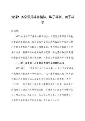 党课:务必发扬斗争精神,敢于斗争、善于斗争同志们:AXXX在党的XXX报告中强调指出:我们要依靠顽强斗争打开事业发展新天地。这为全党和全国各族人民在新时代新征程打开事业发展新天地提出了明确要求。党的领导干部敢于斗争善于斗争,要明确其中蕴藏的理论逻辑、历史逻辑和实践逻辑,既要在精神层面发扬斗争精神,又要在行为层面提升斗争本领。一、敢于斗争善于斗争是马克思主义的鲜明品格AXXX指出:马克思主义产生和发展、社会主义国家诞生和发展的历程充满斗争的艰辛。这一重要论述反映了作为全世界无产阶级和劳动人民革命导师的马克思,向来就不讳言斗争。马克思主义学说是为揭露资本主义社会、指导无产阶级进行社会主义革命而创立的,自诞生之日起就与旧唯物主义、唯心主义、机会主义、修正主义作斗争,斗争精神贯穿于马克思主义发展历程及其立场、观点和方法之中。一是敢于斗争体现马克思主义的无产阶级立场。马克思主义认为,矛盾无时不在、无处不有,有矛盾就会有斗争,正是在矛盾双方的相互斗争中社会实现不断发展进步。历史发展是连续性和阶段性的统一,因此,我们党在不同历史阶段有不同的历史任务。现在我们讲的斗争,不是为了斗争而斗争,也不是为了一己私利而斗争,而是为了实现人民对美好生活的向往、实现中华民族伟大复兴而斗争。正如《共产党宣言》中所说的,过去的一切运动都是少数人的或者为少数人谋利益的运动,无产阶级的运动是绝大多数人的、为绝大多数人谋利益的独立的运动。无产阶级政党是以无产阶级为其阶级基础的,这决定了我们党的性质和宗旨是全心全意为人民服务。党的十八大以来,人民始终是A新时代中国特色社会主义思想中的高频词和关注点。党的十九大更是明确了新时代我国社会主要矛盾是人民日益增长的美好生活需要和不平衡不充分的发展之间的矛盾。新时代伟大斗争的主要目标是实现中华民族伟大复兴,根本立场是坚持以人民为中心。就当前而言,需要紧扣社会主要矛盾的变化,在政治、经济、文化、社会、生态等领域进行斗争。文可居文库——海量学习资料,手机电脑均可下载www.wenkeju.com一方面,要更加自觉地维护人民利益;另一方面,要与损害人民利益、脱离群众的行为作斗争。二是敢于斗争体现马克思主义的实践观点。马克思主义理论是无产阶级推动社会制度根本变革的革命理论,但其所固有的斗争理论和斗争精神绝不仅存在思想观念中,而且是在实践中不断发生的,实践性是其鲜明特征。马克思主义正是在指导无产阶级斗争实践的过程中不断实现自身的历史使命,又在这种斗争的全过程中使其理论体系不断经受考验,进而不断丰富和发展。从党的十八大报告提出必须准备、到党的十九大报告提出必须进行、再到党的XXX报告强调义无反顾进行许多具有新的历史特点的伟大斗争,体现了新时代伟大斗争不是脱离实际的空中楼阁,而是以A同志为核心的党中央在立足两个大局的基础上作出的重大判断,既要正确研判形势,又要积极落实到实践中。三是敢于斗争体现辩证唯物主义的方法论。AXXX指出:社会是在矛盾运动中前进的,有矛盾就会有斗争。历史发展是连续性和阶段性的统一,我们党在不同历史阶段斗争的主文可居文库——海量学习资料,手机电脑均可下载www.wenkeju.com要内容和主要形式并不完全相同。新时代的伟大斗争,不能与左和无原则划等号,不是强调以阶级斗争为纲,而是为实现中华民族伟大复兴知重负重、苦干实干、攻坚克难。落实到本职岗位,要认识到工作就是斗争,敢于直面、揭露、分析和解决矛盾,绝不否认、掩盖、回避和害怕矛盾。二、敢于斗争善于斗争是党百年奋斗的历史经验我们党从成立至今,正如AXXX指出:都是在斗争中诞生、在斗争中发展、在斗争中壮大的。斗争精神贯穿党的百年奋斗历程,党依靠斗争创造历史,也必然要依靠斗争赢得未来。新民主主义革命时期,我们党团结带领全国人民,以武装革命推翻帝国主义、封建主义、官僚资本主义三座大山,完成了新民主主义革命,建立了中华人民共和国,实现了中国从几千年封建专制向人民民主的伟大飞跃。社会主义革命和建设时期,我们党团结带领全国人民,以顽强的斗争精神完成了中华民族有史以来最为广泛而深刻的社会变革,实现了一穷二白、人口众多的东方大国大步迈进社会主义社会的伟大飞跃。改革开放和社会主义现代化建设新时期,我们党以锐意进取的精神团结文可居文库——海量学习资料,手机电脑均可下载www.wenkeju.com带领人民,坚定不移地推进改革开放,同不符合生产力发展和生产关系相适应的生产关系和上层建筑作斗争,坚持解放思想、实事求是,确保改革开放始终朝着社会主义方向前进,实现了中华民族从站起来到富起来的伟大飞跃。党的十九届六中全会通过的《中共中央关于党的百年奋斗重大成就和历史经验的决议》,用十个坚持系统总结我们党百年奋斗积累的