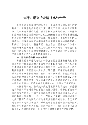 党课:遵义会议精神永放光芒遵义会议作为我们党的历史上一次具有伟大转折意义的重要会议,在最危急关头挽救了党、挽救了红军、挽救了中国革命。这一历史转折的实现,留下了极其宝贵的经验,对于党的事业的发展有着深远的影响。XXXXXX2021年在贵州考察时强调,遵义会议的鲜明特点是坚持真理、修正错误,确立党中央的正确领导,创造性地制定和实施符合中国革命特点的战略策略。弘扬以坚定信念、坚持真理、独立自主、团结统一为基本内涵的遵义会议精神,让遵义会议精神永放光芒,对于我们在新时代新征程上全面加强党的建设、以中国式现代化全面推进中华民族伟大复兴,具有重要的意义。一、坚定信念的精神永放光芒为什么要召开遵义会议?一个直接的原因就是解决红军的进军方向和由此引出的军事战略和军事指挥问题。中央红军长征最初设定的方向是到湖南西北部同红二、六军团会合,不仅要突出重围,而且要进一步壮大红军力量,开辟新的根据地,再次推动革命斗争的高涨。然而,湘江战役后,中央红军由长征出发时的8.6万余人锐减到3万余人,前有重兵堵截,后有大军围追,被动挨打,有全军覆没之险。在这种情况下,是继续沿既定目标走,还是实事求是调整方向?红军处于生死关头。长征开始以来,由于战斗失败导致很多红军战士、部分指战员和党员干部对党和红军的前途忧心忡忡,党和红军内部对错误领导的怀疑、不满和要求改换领导的情绪迅速增长。广大的红军指战员在第一、二、三、四