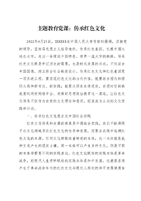 主题教育党课:传承红色文化2022年4月25日,XXXXXX在中国人民大学考察时强调,坚持党的领导,坚持马克思主义指导地位,传承红色基因,扎根中国大地办大学,走出一条建设中国特色、世界一流大学的新路。传承红色文化既是牢记历史的需要,也是时代发展的诉求,不仅适合中国国情,而且符合社会制度设计。传承红色文化和红色基因是一项系统工程,要实现红色文化的当代价值,就要结合国内和国际大局和新常态、新实践;就要从历史走进现实,实现时空转换就要利用好网络平台、发挥好思想政治教育这一渠道,让红色文化传承不仅作为自觉的文化理念和意识,而且成为主动的文化实践和行动。一、传承红色文化要立足中国社会实践红色文化传承和发展的根基是中国社会实践,我们不能局限于在文化领域寻求红色文化的传承和发展,而要在实践中追溯红色文化的来源。任何文化都联结着特定的本体,这一本体就是此种文化产生的现实土壤,同一本体可以产生多种文化,但是不同的本体却需要不同的实践表达。红色文化联结的实践本体是革命战争,而现代人生存所联结的实践本体是和平发展,这就要求将产生于革命战争年代的红色文化与现代人所处的和平发展境遇有机结合,将产生于革命年代的红色文化精神融入当前的历史洪流之中,简单地说,就是用当代的中国社会实践阐释红色文化,使其在新的历史条件下获得新的影响力和生命力。传承红色文化的前提是人民群众对于红色文化的广泛认同,而要实现群众认同,就要展现红色文化的效力。因此,红色文化的价值不能停留在革命年代为了崇高理想流血牺牲的信念上,还要体现在新时代对人民日益增长的美好生活需要的不断满足里。如果在社会实践中,红色文化所描述的美好愿景没有逐步实现,红色文化就只能作为我们的历史记忆,红色文化传承就会产生危机。所以,要回到人们都认同的理想视野、回到真实的社会实践来传承红色文化,通过提高人民安全感、获得感和幸福感建构一个更加美好、更加繁荣、给人民以更好未来的中国。二、传承红色文化要做好内容创新要想提高红色文化传承实效,就要基于中国社会实践做好红色文化内容上的创造性转化和创新性发展。理论只要说服人,就能掌握群众;而理论只要彻底,就能说服人,因为理论一经掌握群众,就能转化为物质力量。红色文化的传承本质上是价值旨趣和思想观念的代际传承。由于红色文化所处的现实土壤发生改变,传承红色文化也需要有效的代际转换,使其在社会发展的不同时期焕发出新的生命力,既保持文化精神的连续性,又体现内容的独特性与时代性。因为人们自己创造自己的历史,但是他们并不是随心所欲地创造,并不是在他们自己选定的条件下创造,而是在直接碰到的、既定的、从过去承继下来的条件下创造,所以我们需要处理好过去、现在与未来的关系,要针对红色文化开展系统性、整体性、连续性的创新研究和阐释。一方面,要着力挖掘红色文化研究深度,在全国范围内选拔立场坚定经验丰富、研究能力突出的专家学者开展红色文化研究,在理论层面论证清楚我国选择现有社会主义制度所具有的应然性,澄清中国共产党所应担当的时代使命,挖掘红色文化中蕴含的独特的精神特质,打造兼具历史厚度、思想高度、情感温度的高水平理论成果,持续释放红色文化所承载的精神力量。另一方面,要拓展红色文化的研究场域,深挖红色文化的时代精髓,将红色文化研究与XXX新时代中国特色社会主义思想、人民群众关注的社会热点问题深度融合,增强红色文化精神研究的时代感和针对性。三、传承红色文化要利用好互联网平台传承红色文化要充分利用现代化的信息技术,实现从传统媒介向互联网平台的转换。过去红色文化传播的主要媒介是报纸、杂志、广播、电视,这种媒介的有效性基于信息和话语环境的相对封闭性,依赖于单向的传播环境。网络的出现和现代媒体的兴起,将整个世界改造成了信息场,每一个处于虚拟空间的人都既是文化的接受者,又是文化的传播者。多人参与、多向互动成为文化传播的主要方式,传播者与接受者的关系也发生了根本性变化。据此,要将红色文化基因植入现代文化受众心中,就必须使红色文化适应当下的网络语境,实现传播途径的多维度立体协同转换,以润物细无声的方式浸润人们的精神世界。在互联网+时代,网络、自媒体和各类终端都可以成为红色文化的传播载体,红色文化场馆可以以数字化的形式呈现,红色文化的宏大叙事可以通过灵活多样、短小精悍的形式展现为VR虚拟现实体验H5动画技术等现代科技与艺术相融合的方式,可以实现微媒传播,可以实现从静态到动态的转化,让场景动起来,让故事活起来,让历史事件更加生动。通过对传播内容的再包装再编码,形成多维度、全景式的传播格局,通过沉浸式体验等现代的手法让民众在潜移默化中实现知、情、意、信、行这种转换不仅能体现红色文化的历史底蕴,也富有时代特色,使人在感受现代科技的先进与便捷的基础上,被红色情怀感染和启迪,更易于理解红色文化所蕴含