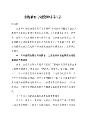 公司主题教育专题党课辅导:深刻理解认识四个问题推动主题教育走深走实同志们:根据公司党委主题教育计划安排,今天由我为大家结合第二批主题教育开展以来的学习所思所想所学所感,为大家进行专题党课辅导,主要目的是:深入学习贯彻XXX新时代中国特色社会主义思想,集中时间,集中精力,静下心来,通读、精读、研读原著原文原理,在深化、内化、转化上下功夫,切实做到内化于心、外化于形,努力在以学铸魂、以学增智、以学正风、以学促干方面取得实实在在的成效。下面,我结合自己的学习体会,与大家共同交流学习,共交流四个方面的问题。第一,深刻理解认识为何而开展的问题,充分认识开展主题教育的重大意义,切实把思想和行动统一到XXXXXX重要讲话精神和公司党委部署上来。2023年4月3日,主题教育工作会议在北京召开。XXXXXX出席会议并发表重要讲话,从新时代新征程党和国家事业发展全局的战略高度,深刻阐述开展主题教育的重大意义和目标要求,对主题教育各项工作作出全面部署,具有很强的政治性、思想性、指导性,为全党开展主题教育提供了根本遵循。9月5日,中央召开主题教育第一批总结暨第二批部署会议,深入总结第一批主题教育取得的重要阶段性成果,明确要求开展第二批主题教育要注重把准目标要求、注重加强分类指导、注重解决实际问题、注重抓好衔接联动、注重防止形式主义、官僚主义。9月中旬公司党委对深入开展第二批主题教育作了全面安排部署,9月26日公司党委召开主题教育读书班开班暨第一次集中学习研讨,要求各党支部要深刻领悟两个确立的决定性意义,切实增强四个意识、坚定四个自信、坚决做到两个维护,深刻认识开展主题教育的重大政治意义、实践意义、历史意义和时代意义,进一步增强抓好主题教育的思想自觉、政治自觉、行动自觉,以强烈的政治担当和责任使命把主题教育抓实抓好抓出成效。第二,深刻理解认识理论先行是先导的问题,重点把握好开展主题教育是持续推动用XXX新时代中国特色社会主义思想武装头脑指导实践推动工作的迫切需要。新时代10年,我们党顺应时代发展新要求,创立了XXX新时代中国特色社会主义思想。XXX新时代中国特色社会主义思想气势恢宏、博大精深,是当代中国的马克思主义、21世纪马克思主义。开展主题教育,就要以学习贯彻XXX新时代中国特色社会主义思想为主线,坚持思想建党、理论建党,坚持学思用贯通、知信行统一,推动全体党员干部全面系统学、深入思考学、联系实际学,切实筑牢信仰之基、补足精神之钙、把稳思想之舵。理论学习往心里走。公司党委不断深化理论武装,充分发挥领导班子领学促学、示范带动作用,坚持先学一步、学深一层,进行党委理论中心组集中学习、专题研讨,把党的创新理论与解决实际问题紧密结合。下发主题教育书籍250余册,组织基层党支部学习党的XX大报告、《XXX新时代中国特色社会主义思想专题摘编》等学习材料20余次,将学习、工作热情转化为攻坚克难、干事创业的强大动力,为开展好主题教育打下坚实基础。第三,深刻理解认识从严从紧从实的问题,切实把握好开展主题教育是推进新时代党的建设的迫切需要。党的十八大以来,以XXX同志为核心的党中央,坚定不移推进伟大自我革命,作出全面从严治党战略部署,开创了党的建设新局面,明确提出了党的建设总要求,对推进新时代党的建设作出了全面部署,为新时代党的建设指明了方向和提供了遵循。我们要认真落实新时代党的建设总要求,坚持党要管党,全面从严治党,坚持正风肃纪不停步、反腐惩恶不懈怠、严肃问责不松劲。在新的历史条件下,我们也要清醒地看到,对标对表新时代党的建设总要求,全面从严治党任务艰巨,党内政治不纯、思想不纯、组织不纯、作风不纯的问题依然存在,违反政治纪律、组织纪律的问题时有发生。作为党员干部,不仅要把严与实的要求贯穿主题教育始终,更要在日常工作中久久为功,将严的精神与实的作风贯彻始终。廉洁奉公树立新风是这次主题教育要达到的具体目标之一,建设廉洁文化,就是要倡导立足我们的实际工作岗位,廉洁奉公、诚实守信、爱岗敬业,不断规范和约束我们的思想与行为,增强我们拒腐蚀、永不沾的能力,以营造清正廉洁、公道正派的工作氛围为指向,使廉洁成为一种习惯、成为一种文化自觉,让廉洁文化深入到我们生活的每个方面。广大党员干部要以开展主题教育为契机,深入贯彻新时代党的建设总要求,始终坚持问题导向,全面推进党的政治建设、思想建设、组织建设、作风建设、纪律建设,把制度建设贯穿其中,建设忠诚干净担当的干部队伍。第四,深刻理解认识人民至上的问题,紧贴实际把握好开展主题教育是强化宗旨观念,全心全意为人民服务的迫切需要。全心全意为人民服务是党的根本宗旨,通过开展主题教育我们要持续强化广大党员干部的宗旨意识、服务意识,坚持以人民为中心的发展思想,多干群众期盼和急需办的事,多干群众受益和得实惠的事,多干