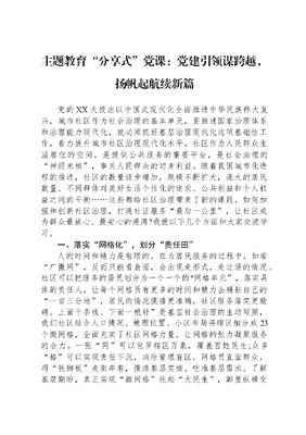 主题教育分享式党课:党建引领谋跨越,扬帆起航续新篇党的XX大提出以中国式现代化全面推进中华民族伟大复兴,城市社区作为社会治理的基本单元,要推进国家治理体系和治理能力现代化,就必须抓好基层治理现代化这项基础性工作,着力提升城市社区治理现代化水平。社区作为人民群众生活居住的空间,是提供公共服务的重要平台,是社会治理的神经末梢,事关人民群众的切身利益。随着我国城市化进程的推进,社区的数量逐步增加,规模不断扩大,庞大的居民数量、不同群体对美好生活个性化的追求、公共利益和个人权益之间的平衡……这些都给社区治理带来了新的课题。如何加强和创新社区治理,打通社区服务最后一公里,让社区成为群众最放心、最安心的港湾?我就以下几个方面和大家交流学习。一、落实网格化,划分责任田人的时间和精力是有限的。在为居民服务的过程中,如若广撒网,反而只能看表面,会出现走形式,走过场的情况。社区可以把服务的居民划分为一个一个的"网格单元,落实具体的责任人,让每个网格员有更多的时间和精力去耕耘自己的一亩三分地,居民的情况摸排更准确,社区服务落实更精确。上面千条线、下面一根针是基层社会治理的生动写照,我们社区结合人口情况、地理位置、小区布局将辖区细分成23个微网格,全面充实了社区网格力量,让网格的张力凝聚服务的合力。一张网可以包罗辖区万象,覆盖百姓民生;众多格可以实现责任下沉,消除管理盲区,网格员直面群众,用铁脚板走街串巷,摸清基层实情、吃准基层需求、了解基层期盼,真正实现微网格托起大民生,彰显纵横交织的精度与基层治理的温度。二、建立微网格",构建议事厅"居民的事情居民议,社区既要派出网格员去收集居民微心愿,网格员及时梳理微心愿,通过台账式管理,优先解决呼声高的诉求,做好跟踪反馈。同时要构建起居民说事的机制,及时向社区居民通报当前的工作计划及进展情况。这样还能收集居民的微需求,听到居民的金点子",凝聚大家的力量,心往一处想,劲往一处使,社区的工作更好干,居民的事情更好办,加强社区居民间的有机联系,为居民参与各种形式的社区公共生活创造条件,培养居民对社区制度和规则的尊重,形成良好社区文化氛围,使社区治理始终充满生机活力。2023年3月,我们社区在辖区内开展了社情民意大走访活动,网格员收集自己网格内的基本情况、居民的诉求以及服务需求,与居民面对面沟通、心贴心交流,把居民需求作为第一选择,把群众呼声作为第一信号,从民声中寻方向、找问题,为居民排忧解难。三、开展微服务,提高微幸福数字技术是时代潮流,是保障民生的新动力,依托于互联网等技术的加速创新,社区治理也应拥抱时代浪潮开拓出一片发展新天地。我们社区建立线上小格微群,为居民提供微服务和微保障。居民在群内反应车被剐蹭时情绪激动、言语过激,网格员第一时间作出回应,安抚居民情绪,提醒居民利用法律途径解决问题并提供相应的帮助,让居民的烦心事化解在微网格内。在收到县气象局发布的天气预警信息时,网格员们及时在群内提醒居民注意防范、安全出行。小社区连着大民心,小网格连着千万家,在技术革新的新形势下,探索社区治理数字+新模式,搭建社区智能网络,建设云上互动平台,架好为民服务新云梯,为广大居民畅通建言渠道,网格员及时关注各自辖区内居民的实际情况,才能更好的了解居民所思所想所盼。民为邦本,本固邦宁。只有紧跟党的引领,在时代的发展中不断提升社区治理现代化水平,不断优化社区服务,不断创新治理模式,才能促进社区治理格局的科学化、精细化、智能化,才能更好的满足人民群众日益增长的美好生活需要。