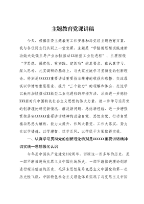 主题教育党课讲稿今天,根据县委主题教育工作安排和局党组主题教育方案,我与各位同志们共同上一堂党课,主题是学悟新思想实践建新功做大做强主导产业加快推动XX新型工业化进程。主要围绕学思想、强党性、重实践、建新功的总要求,在认真学习、深入思考、扎实调研的基础上,与大家交流学习贯彻党的创新理论,特别是XXXXXX重要讲话重要指示精神的收获和感悟,交流落实以学增智重要要求、提升三个能力的理解和体会,交流学以致用加快推动XX新型工业化进程的举措方法,从而进一步感悟XXX新时代中国特色社会主义思想的伟大力量,进一步学习运用党的创新理论研究新情况、解决新问题、总结新经验,进一步增强贯彻落实XXXXXX重要讲话精神的政治自觉、思想自觉、行动自觉推动思想大解放、能力大提升、作风大转变、工作大落实,努力在以学铸魂、以学增智、以学正风、以学促干方面取得实效。一、认真学习贯彻党的创新理论特别是XXXXXX重要讲话精神切实统一思想强化认识今年是中国共产党建党102周年,回顾这一百多年的历史,是一部不断推进马克思主义中国化的历史,一部不断推进理论创新进行理论创造的历史。毛泽东思想是马克思主义中国化的第一次历史性飞跃,中国特色社会主义理论体系实现了马克思主义中国化新的飞跃。党的十八大以来,以XXX同志为主要代表的中国共产党人,坚持把马克思主义基本原理同中国具体实际相结合、同中华优秀传统文化相结合,深刻总结并充分运用党成立以来的历史经验,从新的实际出发,创立了XXX新时代中国特色社会主义思想实现了马克思主义中国化时代化新的飞跃,为新时代党和人民事业发展、实现中华民族伟大复兴提供了科学理论指导。XXX新时代中国特色社会主义思想是当代中国马克思主义、二十一世纪马克思主义,是中华文化和中国精神的时代精华,实现了马克思主义中国化时代化新的飞跃。XXX新时代中国特色社会主义思想以两个结合为根本途径推进理论创新,是顺应时代大势、适应实践所需、植根文化沃土的科学真理,以马克思主义中国化时代化新的飞跃,引领新时代党和国家事业取得历史性成就发生历史性变革。学习贯彻XXX新时代中国特色社会主义思想,关键要进一步增强对两个确立两个维护的政治认同、思想认同、理论认同、情感认同,更加紧密地团结在以XXX同志为核心的党中央周围,更加自觉用当代中国马克思主义、二十一世纪马克思主义指引方向,凝心聚力走好新征程。一方面,始终与以XXX同志为核心的党中央保持高度一致,筑牢绝对忠诚。全局广大党员干部要把学习贯彻XXXXXX重要讲话精神,作为当前和今后一个时期的首要政治任务和头等大事,作为主题教育的重要内容,与学习贯彻XXXXXX视察山东视察XX重要讲话精神结合起来,与学懂弄通XXX新时代中国特色社会主义思想结合起来,与深入贯彻党的XX大精神结合起来,切实增强政治自觉思想自觉、行动自觉,忠诚捍卫两个确立,坚决做到两个维护。另一方面,笃学践行XXXXXX对新型工业化作出的重要指示精神,交出优异答卷。全局广大党员干部一定要把XXXXXX重要指示记在心底、化为力量、见诸行动,切实做到认真领会、准确把握、落实到位,切实肩负起政治责任、历史责任、工作责任,撸起袖子加油干、风雨无阻向前行,努力学在深处、干在实处、走在前列,在推进新型工业化道路上彰显新担当,在推进工业转型升级中实现新突破,以更加奋发有为的精神状态努力开创XXXX事业发展新局面。二、深入贯彻以学增智重要要求,持续提升三种能力不断增强工作本领为学之实,固在践履。XXXXXX指出:以学增智,就是要从党的科学理论中悟规律、明方向、学方法、增智慧,把看家本领、兴党本领、强国本领学到手。并从提升政治能力、提升思维能力提升实践能力三个方面提出明确要求,这为广大党员干部提升三种能力指明了奋进方向,必将有力推动全党主题教育深入扎实开展。(一)在提升政治能力上持续加力旗帜鲜明讲政治,是XXX新时代中国特色社会主义思想的核心要求。政治能力是把握方向、把握大势、把握全局的能力。提高政治能力,就是不断提高政治判断力、政治领悟力、政治执行力一是提高政治判断力,提高科学把握形势变化、精准识别现象本质、清醒明辨行为是非、有效抵御风险挑战的能力。要自觉用XXX新时代中国特色社会主义思想凝心铸魂,把握好这一重要思想的世界观和方法论,坚持好、运用好贯穿其中的立场观点方法,做到在重大问题和关键环节上头脑特别清醒、眼睛特别明亮,善于从繁杂问题中把握事物的规律性、从苗头问题中发现事物的趋势性、从偶然问题中认识事物的必然性。二是提高政治领悟力,提高从政治高度领会、体悟中央精神的能力。要在常思常悟中提高政治领悟力,在学深悟透XXX新时代中国特色社会主义思想上下功夫,深刻领悟两个确立的决定性意义,增强四个意识坚定四个自信、做到两个维护。胸怀