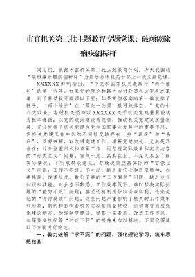 市直机关第二批主题教育专题党课:破顽瘴除痼疾创标杆同志们,根据市直机关第二批主题教育计划,今天我围绕破顽瘴除痼疾创标杆为题给全体机关干部上一次主题党课。XXXXXX鲜明指出,中央和国家机关是践行两个维护的第一方阵。如果党的理论和路线方针政策在这里失之毫厘,到了基层就可能谬以千里;如果贯彻落实的第一棒就掉了链子,两个维护在最先一公里就可能落空。党的十八大以来,各级机关坚持以XXXXXX关于机关党建重要论述为根本遵循,以党的政治建设为统领,推动机关党建高质量发展,充分发挥了机关党建在党和国家事业发展中的重要作用。但机关党建工作中依然不同程度地存在一些顽疾和杂症,亟需破解,以改进党建工作、增强党建实效。尤其是还存在:过分注重形式和表面工作,而忽视实际效果和实质内容的形式主义问题;官气十足、高高在上。不深入基层了解实际情况,不听取群众意见,导致决策脱离实际的官僚主义问题;工作不积极、不主动,缺乏责任心和进取精神,办事拖延、推诿扯皮、敷衍了事的工作懈怠问题;缺乏专业知识和技能,对业务不熟悉、工作效率低下、难以解决实际问题的能力不足问题;甚至还有利用职权谋取私利,违法乱纪的贪污腐败问题。这些问题严重影响了机关的工作效率和形象,制约和影响着机关实现高质量建设,迫切需要通过强化理论学习、加强制度建设、提高干部素质、改进工作作风、加强监督执纪等对症下药的措施来加以解决。下面我围绕以下方面进行论述。一、着力破解学不深的问题,强化理论学习,筑牢思想根基现在一些机关干部在理论学习方面,虽然能够自觉在思想上和行动上同以XXX同志为核心的党中央保持高度一致,但对理论学习仍不够系统深入,潜意识认为政治理论学习很重要,但是没有平衡好工学矛盾,平时忙于日常工作,把政治理论学习放在缓一缓、等一等的位置。其问题的所在还是放松了对主观世界的改变,思想上萌生了一些惰性,自我要求有所放松,自觉地产生了歇口气、保平稳的思想,存在应付应景被动学习的倾向。把理论武装和党性修养当成一种软任务,没有入脑入心、吃透本质,也难以入心入脑。为此,我们更要重视理论学习,一是要聚焦中心。要把XXX新时代中国特色社会主义思想作为理论学习的核心内容,更加准确落实党的XX大提出的各项任务部署,特别是XXX对党的建设提出的5方面要求,增强八项本领,提高七种能力,从机关围绕中心、服务大局、服务群众的职责定位出发,深刻领会精神实质、把握精髓要义,增强政治认同、思想认同、情感认同,为主题教育走深走实奠定思想基础。二是要掌握方法。用好理论学习中心组、专题读书班、循迹溯源等学习载体,原原本本读原著、仔仔细细悟原理,严密组织统筹大课、互动小课、精品微课、党员评课等一系列活动,把大家想听的讲透、难懂的讲清,激活忠诚因子、燃旺智慧火苗,让深奥的教透、枯燥的教活、易懂的教实,防止粗放漫灌概略瞄准,做到精确滴灌直击靶心。同时组织党员干部交流学习体会、分享学习感悟、深化学习转化,提高主动性和积极性,为主题教育提质增效。三是要学出信仰。真正把心沉下来,在党的创新理论、基层党组织建设、能力作风建设、推进全面从严治党等方面,推动XXX新时代中国特色社会主义思想在建德落地生根、开花结果、取得实效。在学思践悟中坚定捍卫两个确立、坚决做到两个维护,当好最讲党性、最讲政治、最讲忠诚、最讲担当的排头兵。二、着力破解做不好的问题,加强实践锻炼,全面提振状态现在一些机关干部在干事创业方面,在涉及整体工作方面思考和提出建设性意见的主动性较低,对工作过于注重履行规定程序,满足于满足上级要求和时间表,未能深入研究和解决深层次的工作矛盾。还存在思维固化陈旧、创新能力不足、缺乏担当精神等问题,缺乏解决问题的新思路和新举措,老办法不管用、新办法不会用、软办法不顶用、硬办法不敢用,在工作中未充分发挥积极性,多数情况下是等待领导分配任务才采取行动,缺乏主动性、积极性和责任感。对现状感到满足,不够积极进取。在接受任务和展开工作时,首要考虑的是如何避免出现问题和责任,只追求工作完成度而不追求出色表现,更多侧重于协调而不是采取果断的行动,导致问题得不到有效解决。为此,我们更要加强实践锻炼。一是要精准对标对表。坚持有令则行,有禁则止,充分认识机关监督保障执行、促进完善发展的职能定位,自觉同以XXX同志为核心的党中央决策部署对标对表,同党的基本理论、基本路线、基本方略对标对表,深入研究中央重大决策部署和中央纪委、省委及上级工作要求,对党忠诚、表里如一,不打折扣、不搞变通,及时校正偏差,找准工作的切入点、结合点,积极探索监督新方式,服务好中心大局和全方位高质量发展。二是聚焦作用发挥。持续开展能力建设提升年活动,不断提升机关三服务水平,更好发