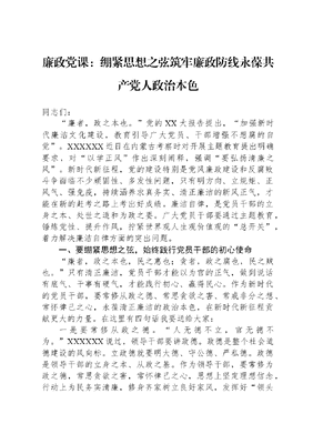 廉政党课:绷紧思想之弦筑牢廉政防线永葆共产党人政治本色同志们:廉者,政之本也。党的XX大报告提出,加强新时代廉洁文化建设,教育引导广大党员、干部增强不想腐的自觉。XXXXXX近日在内蒙古考察时对开展主题教育提出明确要求,对以学正风作出深刻阐释,强调要弘扬清廉之风。新时代新征程,党的建设特别是党风廉政建设和反腐败斗争面临不少顽固性、多发性问题,只有明方向、立规矩、正风气、强免疫,持续涵养求真务实、清正廉洁的新风正气,才能在新的赶考之路上考出好成绩。廉洁自律,是党员干部的立身之本、处世之道和为政之要。广大党员干部要通过主题教育,锤炼党性、提升作风,拧紧世界观人生观价值观的总开关,着力解决廉洁自律方面的突出问题。一、要绷紧思想之弦,始终践行党员干部的初心使命廉者,政之本也,民之惠也;贪者,政之腐也,民之贼也。只有清正廉洁,党员干部才能以为官的正气,做到说话有底气、干事有硬气,才能践行初心、赢得民心。作为新时代的党员干部,要常修从政之德、常思贪欲之害、常戒非分之想、常怀律己之心,永葆清正廉洁的政治本色,在新时代新征程贡献更大的力量。在这里有四句话我要送给大家:一是要常修从政之德。人无德不立,官无德不为。XXXXXX说过,领导干部要讲政德。政德是整个社会道德建设的风向标。立政德就要明大德、守公德、严私德。政德是领导干部的立身之本、从政之基。作为领导干部,要常修为政之德,常思贪欲之害,常怀律己之心,思想上坚定理想信念,行动上为民务实清廉,修身齐家树立良好家风,发挥好领头雁效应作用,做一名忠诚干净担当的好干部,不负党和人民的信任和重托。理想信念是共产党人精神上的钙,精神上缺钙,就会得软骨病。一些党员干部腐败堕落大都是背弃了理想信念,走上违纪违法的不归路。领导干部作为关键少数,要坚持不懈用XXX新时代中国特色社会主义思想武装头脑,坚定理想信念,不忘初心、牢记使命,增强四个意识,坚定四个自信,做到两个维护。始终把纪律和规矩挺在前面,时刻对标对表党章党规党纪,及时校准政治偏差,不断自我净化、自我完善、自我提高,永葆清正廉洁的政治本色。二是要常思贪欲之害。贪如火,不遏则燎原;欲如水,不遏则滔天。一条鱼为什么会咬钩,那是禁不住鱼饵的诱惑,有些人就是那条在贪欲面前乖乖上钩的鱼,有时比那条鱼聪明点,但也是眼里看得破、心中躲不过,挣扎一阵子后最终还是咬了钩。领导干部是作风建设的主体,既要怀着强烈的责任心认真干事,也要怀着如履薄冰的心态保持干净,要不作非分之想,多思贪欲之害,清白做人,干净干事。纵观近年来落马的大老虎,腐化堕落的源头往往就是几百元的小钱、不值钱的土特产等等,碍于人情面子没有推掉,被动接受了第一次,从此彻底打开了思想阀门,从退贿、拒贿到受贿、索贿,一路走一路贪,犹如温水中的青蛙,自己快被煮熟了却仍浑然不觉,最终铸成大错、不可收拾,待到锒铛入狱时方才追悔莫及。作为党员干部,要清醒认识贪欲之害,时刻警醒自己,时刻谨记万事皆有初,当遇到第一次、听到下不为例的时候,必须坚决守住思想防线,把第一次消灭在萌芽状态,才能让贪欲的病毒无机可乘。三是要常戒非分之想。所谓非分之想,就是妄想得到不属于自己分内的、本分以外的好处。 破山中贼易,破心中贼难,这是明代心学大师王阳明说过的话,意思是,山里的贼寇容易被打败,但要打败心里的各种恶念,是非常困难的。有少数党员干部总是存在一点思想,认为自己辛苦工作多年,偶尔收一点、拿一点、捞一点、占一点、吃一点、喝一点、玩一点、乐一点,是人之常情,是蝇头小利,虽是小节,无伤大雅。殊不知,多少贪官就是这样跌进深渊的。 有多少党员干部就因为这一点那一点,违反了中央八项规定及其实施细则精神,付出了惨重的代价。我们最近学习的税务总局党委《关于XX等同志违反中央八项规定精神问题的通报》,以及刚才我们学习的省纪委《关于XX起违反中央八项规定精神问题典型案例的通报》,都是在不起眼的小节上出了问题,最终因小失大,对我们而言都是典型的案例和深刻的教训。作为党员干部,要坚决杜绝非分之想,不该吃的别吃,不该拿的别拿,管住自己的嘴、腿、手,做到不讲排场、不摆阔气、不破标准,事事简朴、处处节约,从小事做起,从小节严起,把个人利益与集体利益、社会利益、人民群众利益统一起来,真正做到工作上不失职、经济上不违规、生活上不越轨。四是要常怀律己之心。古人云:知足不辱,知止不殆,可以长久。从众多落马官员的蜕变轨迹可以看出,腐败问题的发生无一不是从律己不严、放松自我要求、放纵个人欲望开始的。党员干部只有常怀律己之心,做到知足知止,才能守住规矩、抵住诱惑,永葆政治本色。我们最近对办公室人员摸了个底,从年龄结构上来看,50岁以上XX人、40岁以上XX人、3