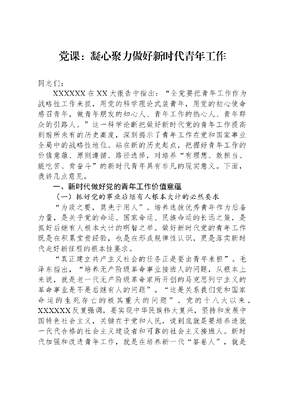 党课:凝心聚力做好新时代青年工作同志们:XXXXXX在XX大报告中指出:全党要把青年工作作为战略性工作来抓,用党的科学理论武装青年,用党的初心使命感召青年,做青年朋友的知心人、青年工作的热心人、青年群众的引路人。这一科学论断把做好新时代党的青年工作提高到前所未有的历史高度,深刻揭示了青年工作在党和国家事业全局中的战略性地位。站在新的历史起点,把握好青年工作的价值意蕴、原则遵循、路径选择,对培养有理想、敢担当、能吃苦、肯奋斗的新时代青年具有非凡的现实意义。下面,我讲几点意见。一、新时代做好党的青年工作价值意蕴(一)抓好党的事业后继有人根本大计的必然要求为政之要,莫先于用人。培养选拔优秀青年作为后备力量,是关乎党的命运、国家命运、民族命运的长远之策,是抓好后继有人根本大计的明智之举。做好新时代党的青年工作既是在积累宝贵经验,也是在形成规律性认识,更是落实新时代走好新征程的根本性要求。真正建立共产主义社会的任务正是要由青年来担。毛泽东指出,培养无产阶级革命事业接班人的问题,从根本上来说,就是老一代无产阶级革命家所开创的马克思列宁主义的革命事业是不是后继有人的问题。这是关系我们党和国家命运的生死存亡的极其重大的问题。党的十八大以来,XXXXXX反复强调,要实现中华民族伟大复兴,坚持和发展中国特色社会主义,关键在于党和人民,说到底就是要培养造就一代代合格的社会主义建设者和可靠的社会主义接班人。新时代加强和改进青年工作,就是在培养新一代答卷人,就是为抓好后继有人打下深厚基础。这充分肯定了青年对于社会变革的重要作用,对确保党和国家事业兴旺发达、薪火相传具有重要意义。后继有人,继是指继承,人是指人才,要教育广大青年继承党的革命传统和优良作风,传承红色基因、赓续红色血脉,以越是艰难越向前的勇气和智慧,增强本领、提高能力,担当重任、迎接挑战,以积极主动的姿态投身于强国建设和民族复兴,成长为党和国家所需的高质量人才。(二)贯彻落实XXXXXX关于青年工作的重要论述的现实需要XXXXXX关于青年工作的重要论述是立足新的历史方位,结合国内外环境,针对新形势下做好青年工作提出的基本要求和根本遵循。这是马克思主义青年理论的丰富和发展,是融合时代条件与中国特色的创新产物,科学回答了新时代培养什么样的青年、如何培养青年以及为谁培养青年的根本问题。在实际工作中,既要以XXXXXX关于青年工作的重要论述为遵循,学会利用科学理论解决问题、获取答案,也要善于结合工作案例,创新工作方法,为青年工作增添生机与活力。在为谁培养青年方面,青年是祖国的未来、民族的希望,也是我们党的未来和希望。这说明,青年的成长成才关乎党的执政地位,关乎国家长治久安,关乎民族复兴大业,做好新时代青年工作是为党育人、为国育才的需要;在培养什么样的青年方面,XXXXXX在党的XX大报告中寄语广大青年立志做有理想、敢担当、能吃苦、肯奋斗的新时代好青年;在如何培养青年方面,XXX提出新时代青年培养的工作目标、工作实施与工作格局,为新时代青年工作的具体开展提供了科学指引。(三)赢得国际竞争战略主动的迫切选择当今世界正处在大发展、大变革、大调整时期。随着新一轮科技革命、产业变革不断深化,国际力量对比深刻调整,全球性不确定性问题和不确定性因素增多,霸权主义、强权政治危害严重,国际形势云谲波诡。虽然我国已在多个领域取得历史性成就,但仍有一些高精尖的短板问题制约国家长远发展。要想成功突围,必须未雨绸缪重视青年的培养,将国家未来、民族希望寄托在堪当复兴重任的青年身上。发展是第一要务、创新是第一动力、人才是第一资源。未来国际力量的对抗,绝不是现在的我们能够预测的,必须提前做好人才培养的科学部署,下好先手棋,争取在全方位、各领域都有德才兼备的高素质人才。在全面建设社会主义现代化国家、全面实现中华民族伟大复兴的形势下,党和国家比历史上任何时期都更加需要强大的人才作为有力的支撑。只有坚定不移地实施新时代人才强国战略,增加多元人才储备,才能获得新征程上的伟大胜利。新时代加强和改进青年工作,重点要做好人才培养,积极应对未来可能出现的风险与挑战,力争在实战对抗中赢得国际竞争战略主动权。二、新时代做好党的青年工作原则遵循(一)政治性与群众性相结合XXXXXX强调:只有坚持党的领导,共青团才能团结带领青年前进,推动中国青年运动沿着正确政治方向前行。一百多年来,在党的领导下,在共青团团结带领下,一代代中国青年主动作为、勇担使命,为党和国家事业取得历史性成就、发生历史性变革贡献了青春力量。政治性是做好新时代青年工作的第一属性,是贯彻落实党的领导,在思想、政治、行动上与党保持高度一致的必然要求;群众性是开展青年工作的方法要求,是以青年为中心开展工作的本质体现,