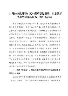11月份廉政党课:筑牢廉政思想根基,以忠诚干净担当展现新作为、做出新贡献廉洁自律是党员干部的立身之本,也是党风廉政建设和反腐败斗争的重要基石。作为党的中坚力量,党员干部的品德和行为直接关系到党的形象和事业的进展。XXXXXX在学习贯彻XXX新时代中国特色社会主义思想主题教育工作会议上指出,要廉洁奉公树立新风,教育引导广大党员、干部增强纪律意识、规矩意识,做到公正用权、依法用权、为民用权、廉洁用权,推动形成清清爽爽的同志关系、规规矩矩的上下级关系、亲清统一的新型政商关系,当好良好政治生态和社会风气的引领者、营造者、维护者。作为新时代党员干部一定要廉洁自律、时刻筑牢反腐倡廉思想防线,将反腐倡廉坚决落到实处,严格执行廉政制度,清清白白做官,踏踏实实为人民服务。今天的党课,我着重从工作中如何才能筑牢廉政根基,如何以实际行动践行忠诚干净担当的政治品格与大家一起交流四个方面的认识。一、弹掉思想尘,加强理论武装是时刻牢筑反腐倡廉思想防线的关键XXXXXX在学习贯彻XXX新时代中国特色社会主义思想主题教育工作会议上强调,我们党始终高度重视理论武装,每逢重大历史关头,都要用党的创新理论统一全党思想,每次党内集中教育也都坚持把理论学习作为首要任务并贯穿始终,为全党团结统一奠定坚实思想基础。面对新时代新征程强国建设、民族复兴使命任务,大力加强理论武装,用XXX新时代中国特色社会主义思想凝心铸魂并转化为坚定理想、锤炼党性和指导实践、推动工作的强大力量,对于统一全党思想和行动、解决党内存在的突出问题推动党和国家事业发展,具有重要意义。第一,把加强党性修养作为终身课题。XXXXXX指出:作风问题本质上是党性问题。领导干部的作风直接关系党内风气和政治生态,关系民心向背,决定着党的群众基础。清正廉洁是共产党人的政治本色,永葆清正廉洁的政治本色是加强党性修养的重要内容。《中国共产党章程》明确要求,党的干部要加强道德修养,讲党性、重品行、作表率,做到自重、自省、自警、自励。新时代新征程,广大党员干部必须增强纪律意识、规矩意识,持续纠治四风,把纠治形式主义、官僚主义摆在更加突出的位置,做到公正用权、依法用权、为民用权、廉洁用权,推动形成清清爽爽的同志关系、规规矩矩的上下级关系、亲清统一的新型政商关系,当好良好政治生态和社会风气的引领者、营造者、维护者。第二,把旗帜鲜明讲政治要求落到实处。理论上的成熟是政治上成熟的基础,政治上的坚定源于理论上的清醒。此次主题教育目的就是让干部更准确的把握新时代党的理论路线和政策方针摆正思想罗盘,保证航线不偏,放开手脚起乘风破浪之势。党员干部要原原本本学,仔细琢磨每一句段,发现新思想的创新点,进而有所思所感;要联系实际学,学而不思则罔、学而不用则废,思考新理论对工作的指导作用,多问为什么,多想怎么干,让先进思想成果化;要坚持不懈学,把学习新思想作为一种习惯、一种爱好,服务于生活和工作,内化新思想的立场观点方法,达到知行合一。在思想上不断增强政治领悟力,在实践中不断转化政治领悟力,以确保政治更加自觉,党性更加坚强。第三,坚持不懈用XXX新时代中国特色社会主义思想凝心铸魂此次主题教育同样是一次打扫政治灰尘,纠正行为偏差的教育,由上自下通过抓学习、改问题、正风气。在新时代的新征程上,我们更要发扬自我革命、自我斗争精神,始终保持政治上的清醒增强政治判断力、政治领悟力、政治执行力,严格兑现打铁还要自身硬的庄严承诺。我们要以此次主题教育为契机,深入学习贯彻XXX新时代中国特色社会主义思想,不断提高政治判断力、政治领悟力、政治执行力。同事作为党员干部,我们更要把学习作为一种政治责任。在学习中更是要坚持读原著、学原文、悟原理,做到及时学、系统学、全面学。要牢牢把握学思想、强党性、重实践、建新功的总要求,更要坚持学思用贯通、知信行统一把牢记嘱托、感恩奋进、走在前列贯穿主题教育始终,切实做到以学铸魂、以学增智、以学正风、以学促干。从最基本的小事做起,做最基础的工作做起,以主题教育为契机,推动日常工作迈上新台阶、呈现新气象。二、多思贪欲害,坚守廉洁自律是每个党员干部的底线要求廉洁是党员干部的底线,是党员干部干事创业的基础。《菜根谭》中有句话,心无物欲,即是秋空霁海;坐有琴书,便成石室丹丘。庸俗化是党内生活的腐蚀剂,它败坏党的风气,腐蚀干部思想,削弱党的凝聚力、战斗力,损害党的形象和事业。一旦染上庸俗之气,那就陷入了温饱思淫欲的陷阱,思的是金钱物欲之淫。如果守不住底线,就守不住党和人民交给自己的政治责任,守不住自己的政治生命线,守不住正确的人生价值观。筑牢思想防线,守住廉洁底线,是每个党员干部和公民应尽的责任和义务。我们要自觉加强作风建设,共同维护党的形象和人民群众的利益,共同营造一个清正廉洁的社会环境