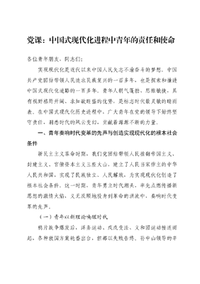 党课:中国式现代化进程中青年的责任和使命各位青年朋友,同志们:实现现代化是近代以来中国人民矢志不渝奋斗的梦想。中国共产党团结带领人民追求民族复兴的一百多年,也是探索和推进中国式现代化道路的一百多年。青年人朝气蓬勃、思维敏捷,具有视野格局开阔、求知欲旺盛的优势,是标志时代最灵敏的晴雨表。在中国式现代化历史进程中,广大青年在党的领导下始终坚守责任,洞悉时代的风云变幻,贡献着源源不断的力量。一、青年奏响时代变革的先声与创造实现现代化的根本社会条件新民主主义革命时期,我们党团结带领人民推翻帝国主义、封建主义、官僚资本主义三座大山,建立了人民当家作主的中华人民共和国,实现了民族独立、人民解放,为实现现代化创造了根本社会条件。这一时期,青年勇立时代潮头,率先点燃传播新思想的激情火焰,义无反顾地投身到革命的洪流中,奏响时代变革的先声。(一)青年以新理论唤醒时代鸦片战争爆发后,洋务运动、戊戌变法、义和团运动接连而起,各种救国方案轮番出台,但都以失败告终。孙中山领导的辛亥革命推翻了统治中国几千年的君主专制制度,但未能改变中国半殖民地半封建的社会性质和中国人民的悲惨命运。这让广大青年认识到无论是通过器物变革捍卫传统的封建老路、还是变革制度实施西方宪政民主,都无法改变中国贫穷落后的现实,中国迫切需要新的革命思想指导革命道路。为开思想先河,陈独秀创办《青年杂志》,掀起了轰轰烈烈的新文化运动。李大钊发表了《青春》一文,吾族青年所当信誓旦旦,以昭示于世者,不在龈龈辩证白首中国之不死,乃在汲汲孕育青春中国之再生,以饱含激情的语言号召鼓励青年投身于爱国运动。马克思列宁主义在中国的广泛传播,首先也是在知识分子和青年学生中。广大青年渴求知识、向往真理,纷纷撰写文章、翻译著作、创立社团,宣传马克思主义。1919年,李大钊在《我的马克思主义观》中对马克思主义作了比较全面和系统的介绍,指出现在改造世界的机运,已经从俄、德诸国闪出了一道曙光。1920年3月,北京大学马克思学说研究会成立,逐渐成为中国北方宣传马克思主义的中心。一部分具有初步共产主义思想的青年知识分子在研读马克思主义书籍的基础上进行社会活动,加深了对马克思主义的了解产生了进一步组织起来开展革命斗争的强烈要求。这一时期,青年知识分子纷纷投身于民族复兴的浪潮之中,以饱满的激情各抒所见,在唤醒民智、清除愚昧、传播科学的现代化理论的过程中发挥着先锋作用。(二)青年立时代潮头创立党团组织马克思列宁主义为中国人民点亮了前进的灯塔,中国共产党的成立使中国人民有了前进的主心骨,为中华民族自主探索现代化道路提供了方向指引和组织保证,也标志着中国主动现代化的肇始。青年具有高度的革命自觉性,在党的成立过程中发挥了先锋引领、筹备组织、宣传教育的作用。青年知识分子穿起工人的服装、学习工人的语言、从事工人的工作,深入工人群众之中进行组织和动员。1921年7月,党的一大在上海召开,代表中最年长的何叔衡不过45岁,最年轻的刘仁静只有19岁,毛泽东当时28岁。正是这些理想高远、情怀深厚、具有高度革命自觉性的知识青年,开创了中国历史的大事变。1922年5月,在中国共产党的直接关怀和领导下,中国社会主义青年团宣告成立,提出团的具体任务一方面为改良青年工人、农人的生活状况而奋斗,并为青年妇女、青年学生的利益而奋斗;一方面养成青年革命的精神,使向为解放一般无产阶级而奋斗的路上走。中国青年运动在中国共产党的领导下、在中国共青团的带领下开始了不平凡的奋斗历程。(三)青年在革命斗争中坚定救国之志中国青年不畏生死,在革命运动中始终站在英勇斗争的最前列,在党的领导下反抗外来侵略、反对独裁统治,在救亡运动中锤炼成长,在革命战火中担当起时代重任。五四运动标志着中国青年作为重要的政治力量登上民族复兴的历史舞台。中国的青年运动有很好的革命传统,这个传统就是永久奋斗。面对国家和民族的生死存亡,一批爱国青年挺身而出,奏响了浩气长存的爱国主义赞歌。全面抗战爆发后,数万爱国青年跋山涉水、冲破各种阻力奔赴延安,为中国革命造就了一批骨干力量。据统计,到抗日战争结束时,中国共产党领导的八路军、新四军壮大到120万人,其中青年占90%以上。解放战争时期,面对国民党反动派违背人民意愿的暴行,青年学生在一二·一运动、抗暴运动五·二运动等爱国运动中展现出身先士卒、一马当先的精神勇〇气。中华人民共和国的成立,使近代以来帝国主义列强侵略压迫中国、欺凌奴役中国人民的苦难历史彻底结束,为实现现代化创造了根本社会条件。经过革命洗礼的青年,共产主义的信仰更加坚定,渴望报国的热情更加热烈,以钢铁般的意志在社会主义革命和建设中发光发热。二、青年积极响应党和国家的号召与中国式现代化的开局奠基社会主义革命和建设时期,我们党团结带领人民进行社会主义革命,确立社会主义基本制度,推进社会主