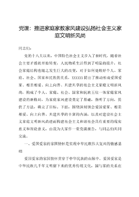 党课:推进家庭家教家风建设弘扬社会主义家庭文明新风尚同志们:党的十八大以来,中国特色社会主义步入了新时代,随着社会主要矛盾的开始转变,人民物质生活得到了明显的提升,社会家庭结构也随之发生巨大的改变,对于如何处理好个人、家庭、社会、国家和民族的关系,XXXXXX提出了推动形成爱国爱家、相亲相爱、向上向善、共建共享的社会主义家庭文明新风尚,构成了个人、家庭、社会、国家和民族五位一体家庭家风建设的新格局,为家庭家风建设奠定了基础,指明了方向,提供了方法,确立了目标。下面,围绕深刻领会爱国爱家、相亲相爱、向上向善、共建共享的丰富的内涵,以及对建设社会主义家庭文明新风尚进而构建社会主义和谐社会具有重要的现实意义和理论意义,由我为大家作一堂党课报告,与同志们共同交流。一、爱国爱家的家国情怀是实现中华民族伟大复兴的情感基础爱国爱家的家国情怀贯穿于中华民族的血脉中。爱国爱家是中华民族几千年文明留下来的优秀传统文化,国与家的关系在中国几千年文明古国中经常被拿出来讨论,《礼记·大学》说道:身修而后家齐,家齐而后国治,国治而后天下平。从这段话可看出,家不仅是个人的依托,更是国的根本,这与XXXXXX所提及的家是最小国,国是千万家如出一辙,因此爱国爱家不仅体现了马克思主义与中华优秀传统文化相结合的价值意蕴,更是两个结合在家风建设中的具体表现之一。(一)家庭文明新风尚中爱国爱家的基本涵义爱国与爱家两者是内在统一的。家庭是国家的基础,千千万万个家庭一同构成了整个国家,国是由每一个小家所组成的一个大家。因此爱国爱家这一概念本身具有丰富内涵,需要分别从爱国、爱家以及爱国爱家这三个词进行深入探析。首先是爱国,爱国是中华民族传承几千年的民族精神。爱国即爱自己的大家。个人理想的实现离不开国家的稳定与发展,实现中华民族的伟大复兴需要全民族为自己的国家共同努力,爱国即是实现个人理想的必要条件,更是实现伟大复兴的中国梦的根本动力。在历史的长河中,爱国的情怀始终贯穿于中华民族精神的形成与发展,爱国的精神一直流淌在中华民族的血液中,近代以来中华民族遭受了前所未有的劫难,多少仁人志士奔走呐喊提出多种救国方案,包括戊戌变法、辛亥革命等,虽以失败告终,但也体现出中华民族浓烈的爱国情感,中华儿女始终将自身的命运与国家命运紧密相连。在中国特色社会主义进入新时代的今天,爱国始终引领着我们朝着伟大梦想而奋斗的精神主线,厚植爱国情怀,把爱国融入到建设中国特色社会主义伟大事业当中,贯彻到实现中华民族伟大复兴的具体实践中,XXXXXX指出:爱国主义的本质就是坚持爱国和爱党、爱社会主义高度统一。其次是爱家,爱家是中华民族优秀的传统美德。爱家即爱自己的小家,热爱自己的每一个家庭成员,形成良好的家庭氛围和家庭关系。这是中华传统家庭的美德,不仅要坚持、要继承,还要发展。无论物质文明发展到多么发达的程度,这种爱家的优秀传统美德不仅不可丢,而且要完善和发扬。改革开放以来,物质文明的不断丰富,必定给精神文明带来相应的影响和冲击,许多正确的思想也受到了挑战,家庭作为个体的归宿所在,必定要在家庭氛围上形成正确的价值观念,爱家是形成和谐美好家庭氛围的关键,只有家庭的每个成员都热爱自己的家庭,正确的价值观念才得以传播,使个体经得起社会上各种思潮的考验。家是个体发展成人的摇篮。XXXXXX强调:家庭是孩子的第一个课堂,父母是孩子的第一个老师。一个人的世界观、人生观和价值观很大程度上就在家庭这一个课堂上萌芽和形成的,并可以影响一生。因此和谐美好的家庭关系和家庭氛围,对个体的成长发挥着至关重要的作用,无论在家庭中扮演哪一个角色,都需要将爱家摆在处理家庭关系中的首要位置,这样子才能让课堂的内容积极向上,氛围轻松愉快,教师殷勤教导,关系和谐。学生虚心学习,增长知识,茁壮成长。家是个体的归宿和港湾。XXXXXX强调家庭不只是人们身体的住处,更是人们心灵的归宿。良好的家风能够让个体家庭幸福美满,社会和谐安定,正如XXXXXX所说的:家庭和睦则社会安定,家庭幸福则社会祥和,家庭文明则社会文明。最后是爱国爱家。爱国爱家是中华民族自古以来传承至今的优秀文化精髓和几千年中华文明的精神支柱。正所谓天下之本在国,国之本在家,家之本在身。深入探究和揭示爱国爱家之间的辩证关系是践行爱国与爱家相统一的必然要求。一方面,家庭是国家形成的基础。强调小家是国家形成的必要条件,家是最小国。XXXXXX将家庭比喻为社会的细胞,家是各种社会中的最小单位,国家这一个有机体正是由无数个家庭这一细胞发挥自身的作用,使得有机体正常运转发展壮大,离开这些细胞的正常发育繁殖,国家这个有机体是无法形成和正常运转的,更无法发展。因此家庭是国家的基础,无论社会物质条件怎么丰富,始终不能脱离开家庭这