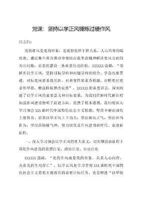 党课:坚持以学正风锤炼过硬作风同志们:党的作风是党的形象,是观察党群干群关系、人心向背的晴雨表。通过集中教育推动全党以自我革命精神解决党风方面的突出问题,是党的建设一条重要历史经验。XXXXXX强调,要抓实以学正风,坚持目标导向和问题导向相结合、学查改相贯通,对标党风要求找差距、对表党性要求查根源、对照党纪要求明举措,增强检视整改实效。XXXXXX的重要讲话,深刻阐述了以学正风的重要意义和目标要求,为我们在新时代新征程加强作风建设指明了前进方向、提供了根本遵循。我们要深入学习领会XXX新时代中国特色社会主义思想,坚持不懈在深化主题教育、抓实以学正风上下功夫,学出新风正气,学出担当作为,学出昂扬精气神,努力以优良作风建功新时代、奋进新征程。一、深入学习领会以学正风的重大意义,切实增强新征程上深化作风建设的思想自觉、政治自觉、行动自觉XXXXXX强调,党的作风就是党的形象,关系人心向背,关系党的生死存亡。以学正风是学习贯彻XXX新时代中国特色社会主义思想主题教育的重要目标任务,也是增进以学铸魂以学增智以学促干的重要保障。开展主题教育,必须深入学习领悟XXXXXX关于作风建设的重要论述,深刻领悟以学正风的重大意义,坚持和运用好贯穿其中的立场、观点、方法,以永远在路上的坚韧和执着推进作风建设,努力以好作风好形象创造新伟业。抓实以学正风是弘扬党的优良传统的必然要求。传承光荣传统、弘扬优良作风是我们党一以贯之的重要原则,是党百年来克敌制胜的重要法宝。XXXXXX强调,全党同志要把老一辈革命家和共产党人留下的光荣传统和优良作风传承好发扬好,勇于推进党的自我革命,坚定不移推进全面从严治党。这次主题教育,一个重要任务就是教育引导广大党员干部经受思想淬炼、精神洗礼,务必不忘初心、牢记使命,务必谦虚谨慎、艰苦奋斗,务必敢于斗争、善于斗争。通过抓实以学正风,进一步传承弘扬好党的优良作风,才能更好地学思想、强党性、重实践、建新功。新时代新征程上,开展主题教育,抓实以学正风,必须教育引导广大党员干部深入学习领悟我们党百年奋斗形成的宝贵经验和优良作风,持之以恒在以学正风、加强作风建设上下功夫,为党和人民事业不断从胜利走向新的胜利提供坚强保障。抓实以学正风是推动党员干部担当作为的必然要求。风清则气正,气正则心齐,心齐则事成。XXXXXX强调,推动改革发展事业,关键在党,关键在广大党员干部要有优良的工作作风。这次主题教育,一个重要方面就是教育引导广大党员干部勇担当、善作为、重实干,增强干事创业的责任感和使命感,不断提振锐意进取、开拓创新的精气神。当前,我们正在推进中国式现代化建设,这是一项前无古人的开创性事业,对各级党组织和领导干部的工作作风提出了新的更高要求,必须通过持之以恒的学习教育,推动党员干部始终保持担当作为、干事创业的良好作风。新时代新征程上,开展主题教育,抓实以学正风,必须进一步引导广大党员干部振奋精神、昂扬斗志、鼓足干劲,不断以作风攻坚推动发展攻坚、改革攻坚,以新作风、新作为、新气象推动高质量发展取得新成效。抓实以学正风是涵养良好政治生态的必然要求。作风建设是党的建设的重要组成部分,也是净化政治生态的重要支撑XXXXXX强调,政治生态好,干部队伍就会风清气正、心齐气顺,社会风气就会积极向上、充满正能量。政治生态不好,各种歪风邪气就会冒出来。这次主题教育,一个重要方面就是要解决思想不纯、组织不纯方面存在的突出问题,不断增强党的自我净化、自我完善、自我革新、自我提高能力。只有通过抓实以学正风,在以学习严作风上常抓不懈、久久为功,才能有效消除影响党的先进性纯洁性的因素,清除侵蚀党的肌体健康的病毒,确保党永远不变质、不变色、不变味。新时代新征程上,开展主题教育,抓实以学正风,必须教育引导广大党员干部始终以刀刃向内的自我革命精神,把纠四风树新风作为应变局、开新局的重要切入点,坚决防止不良习气滋长蔓延,确保我们党始终充满蓬勃生机和旺盛活力,在新的赶考之路上不断考出好成绩。抓实以学正风是巩固党的执政基础的必然要求。作风问题,核心是党和人民群众的关系问题,根本是始终保持党同人民群众的血肉联系。XXXXXX深刻指出,执政党如果不注重作风建设,听任不正之风侵蚀党的肌体,就有失去民心、丧失政权的危险。实践证明,作风上的问题绝对不是小事,如果不坚决纠正不良风气,任其发展下去,就会像一座无形的墙把我们党和人民群众隔开,我们党就会失去根基、失去血脉、失去力量。开展主题教育,一个重要目标就是践行宗旨为民造福,教育引导广大党员干部牢固树立以人民为中心的发展思想,不断增强人民群众获得感、幸福感、安全感。新时代新征程上,开展主题教育,抓实以学正风,必须教育引导广大党员干部始终坚持人民至上,自觉从党和人民利益出发正作风、严作风,做到一切为了人民