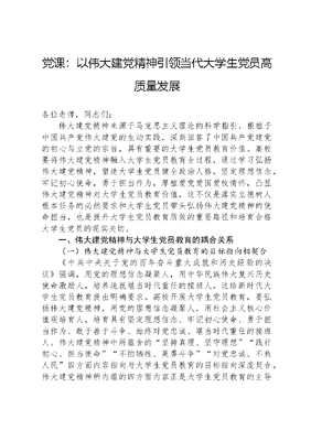 党课:以伟大建党精神引领当代大学生党员高质量发展各位老师,同志们:伟大建党精神来源于马克思主义理论的科学指引,根植于中国共产党伟大建党的生动实践,深刻回答了中国共产党建党的初心与立党的宗旨,具有重要的大学生党员教育价值。高校要将伟大建党精神融入大学生党员教育全过程,通过学习弘扬伟大建党精神,塑造大学生党员健全政治人格,坚定理想信念,牢记初心使命,勇于担当作为,厚植爱党爱国爱校情怀,凸显伟大建党精神对大学生党员教育价值,这不仅是落实立德树人根本任务的必然要求和大学生党员带头弘扬伟大建党精神的使命担当,也是提升大学生党员教育质效的重要路径和培育合格大学生党员的现实关切。一、伟大建党精神与大学生党员教育的耦合关系(一)伟大建党精神与大学生党员教育的目标指向相契合《中共中央关于党的百年奋斗重大成就和历史经验的决议》强调,用党的理想信念凝聚人,用中华民族伟大复兴历史使命激励人,培养造就堪当时代重任的接班人,这给新时代大学生党员教育提出明确要求。高校开展大学生党员教育,要弘扬伟大建党精神,用党的理想信念凝聚人,用社会主义核心价值观培育人,培育具有坚定理想信念、牢记初心使命、勇于担当作为、敢于善于斗争、始终对党忠诚、堪当时代重任的接班人。伟大建党精神中所蕴含的坚持真理、坚守理想践行初心、担当使命不怕牺牲、英勇斗争对党忠诚、不负人民四方面内容指向与大学生党员教育的目标指向深度契合,伟大建党精神所内蕴的四方面内容正是大学生党员教育的主导目标。高校大学生党员教育要以伟大建党精神为目标指向,主动将伟大建党精神纳入大学生党员教育必修课,提升教育质效。(二)伟大建党精神与大学生党员教育的主旨内涵相契合坚持真理、坚守理想不仅是伟大建党精神之魂,也是高校开展大学生党员理想信念教育的核心内容。理想信念教育在大学生党员教育中处于绝对核心地位。践行初心、担当使命是伟大建党精神之要,是高校开展大学生党员社会主义核心价值观教育的重要素材。不怕牺牲、英勇斗争是伟大建党精神之源,是高校开展大学生党员奋斗精神和斗争精神的重要支撑。奋斗精神与斗争精神是大学生党员教育必修课,要时时磨砺,锤炼具备勇于斗争、甘于奉献的政治品格。对党忠诚、不负人民是伟大建党精神之本,是高校开展大学生党员爱党爱国、爱校荣校教育的重要依据。高校要将伟大建党精神融入大学生党员教育全过程,融入大学生党员的理想信念教育、社会主义核心价值观教育、奋斗精神教育、家国情怀教育等方面。(三)伟大建党精神与大学生党员教育的育人功能相契合伟大建党精神深度契合新时代大学生党员教育的内在需求能为增强大学生党员的志气、骨气、底气提供源源不断的精神养料。百年来,伟大建党精神在塑造大学生党员坚定的理想信念和健全的政治人格,增进大学生党员的政治认知、政治认同与政治信仰,激励着大学生党员为中华民族伟大复兴中国梦的接续奋斗等方面发挥育人功能。伟大建党精神在大学生党员实践育人方面也有重要引领作用,高校要充分挖掘自身及周围红色资源、文化、地标的育人功能,提升伟大建党精神在大学生党员实践育人中的作用。伟大建党精神从精神内涵层面、理论建构与实践生发等方面,都与大学生党员教育育人功能深度关联。二、伟大建党精神对大学生党员教育的价值体现(一)以坚持真理、坚守理想精神引领学生坚定理想信念坚持真理、坚守理想精神,彰显着马克思主义政党理论的先进性,诠释了中国共产党人崇高的政治信仰。中国共产党要追求的真理,就是马克思主义真理。如1919年毛泽东在《〈湘江评论〉创刊宣言》中所言:要不受一切传说和迷信的束缚,要寻着什么是真理。1921年毛泽东把马克思主义唯物史观作为吾党哲学依据。而中国共产党所要追求与坚守的理想,就是共产主义理想。1918年李大钊在《布尔什维主义的胜利》中坚信,将来的环球,必是赤旗的世界!他把布尔什维主义视为世界革命的信条,不惜付出生命的代价。坚持马克思主义真理、坚定共产主义理想信念是中国共产党人战胜困难的法宝。XXXXXX强调:理想信念是共产党人精神上的钙,没有理想信念,精神上就会缺钙,就会得软骨病。高校要以坚持真理、坚守理想精神来引领大学生党员坚持马克思主义真理、坚定理想信念,补足精神上的钙,使其成为堪当民族复兴重任的时代新人。(二)以践行初心、担当使命精神强化学生牢记初心使命马克思、恩格斯在其《共产党宣言》中强调:无产阶级运动是绝大多数人的,为绝大多数人谋利益的独立运动。正是亲历了近代中国人民的悲惨遭遇,李大钊、陈独秀等革命先辈萌生了建立中国共产党的伟大想法,立志救国图存。1919年毛泽东在创办《湘江评论》时指出:什么力量最强?民众联合的力量最强。紧紧依靠人民,依靠民众联合力量,这是中国共产党人不变的初心。1925年毛泽东在《政治周报》创刊号中指出,
