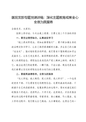 医院支部专题党课讲稿:深化主题教育成果全心全意为民服务全体党员,大家好:按照工作计划,今天由我上党课,主要汇报三个方面的内容一、要坚定理想信念,认真踏实学习纸上得来终觉浅,得知此事要躬行,要不断加强自身的政治理论知识学习,让自己保持着清醒的头脑,多让自己的头脑充充电,面对错综复杂的环境,我们要有丰富的理论知识去武装自己,让自己攻克难关,取得辉煌的成绩,要牢记我们共产党人的理想信念,理想信念是我们共产党人精神上的钙,缺失了它,就会让我们得软骨病,一蹶不振。不论以前、现在还是未来我们都要以坚定的理想信念作为我们的力量源泉。二、要提高道德修养,全意为民服务民之所忧,我之所思;民之所思,我之所行。一个优秀的党员干部,不仅要有坚定的理想信念,还要有高尚的品德,不断提升自己的品德修养。在服务群众的过程中,要时刻谨记我们的服务只有起点,没有终点,只有不足,没有满足,并且在服务群众的过程中要带着感情,带着责任,热心解难,尽心服务。在工作的过程中,我们要从自己做起,从小事做起,注意自己的一言一行,把群众对于我们工作做得满不满意、认不认可作为自己工作的准则,积极办好每一件事,遇到事情不推脱、不卸责,把群众的利益扛在肩上、记在心里,要做到想群众之所想,急群众之所急,只要全心全意为群众排忧解难,群众也会把我们记在心中。三、要立足本职工作,强化提高业务敬业务实,求精创新,要求做好自己的本职工作,不断地提高自己的业务能力,增强自身的实力,让自己成为其他党员干部的标杆,为群众做好事情的同时也要不断地进行创新,创新是第一生产力,让自己把本职工作做精做熟,切实从实际出发,做好每件事情,把好每一关,尽全力做到完美,让自己有一个较高的业务水平。也要热爱自己的工作,把自己的工作作为人生的第一追求,在工作中不断地超越自我。第一,不能忘了我们是谁。我们是人民的勤务员。共产党人最重要的社会关系,就是同人民群众的关系。XXXXXX多次以人民的勤务员自喻,并提出了我将无我,不负人民的自我要求。我们不能忘记我们是人民的勤务员,始终坚持全心全意为人民服务的根本宗旨,始终保持党和人民群众的血肉联系。在工作中,我们医院积极探索开展五味俱全开放式主题党日活动,由课堂型、传统型、单一型的党日活动向互动型、实践型、开放型转变,把党性教育从被动接受向主动参与、从传统说教向身心体验、从集中突击向常态化运行转变,让党味更浓、情味更真、趣味更多、回味更久。先后开展了党建引领送健康主题党日活动我院医务工作者利用休息时间到附近社区义诊,及上门看望鳏寡孤独老人,免费测血压、测血糖及健康知识教育等。用我们医务工作者的实际行动为党徽增光、给党旗添彩。第二,不能忘了从哪里来。我党是在人民群众的鼎力支持下壮大的。人民是历史的创造者,是社会前进的实践主体。回顾历史,新民主主义革命的伟大胜利是人民的小推车推出来的,社会主义建设的伟大成就是人民的汗水浇灌的,改革开放的伟大变革是人民群众在创新创造中闯出来的。离开了人民,党的事业就会变成无根的浮萍。任何时候都要紧紧依靠人民创造历史、成就伟业。一个党员就是一面旗帜,一个支部就是一座堡垒!特别是近三年的疫情防控中,我们医院全体医务工作者,尤其是党员同志们身先士卒,积极配合市领导安排,每个方仓,每个隔离点都能看到我们的身影;成功完成了新冠病毒的防治工作,最大程度保障群众生命健康。第三,不能忘了为什么出发。正如XXXXXX反复强调的,走得再远、走到再光辉的未来,也不能忘记走过的过去,不能忘记为什么出发江山就是人民,人民就是江山。从南湖红船到远航巨轮,我们党在船上生、在浪里走,始终不忘水可载舟,亦可覆舟的历史经验,始终将人民二字大大地写在自己的旗帜上。进入新时代,为人民谋幸福有了新的时代内涵。这就要求我们走得再远,都不能忘记人民,走到再光辉的未来,都要践行以人民为中心的发展思想,不断满足人民群众对美好生活的向往。谢谢大家聆听!