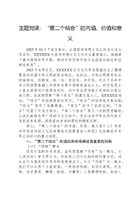 主题党课:第二个结合的内涵、价值和意义2023年10月7日至8日,全国宣传思想文化工作会议在北京召开。XXXXXX对宣传思想文化工作作出重要指示,强调要着力赓续中华文脉、推动中华优秀传统文化创造性转化和创新性发展。2023年6月2日,XXXXXX在文化传承发展座谈会上强调要深刻把握中华文明的突出特性,他指出,中华文明具有突出的连续性、创新性、统一性、包容性、和平性。在五千多年中华文明深厚基础上开辟和发展中国特色社会主义,把马克思主义基本原理同中国具体实际、同中华优秀传统文化相结合是必由之路。在深刻理解两个结合的重大意义上,XXXXXX指出,结合的前提是彼此契合,结合的结果是互相成就,结合筑牢了道路根基,结合打开了创新空间,结合巩固了文化主体性。第二个结合是又一次的思想解放,让我们能够在更广阔的文化空间中,充分运用中华优秀传统文化的宝贵资源,探索面向未来的理论和制度创新。那么,第二个结合的内涵、价值、意义是什么?传承中华优秀传统文化还有哪些问题需要深入研究?这些都是学术界正在研讨的重大话题。一、第二个结合的提出和系统阐述是重要的创新(一)传统释义谈到文化的传承发展,首先要理解传统这一概念。什么是传统?学术界认为,传统是人们代代相传的行事方式,对社会行为具有规范作用和道德感召力。对于传统这一概念,我们可以从两个方面来看:一是物质传统,如历史建筑、纪念碑、历史景观、雕塑、绘画、书籍等;二是精神传统,包括人类以往创造的制度、信仰、价值观和行为方式等无形的精神产品,比如儒家思想传统、文人画传统等。在精神传统中,有一个概念叫实质性传统。实质性传统是指崇尚过往的成就智慧和制度,并主张把过去继承下来的行为方式视为楷模和指南的倾向,比如对宗教和家庭的感情、对祖先和权威的敬重、对家乡的怀恋之情等。以上是对传统这一关键词的介绍。(二)在中国共产党的历史中,中国共产党人对待传统文化的态度发生了深刻变化我们知道,新文化运动的先驱都是持批判传统文化态度的当然,这里是有一个背景的。曾是资产阶级改良派代表人物的康有为在辛亥革命后堕落为一个狂热的尊孔复辟派。1913年11月,康有为致电袁世凯,要求袁世凯尊圣卫道令学校读经。这与复辟称帝的袁世凯的想法不谋而合。对于袁世凯、康有为尊孔复古的做法,陈独秀、李大钊、胡适等人进行了强烈抵制和反对,并由此发动了声势浩大的新文化运动。陈独秀发表抨击尊孔复古的文章,提出打倒孔家店。陈独秀在《驳康有为致总统总理书》中指出,孔教与帝制,有不可离散之因缘。1917年,李大钊发表了《孔子与宪法》一文,明确指出,孔子者,历代帝王专制之护符也。宪法者,现代国民自由之证券也。专制不能容于自由,即孔子不当存于宪法。瞿秋白在《〈新青年〉之新宣言》中指出:中国的旧社会旧文化是什么?是宗法社会的文化,装满着一大堆的礼教伦常,固守着无量数的文章词赋;礼教伦常其实是束缚人性的利器,文章词赋也其实是贵族淫昏的粉饰。那么,青年毛泽东对传统是什么态度?这也是大家非常关注的。1919年,毛泽东同志在《湘江评论》上发表《健学会之成立及进行》一文。他在阐发与论述该学会章程中的自由讨论学术一条时指出:我们反对孔子,有很多别的理由。单就这独霸中国,使我们思想界不能自由,郁郁做二千年偶像的奴隶,也是不能不反对的。随着我们党对传统文化认识的逐步深入,中国共产党人对传统文化的态度发生了变化。新民主主义革命时期,中国共产党人更多是以辩证唯物主义和历史唯物主义的态度来看待中国传统文化的。1938年10月,毛泽东同志在党的扩大的六届六中全会上指出,我们不应当割断历史。从孔夫子到孙中山,我们应当给以总结,承继这一份珍贵的遗产。在《新民主主义论》中,毛泽东同志提出,清理古代文化的发展过程,剔除其封建性的糟粕,吸收其民主性的精华,是发展民族新文化提高民族自信心的必要条件。新中国成立后,中国共产党提出在文艺领域要坚持推陈出新、洋为中用、古为今用的方针。毛泽东同志提出,对中国的文化遗产,应当充分地利用,批判地利用。改革开放以后,1982年我国颁布了《中华人民共和国文物保护法》。1985年,中国正式加入《保护世界文化和自然遗产公约》。2004年,我国加入《保护非物质文化遗产公约》。2005年,《国务院关于加强文化遗产保护的通知》发布。2011年,《中华人民共和国非物质文化遗产法》发布。可以看出,改革开放以后我国越来越重视对非物质文化遗产的保护。党的十八大以来,我国更加重视中华优秀传统文化在治国理政中的重要作用。XXXXXX指出,宣传阐释中国特色,要讲清楚每个国家和民族的历史传统、文化积淀、基本国情不同,其发展道路必然有着自己的特色;讲清楚中华文化积淀着中华民族最深沉的精神追求,是中华民族生
