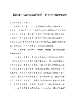 主题团课:坚定青年听党话、跟党走的政治信念各位青年朋友,同志们:党的十八大以来,XXXXXX多次强调青年要坚定不移听党话、跟党走。2023年6月,XXXXXX在同团中央新一届领导班子成员集体谈话时进一步强调,要引导广大青年坚定听党话、跟党走的政治信念。将坚定听党话、跟党走提升到政治信念的高度,反映了以XXX同志为核心的党中央对青年听党话、跟党走的高度重视。借此机会,我讲几点体会,与同志们共同交流。一、以史为鉴,深刻认识听党话、跟党走是中国先进青年的政治信念听党话、跟党走是中国先进青年在党的百年奋斗历程中一以贯之的优良传统与毫不动摇的政治信念。历史和实践都印证了坚持听党话、跟党走的正确性,中国先进青年在理想信念求索与人生追求中确证着听党话、跟党走的必要性。哪里有需要,哪里有困难,哪里就有中国的先进青年。在中国共产党的百年奋斗历程中,涌现出一批批先进青年。在革命战争年代,他们为党和祖国抛头颅、洒热血,奉献自己的青春生命;在和平发展年代,他们与党和祖国同呼吸、共命运,贡献自己的青春力量(一)在新民主主义革命时期,广大青年在中国共产党的领导下,为争取民族独立与人民解放浴血奋战。在这一时期,广大青年发挥着革命生力军的作用,在党的领导与号召下,奔赴前线冲锋陷阵,不怕牺牲、英勇战斗。革命烈士陈延年曾说:如果怕死,就不要做共产党员。秉承着这样的人生信条,他严守党的秘密,宁死不屈,29岁英勇就义。五四运动的发动者和领导者之一的恽代英,发表了大量文章宣传马克思主义思想,领导青年学生运动。他乐观地说,我们要安贫乐道,这个道就是革命的理想。1931年,年仅36岁的恽代英壮烈牺牲。抗日民族英雄杨靖宇高呼:一个忠贞的共产党员,民族革命战士,为了伟大的共产主义理想,为了中华民族的解放事业,头颅不惜抛掉,鲜血可以喷洒,而忠贞不贰的意志是不会动摇的。在35岁那年杨靖宇被敌军包围,壮烈牺牲,他对党的忠贞与赤诚展现了共产主义战士的崇高气节。这一时期,大批青年楷模不惜牺牲自己的生命,践行了坚定不移听党话、跟党走的政治信念。(二)在社会主义革命和建设时期,广大青年在中国共产党的号召下,为改变新中国一穷二白的落后面貌投身建设社会主义的浪潮。在这一时期,广大青年紧密地团结在党的周围,在党的领导下艰苦奋斗、乐于奉献。在抗美援朝战场上,黄继光、杨根思、邱少云等献出了宝贵的生命,为广大青年树立了光辉榜样。在工作和生活中,雷锋、王进喜等恪尽职守、以身作则、舍己为人,为社会主义建设贡献自己的全部力量,展现了共产党员伟大的理想信念和高尚的人格气质。我国氢弹之父于敏在35岁时接到氢弹理论探索的任务,开始了长达28年的隐姓埋名的生活,将自己的一切奉献给了祖国的核武器科技事业,其对党和国家的赤诚之心感动和影响着广大青年。这一时期,广大先进青年在投身社会主义革命和建设浪潮中发挥着主动精神与先锋作用,践行着听党话、跟党走的坚定政治信念。(三)在改革开放和社会主义现代化建设新时期,广大青年在中国共产党的引领下艰苦奋斗、积极进取。在这一时期,广大青年坚持党的领导,忠诚党的事业,不忘初心、牢记使命,坚守岗位,走在社会主义建设各条战线的最前沿,以自强不息的精神有力推动着中国社会主义现代化建设的历史进程。能为社会,为人民做点事,对我来说是最大的幸福!张海迪如是说。在平凡的岗位上做到不平凡,便是人生的最大意义,张海迪的事迹激励着无数青年坚定理想信念与人生追求。首届中国青年五四奖章获得者秦文贵怀揣着我为祖国献石油的信念,常年奔波在荒漠从事钻井工作,用科学知识与满腔热血攻坚克难,为祖国油田开发和建设作出了杰出贡献。在新长征突击手、五讲四美三热爱、保护母亲河等号召下,广大青年积极进取、争优争先,各行各业涌现出了一批批先进青年,展现了新时期青年群体的精神面貌。这一时期,广大青年在平凡岗位上创造着一个个不平凡的业绩,在为改革开放和社会主义现代化建设添砖加瓦中践行着听党话、跟党走的坚定政治信念。(四)在新时代新征程上,广大青年传承弘扬优良传统,展现青年朝气、担当青年责任、发挥青年力量,在青春的火热实践中赓续初心使命,坚定听党话、跟党走的人生追求与政治信念。新时代青年既面临着难得的建功立业的人生际遇,也面临着天将降大任于斯人的时代使命,时代给了新时代青年更好的发展舞台,同样对其有着更高的要求和期许,更需要新时代青年有理想、敢担当、能吃苦、肯奋斗,更加自觉主动地把握大好机遇、克服挫折挑战,为党和国家的事业发展贡献全部力量进入新时代以来,涌现出了黄文秀、杜富国、陈祥榕等先进青年代表,他们为党、为国、为人民奉献了自己的青春力量乃至生命只有把个人的追求融入党的理想之中,理想才会更远大。黄文秀用生命诠释了对党的忠诚、对初心的坚守和对人民的奉献。你退