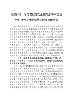 专题讲稿:学习贯彻落实全国两会精神 团结奋进 坚定不移朝着美好蓝图奋勇前进2024年全国两会召开,政府工作报告提出了今年发展主要预期目标和工作重点,XXXXXX在参加各省代表团审议时也提出了重要指示批示精神。政府工作报告通篇贯穿XXX新时代中国特色社会主义思想,全面贯彻党的XXX、二十届二中全会精神和政府工作报告等决策部署,总结工作全面客观、提出目标切实可行、政策取向精准有力、任务部署具体明确。我们要深刻领悟两个确立的决定性意义,增强四个意识、坚定四个自信、做到两个维护,坚持两个毫不动摇。要把思想和行动统一到党中央决策部署上来,聚焦今年经济社会发展目标任务,加快培育新质生产力,努力构建新发展格局,着力推动高质量发展。今天的党课重点围绕全国两会精神,就今年的重点工作任务,以及如何贯彻落实,与大家进行交流。一、过去一年高质量发展成效显著,成绩来之不易,进一步证明两个确立对应对各种风险挑战、推进中国式现代化建设具有决定性意义过去一年,以XXX同志为核心的党中央团结带领全党全军全国各族人民,圆满完成经济社会发展主要目标任务,取得新的巨大成就。历史和实践充分证明,我们取得的成绩归根结底在于有以XXX同志为核心的党中央坚强领导,有XXX新时代中国特色社会主义思想科学指引。我们既要学习领会党中央决策部署,也要明确政府工作报告提出的目标任务,还要立足本地区经济社会发展实际,聚焦经济建设这一中心工作和高质量发展这一首要任务,坚定信心,引导预期,狠抓落实,扎实推动高质量发展不断迈上新台阶,以实际行动和工作成效坚定拥护两个确立、坚决做到两个维护。第一,两个确立是党和国家事业取得历史性成就、发生历史性变革的决定性因素。中国特色社会主义进入新时代,面对外部环境深刻复杂变化带来的许多新的风险挑战,面对国内改革发展稳定不少长期没有解决的深层次矛盾和问题以及新出现的一些矛盾和问题,面对党治国理政的种种重大考验,以XXX同志为核心的党中央以伟大的历史主动精神、巨大的政治勇气、强烈的责任担当,统筹国内国际两个大局,贯彻党的基本理论、基本路线、基本方略,统揽伟大斗争、伟大工程、伟大事业、伟大梦想,坚持稳中求进工作总基调,出台一系列重大方针政策,推出一系列重大举措,推进一系列重大工作,战胜一系列重大风险挑战,攻克了许多长期没有解决的难题,办成了许多事关长远的大事要事,推动党和国家事业取得历史性成就、发生历史性变革。正是在这样的时代呼唤、历史选择、人民期盼和实践锻造中,XXXXXX当之无愧地成为党中央的核心、全党的核心。全面建设社会主义现代化国家、全面推进中华民族伟大复兴,关键在党。在以中国式现代化全面推进强国建设、民族复兴伟业新征程上,要进一步深刻领悟两个确立的决定性意义,更加自觉地维护XXXXXX党中央的核心、全党的核心地位,更加自觉地维护以XXX同志为核心的党中央权威和集中统一领导,全面贯彻XXX新时代中国特色社会主义思想,坚定不移在思想上政治上行动上同以XXX同志为核心的党中央保持高度一致。第二,切实把两个确立转化为坚决做到两个维护的自觉。2023年是极为不易、极不平凡的一年,面对异常复杂的国际环境和艰巨繁重的改革发展稳定任务,以XXX同志为核心的党中央以不畏浮云遮望眼的远见卓识、泰山压顶不弯腰的非凡气魄、咬定青山不放松的战略定力,从容应对世界之变、时代之变、历史之变,团结带领全国各族人民推动经济社会各项事业交出了世界瞩目、人民满意的亮丽成绩文可居文库——海量学习资料,手机电脑下载www.wenkeju.com单,成功推进和拓展了中国式现代化,用新的伟大奋斗创造了新的伟大奇迹。我们要深刻领会两个确立的决定性意义,深刻把握两个确立的必然逻辑,切实增强对两个确立的政治认同、思想认同、理论认同、情感认同,把两个确立转化为坚决做到两个维护的思想自觉、政治自觉、行动自觉,始终牢记XXXXXX的殷殷嘱托,以更大担当和作为,把中央经济工作会、政府工作报告确定的具体工作任务落到实处,奋力谱写现代化建设新篇章。第三,坚定拥护两个确立,坚决做到两个维护,为强国建设和民族复兴伟业营造更有利国际环境、提供更坚实战略支撑。每年全国两会,XXXXXX总会与代表委员共商国是,热切询问百姓冷暖,动情讲述生动故事,留下了许多暖心瞬间和精彩话语。我们要深刻认识,两个确立是推动党和国家事业取得历史性成就、发生历史性变革的决定性因素,是战胜一切艰难险阻、应对一切不确定性的最大确定性、最大底气、最大保证。我们要进一步深刻领悟两个确立对新时代党和国家事业发展、对推进中华民族伟大复兴历史进程具有的决定性意义,把增强四个意识、坚定四个自信、做到两个维护体现在理想信念、政治生活、立场定力