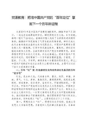 党课教育:把准中国共产党的百年定位擘画下一个百年新征程大家好!今年是中国共产党建党103周年。1921年的7月23日,一道光芒划破黑暗的宇空,瞬间照亮东方大地。东方欲晓,雄鸡一唱天下白!自此,苦难的中国人民有了全新而先进的领导集体,踌躇的中华民族有了气贯长虹的先锋脊梁,神州大地从此冬去春来焕发出盎然生机与无限活力。中国共产党带领全国各族人民一路驰骋,引领中华民族站起来、富起来,进而迈向强起来的伟大征程。全面回顾中国共产党百年峥嵘岁月,深刻感悟世界百年未有之大变局,并在此基础上,把准中国共产党的百年定位,进而擘画下一个百年新征程新蓝图,于我党、于国家、于人民、于世界,都将具有十分重要的现实意义。那么,中国共产党的百年定位应该是什么呢?具体来看,主要可以从以下四个方面来进行考量。一、百年红党:打造赓续优良传统传承红色基因的百年老字号红色,是生命之色,代表着吉祥、喜庆、热烈、幸福、奔放、勇气、斗志、革命、轰轰烈烈、激情澎湃等。我党是生机勃发、崇尚革命、追求进步、奋发有为、开拓进取的党。一百年以来,中国共产党始终以马克思主义为思想指导,牢固树立辩证唯物论和唯物辩证法基本观点,坚持共产主义、集体主义、社会主义意识形态,一以贯之推进马克思主义与中国实践相结合,推动党的事业不断接续前进,推动国家建设不断兴旺发达。具体来讲,百年红党之红,主要体现在以下三个方面。第一,理想信念之红。理想信念关乎信仰。我党以马克思主义为指导思想,为着党和人民的事业执着追求。在革命年代,一颗红星头上戴,两面红旗挂两边。闪闪红星照耀中国,赤化扩红,星星之火渐成燎原之势。在建设年代,红旗漫卷,社会主义建设热火朝天。没有条件,创造条件也要上表达出我党优秀儿女对于信仰无条件的绝对忠诚,两弹一星精神、雷锋精神等精神结晶更是书写了一个时代的辉煌篇章,极大地激发了人民群众建设社会主义的积极性主动性。在改革年代,中国共产党锐意改革,将象征意识形态红色压缩包的四项基本原则纳入一个中心,两个基本点之中,矢志不渝坚持了马克思主义意识形态,坚持了中国共产党的领导,坚持了人民民主专政,坚持了社会主义制度,成功避开了改旗易帜的邪路和封闭僵化的老路,确保改革开放始终走在正确的红色道路上。进入新时代,在XXXXXX引领下,初心和使命教育成为常态化制度化党建专题内容,确保了红色江山永不变色。第二,革命斗志之红。革命斗志是考验一个政党是否坚强有力、考验一名党员是否党性纯粹的试金石。中国共产党诞生于内忧外患之中,成长于在磨难挫折之中,壮大于攻坚克难之中。艰难困苦之中信仰不移,生死存亡之际斗志弥坚。砍头不要紧,只要主义真怕死不当共产党……多少优秀的中共党员用一腔赤诚义无反顾地抛头颅洒热血,用默默无闻、甘于奉献的一言一行践行着崇高的目标,用青春无悔、忠贞报国的革命斗志书写人生,展现出革命英雄主义的勇毅果敢、革命乐观主义的热忱奔放。正是因为有一代代杰出的优秀共产党员,我们的革命斗志才能够不断薪火相传,党的战斗堡垒才历久弥坚、牢不可破。第三,兴旺发达之红。以坚持人民群众创造历史的唯物史观为根本遵循,中国共产党坚持群众观点和群众路线,人民的事业是最大的事业。因此,为中华民族谋复兴,为中国人民谋幸福,是中国共产党一以贯之的初心和使命。基于此,我党带领全国各族人民,为最广大人民的根本利益不懈奋斗、奋文可居文库——海量学习资料,手机电脑均可下载www.wenkeju.com力拼搏。从一开始的工农旗帜引领,到打土豪分田地,再到中国人民从此站起来了,再到富起来、强起来,XXXXXX更是提出人民对美好生活的向往就是我们的奋斗目标鲜明导向。由此可知,我党的事业就是人民的事业,中国共产党作为实至名归的人民公仆,除了最广大人民的利益之外,没有自己的特殊利益,亦即没有自己的私利。因此,中国共产党的事业兴旺发达,同样也是人民的事业兴旺发达。人民的幸福生活美满幸福,党的事业也就更加红红火火。二、百年强党:攻坚新发展阶段各种具有新特点的新的伟大斗争一百年峥嵘岁月,一世纪丰功伟绩。中国共产党从苦难走向辉煌,从胜利走向胜利。煌煌百年,巍巍华章。我党怀揣着初心和使命,矢志不渝、披荆斩棘,从弱小走向强大,如今已是百年强党。首先,百年强党,强在党员队伍质量上。据统计,我党的党员总人数在2023年底已达到9804.1万人,党员规模蔚为壮观。然而,单从数量规模上来体现一个政党的强大似乎还略显牵强。我们还需要看到我党党员在质效水平的巨大跃升。当前,随着时代发展进步,我党广泛吸纳各行各业各领域高精尖人才,党员质量明显提升。与此同时,通过党的理论学习教育,不断进行自我净化、自我完善、自我革命和自我提高,加强初心和使命教育,党员觉悟更加坚强,党员信仰更加坚定。