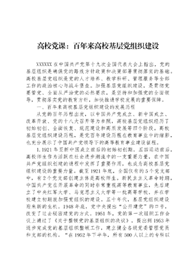 高校党课:百年来高校基层党组织建设XXXXXX在中国共产党第十九次全国代表大会上指出,党的基层组织是确保党的路线方针政策和决策部署贯彻落实的基础。高校基层党组织是党的人才培养、教学科研、管理服务等全部工作的政治核心与战斗堡垒。加强基层党组织建设,是贯彻党要管党、全面从严治党的必然要求,是坚持和加强党的全面领导,贯彻落实党的教育方针,加快推进学校发展的重要保障。一、百年来高校基层党组织建设的发展历程从党的百年历程出发,以中国共产党成立、新中国成立、改革开放、党的十八大召开等为参照,高校基层党组织经历了初始初创、全面恢复、规范建设和高质发展等四个阶段。高校基层党组织建设历程,是党百年建设历程在教育事业中的缩影,也充分展示了中国共产党领导下的高等教育事业建设征程。1.1921年至新中国成立前后的初始初创期。五四运动前后,高校师生作为活跃在社会进步潮流中的一支重要力量,在中国共产党组织创建的进程中发挥了重要作用,也成为高校基层党组织建设的重要力量。截至1921年底,全国仅有的5个党支部中,有2个党支部创建主体是高校师生。新民主主义革命时期,中国共产党在开展革命的同时非常重视高等教育事业,先后建立了中央红军大学、马克思主义大学等一批高等学校,并在学校建立初期就加强党组织的建设。五十年代,基层党组织建设迎来新的生机。1948年底,党中央提出公开建党的口号,改变了过去秘密建党的方式。1951年,党的第一次组织工作会议上通过了《关于整顿党的基层组织的决议》,提出到1953年逐步完成党的基层组织整顿工作,建立健全各级党委管理党员和支部的机构。在1952年下半年,所有500人以上的专科以上的学校都有了党的基层组织。截至1953年6月,全国基层党支部的数量已达近33万个,全国各大中专院校都设立了党组织。1956年,中共八大通过了《中国共产党章程》,这是中国共产党执政以后制定的第一部党章,将七大党章中的基础组织调整修订为基层组织,范围上由党的支部是党的基础组织拓展为基层党委、总支部和支部,明确规定基层党组织对本单位起领导作用,并对党的基层组织的权利义务、党员标准等作了明确规定。这是党的基层组织这一概念在党章中的第一次使用,体现了基层组织的本质特征和地位作用。六十年代,随着党中央教育方针的变化调整,高校党组织建设经历着波折与动荡,也经历了转变与发展。1958年,中共中央、国务院颁布《关于教育工作的指示》指出,在高等学校中应该实行学校党委领导下的校务委员会负责制。这是高校党的领导由五十年代初的党委成员以行政负责人的身份贯彻党的方针政策,党组织不直接领导行政的校长负责制,向党在高校的领导地位逐渐确立的重大转变。此后,高校在党委领导下明确党政分工,建立学生政工干部队伍,同时逐步开设马克思主义理论课、开展劳动、军训等加强学生思政教育。在1961年中共中央批准试行的《中华人民共和国教育部直属高等学校暂行工作条例(草案)》(简称高教六十条)中,确立了党的领导在高校的地位,促进了高校党建与中心工作的有效结合。此外,高教六十条中第五十五、五十六条分别对系党总支、教工和学生党支部的设置和主要任务进行了明确,成为高校基层党建的重要遵循。2.改革开放前后的全面恢复期。党的十一届三中全会的召开开启了改革开放和社会主义现代化的伟大征程。这一时期,随着对教育战线整顿工作的开展,高校领导体制及班子建设日趋加强,党的建设和思想政治教育工作也日趋加强,在高校知识分子和大学生中发展党员的力度逐渐加大,高校党组织建设工作进入全面恢复时期。1978年,国务院转发教育部《关于恢复和办好全国重点高等学校的报告》,报告涵盖了高校领导体制、加强师资队伍建设、加强党的建设等方面,对加强高校党的领导、促进高校党组织建设起到了非常重要的推动作用。同年10月,教育部发布《全国重点高等学校暂行工作条例(试行草案)》,将高校领导体制由以党委领导下的校长为首的校务委员会负责制,改为党委领导下的校长分工负责制。1985年颁布的《中共中央关于教育体制改革的决定》规定,学校逐步实行校长负责制,学校中的党组织要从过去那种包揽一切的状态中解脱出来,把自己的精力集中到加强党的建设和加强思想政治工作上来。党在高校的核心地位重新确立起来。这一时期,党和国家还尤其重视在知识分子中发展共产党员,纠正了对知识分子左的看法,持续促进高校基层党组织发展。1989年后,针对高校党的领导淡化、思想政治工作软化等错误倾向,党中央采取了一系列重大举措加强高校党的建设。1989年6月至7月,国家教委先后召开部分高校党委书记座谈会及全国暑期高校工作会议,确定每年召开一次全国高等学校党建工作会议,把思想政治建设放在首位,使高校成为社会主义的坚强阵地。同年8月,党中央下发《关于加强党的建设的通知